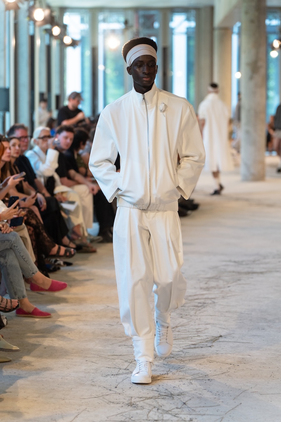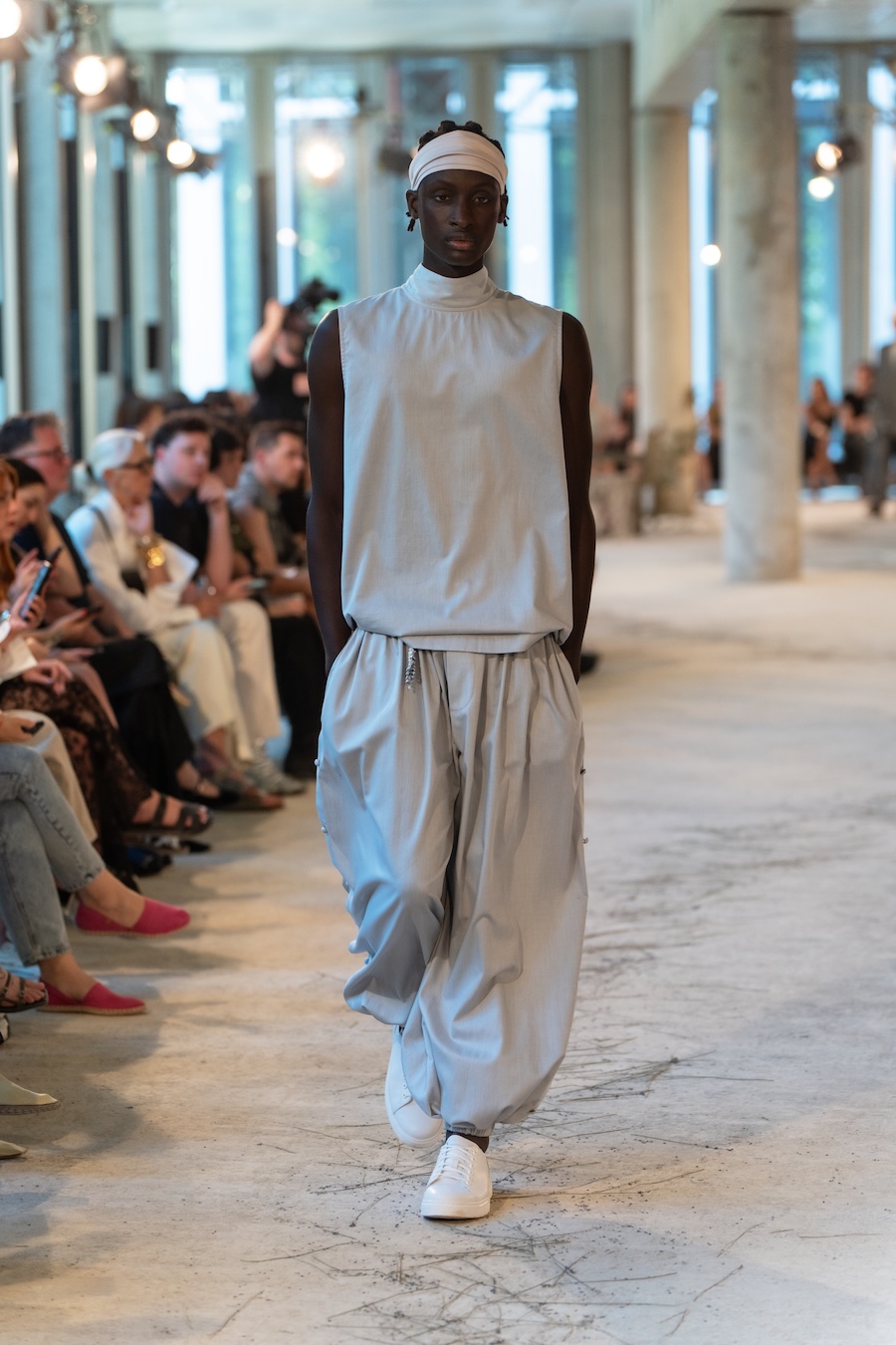 - The Light – This movement marks a jubilant emergence from the shadows. Structure loosens, yielding to volume and a newfound ease. Inspired by the elegant silhouettes of the Renaissance and the relaxed aesthetic of streetwear’s heyday, cotton/viscose denim in shades of white, pigeon blue, and soft rosé dances with delicate milles-fleurs prints and semi-transparent checks. Here, the body is celebrated in all its glory.