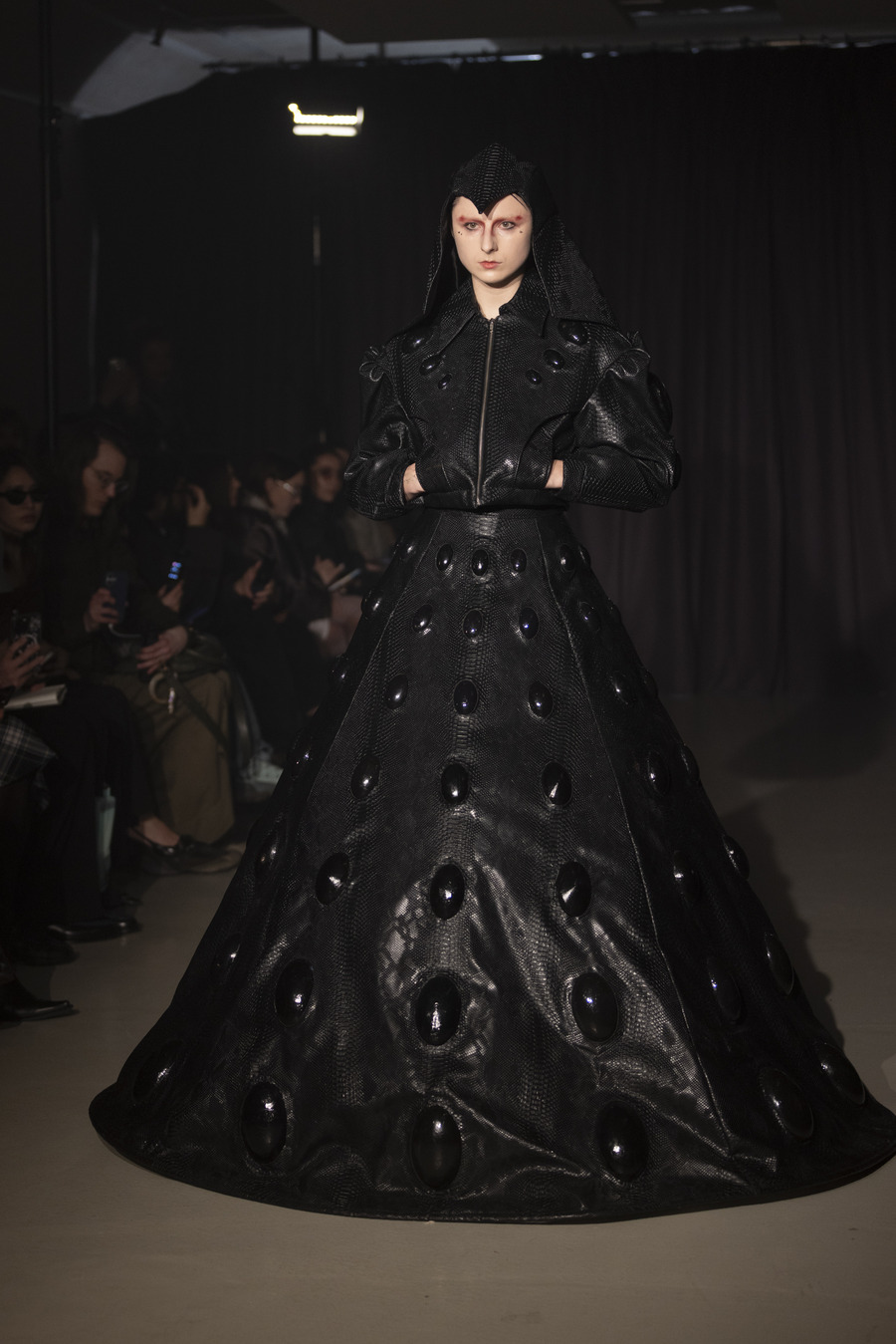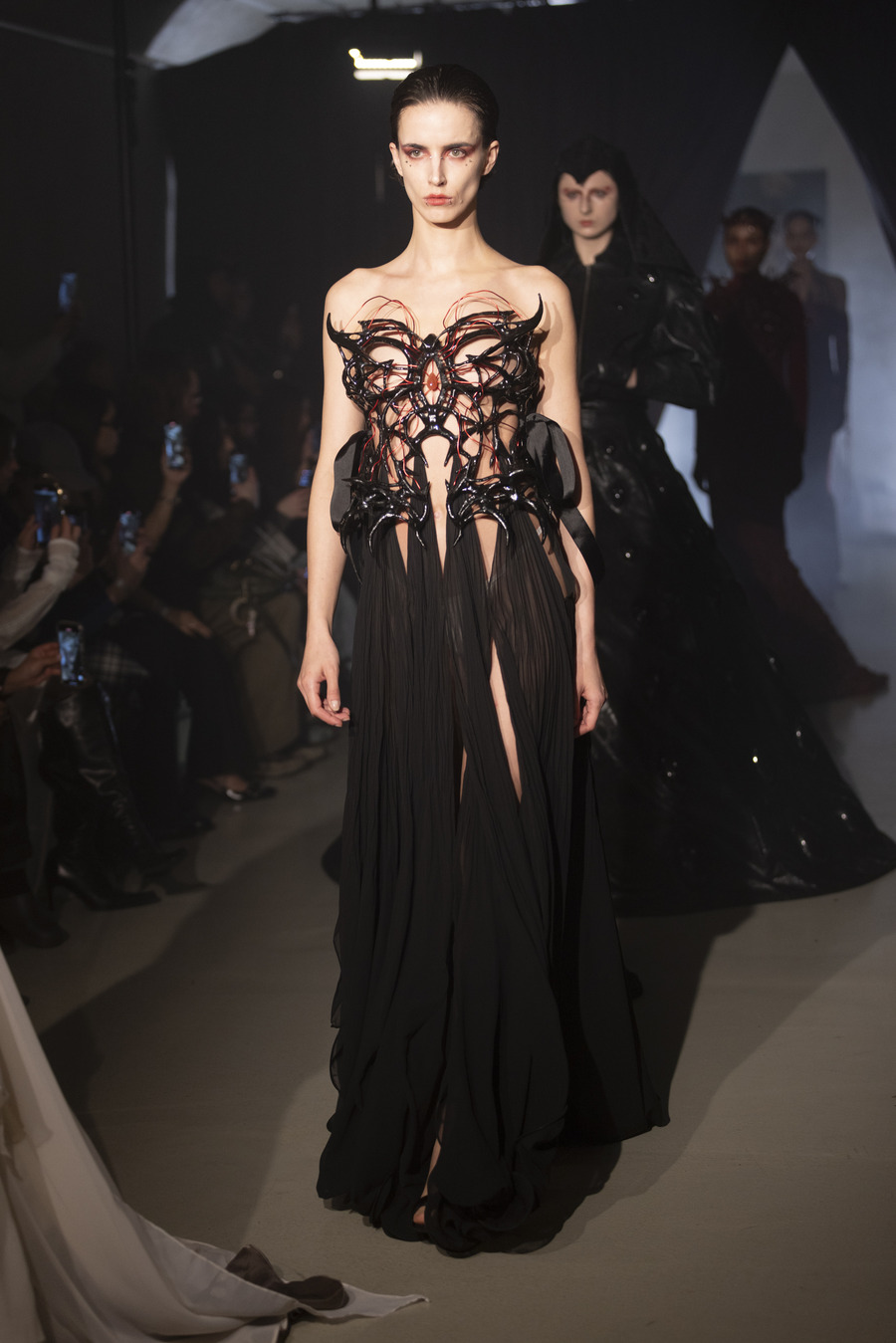 The collection’s palette is a deliberate play on emotions, with stark blacks and whites symbolizing loss and hope, tender nude tones emphasizing vulnerability and connection, and deep reds that evoke the visceral scars of violence. Marlon brilliantly blends innovative materials—think latex and intricate 3D elements—with classic fabrics like silk and chiffon, creating a dialogue that blurs the line between fragility and bold innovation. Transformative silhouettes push against the conventions of fashion, merging sculptural art forms with haute couture elegance.