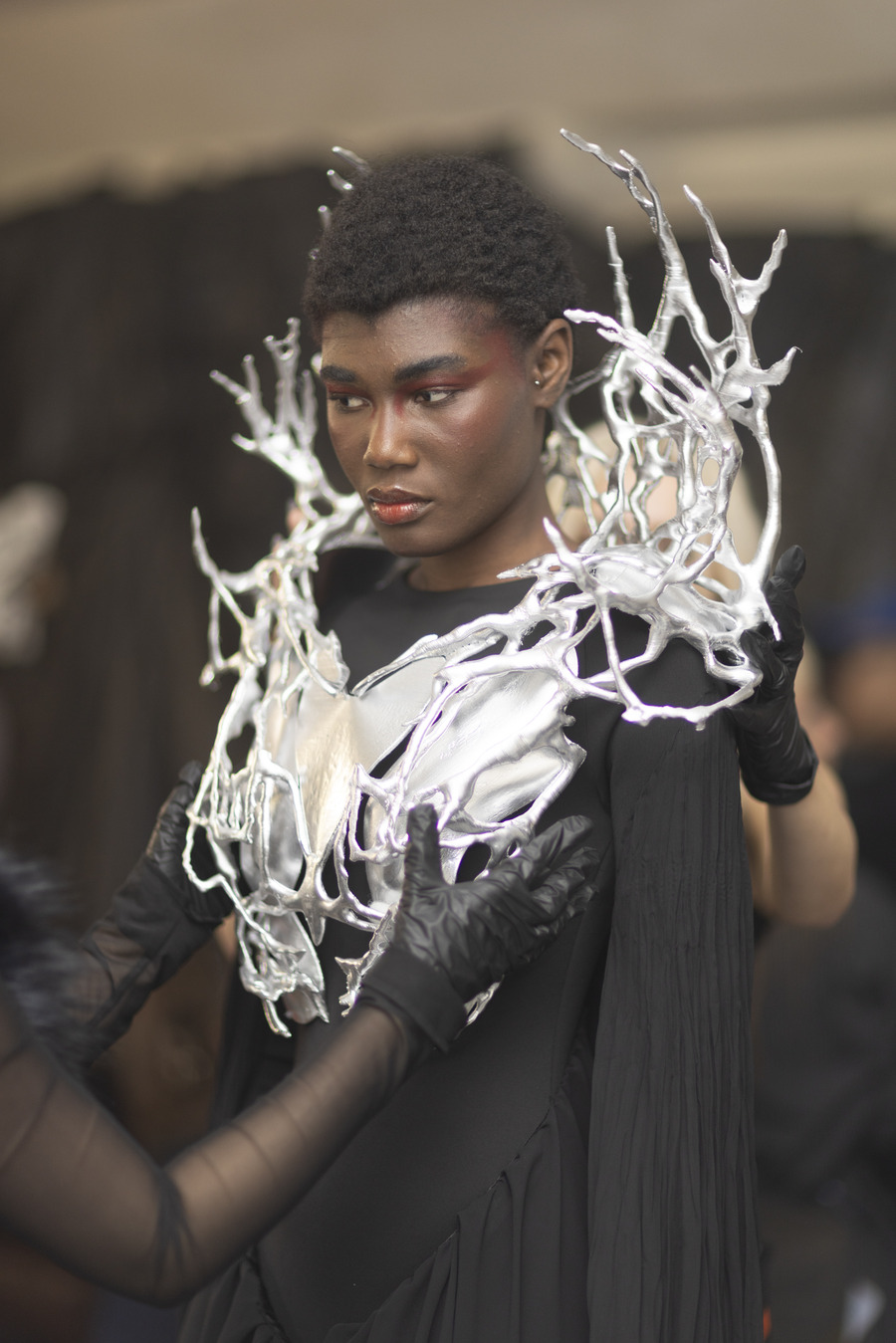 Captured beautifully by photographer Indigo Lewisohn, who took us backstage for an exclusive glimpse into the creative process, the collection unfolded as a striking exploration of trauma and hope. Each piece served as a powerful narrative woven from the dualities of decay and rebirth, inviting us to witness the enduring strength of the human spirit.