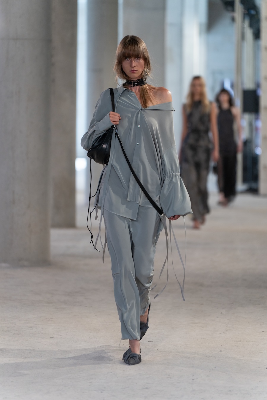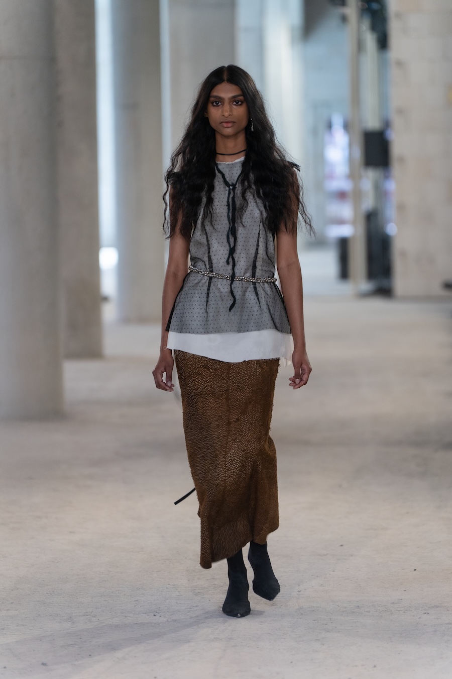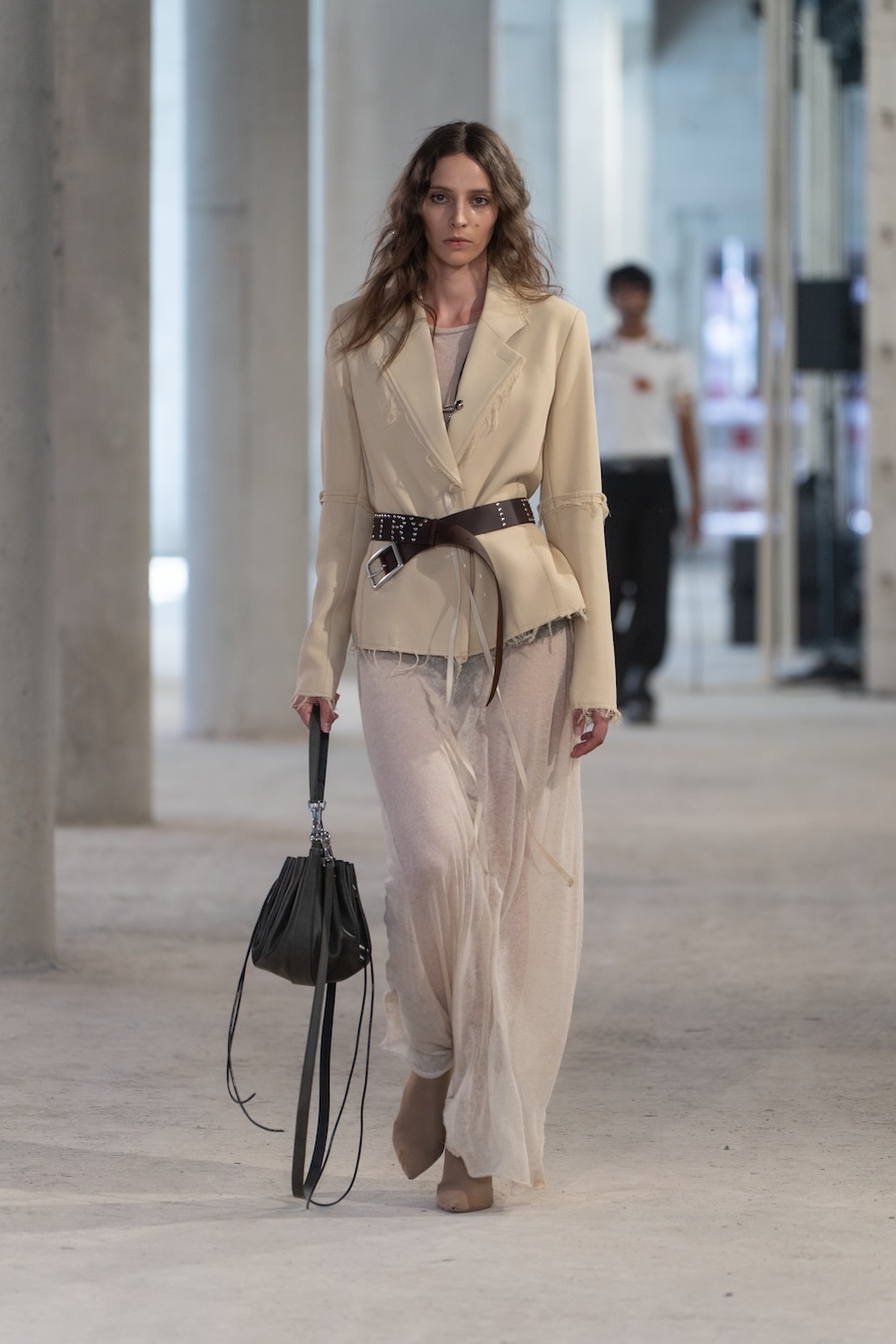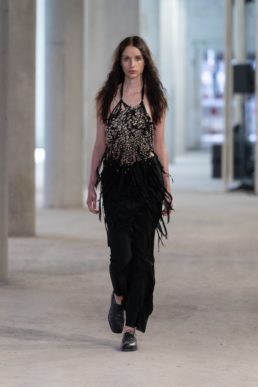 The collection boasts refined tailoring interlaced with raw details, prioritising elongated silhouettes and ethereal floating cuts that evoke a unique overall ambience. Adorned with fine silver bells, the models’ elegant strides resonate with a delightful chime, complemented by whimsical accessories such as daisy-chain necklaces, embroidered handbags, and knotted tops, all showcasing cascading bells.