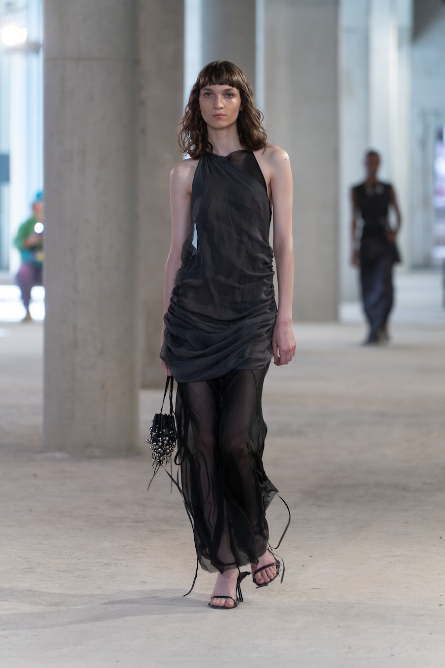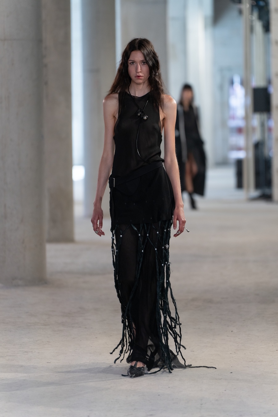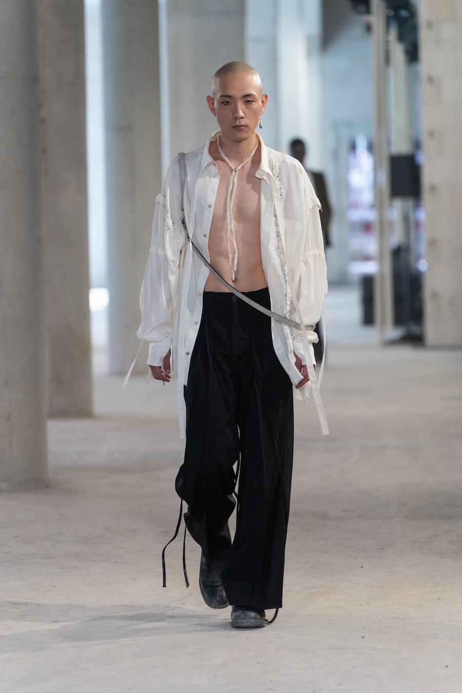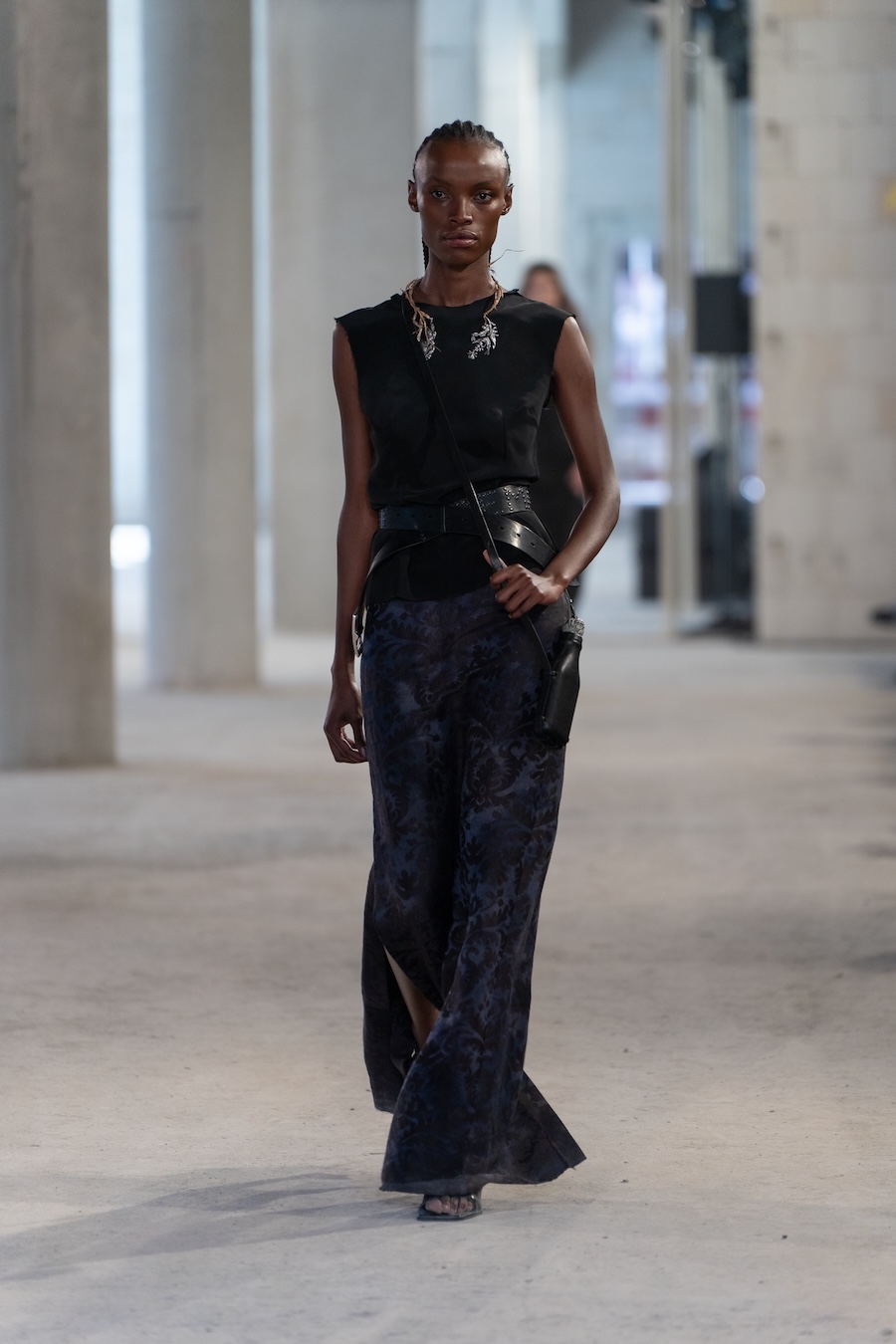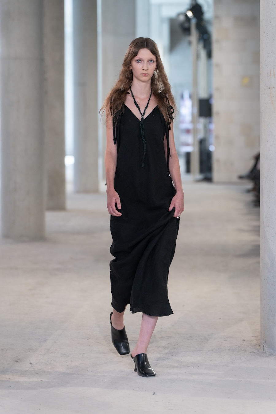 The collection boasts refined tailoring interlaced with raw details, prioritising elongated silhouettes and ethereal floating cuts that evoke a unique overall ambience. Adorned with fine silver bells, the models’ elegant strides resonate with a delightful chime, complemented by whimsical accessories such as daisy-chain necklaces, embroidered handbags, and knotted tops, all showcasing cascading bells.