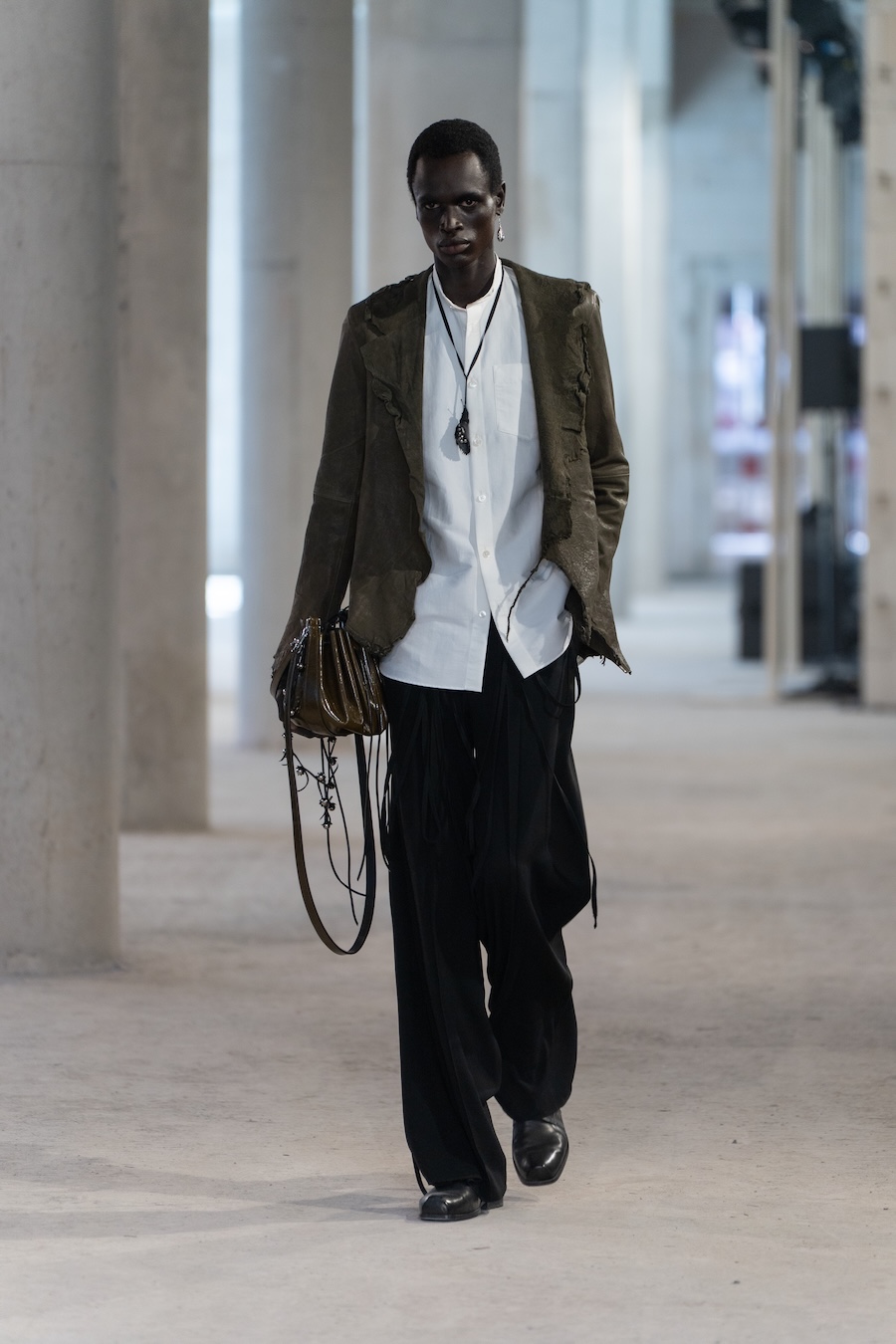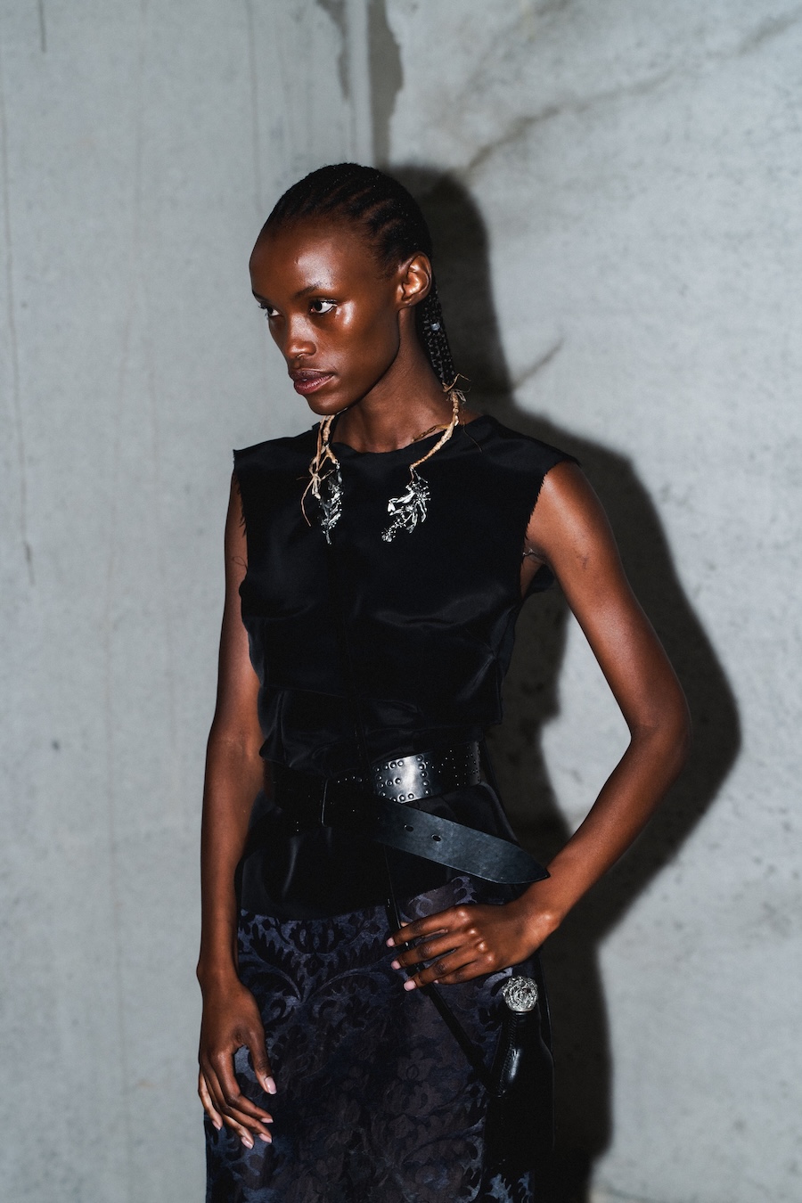 Every detail tells a story, such as the embossed bird rings that subtly weave through the collection, evoking the companionship of nature. Leather accessories take centre stage, exploring softer shapes that range from deep blacks to mossy, almost wet appearances. Minuscule accessories and draped belts bear studded anagrams of artist and poet Eva Weinkötz, accentuating the connection to craftsmanship and artistry.