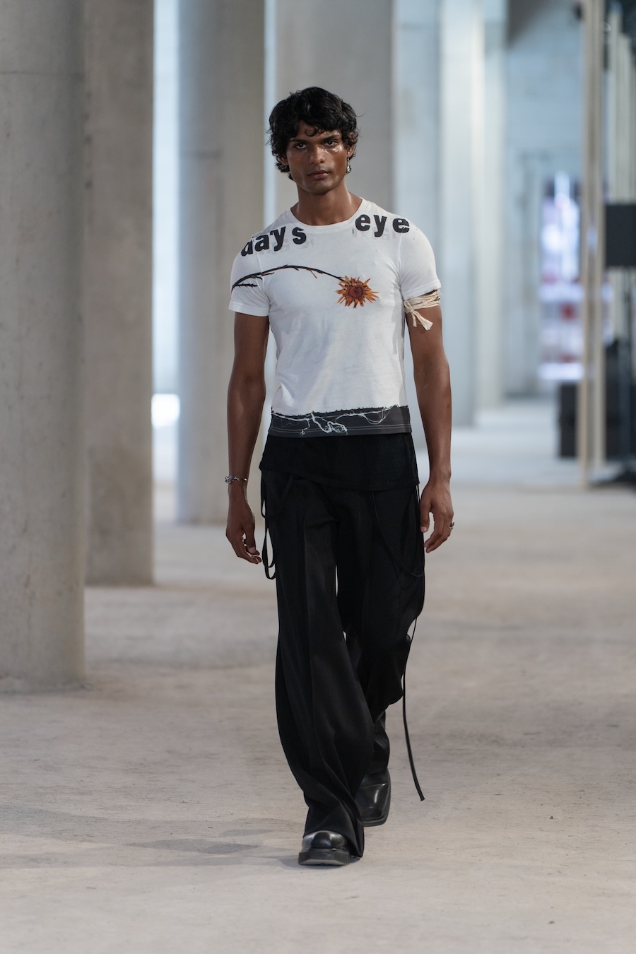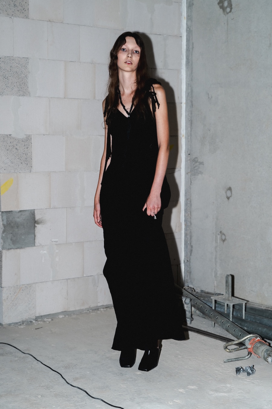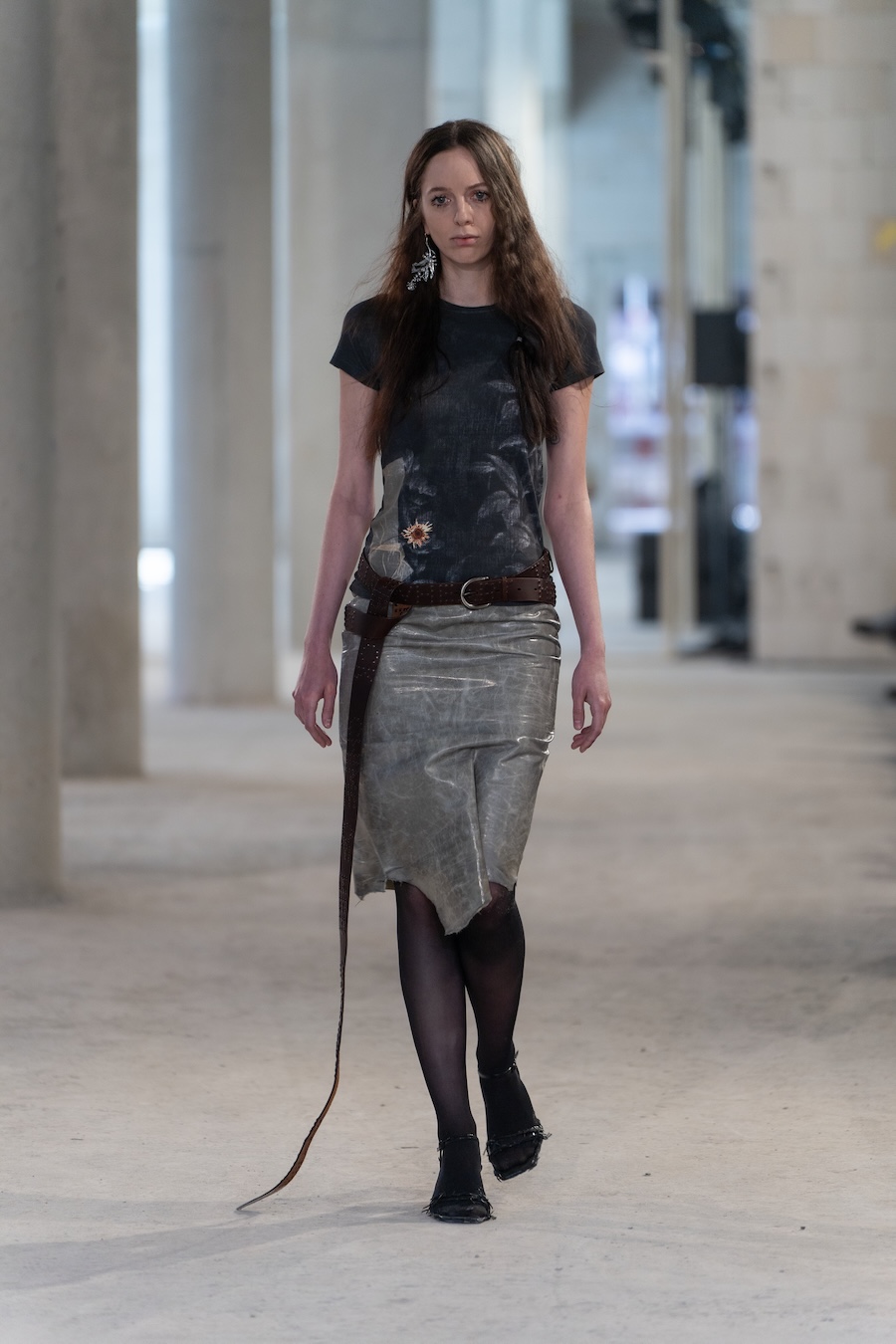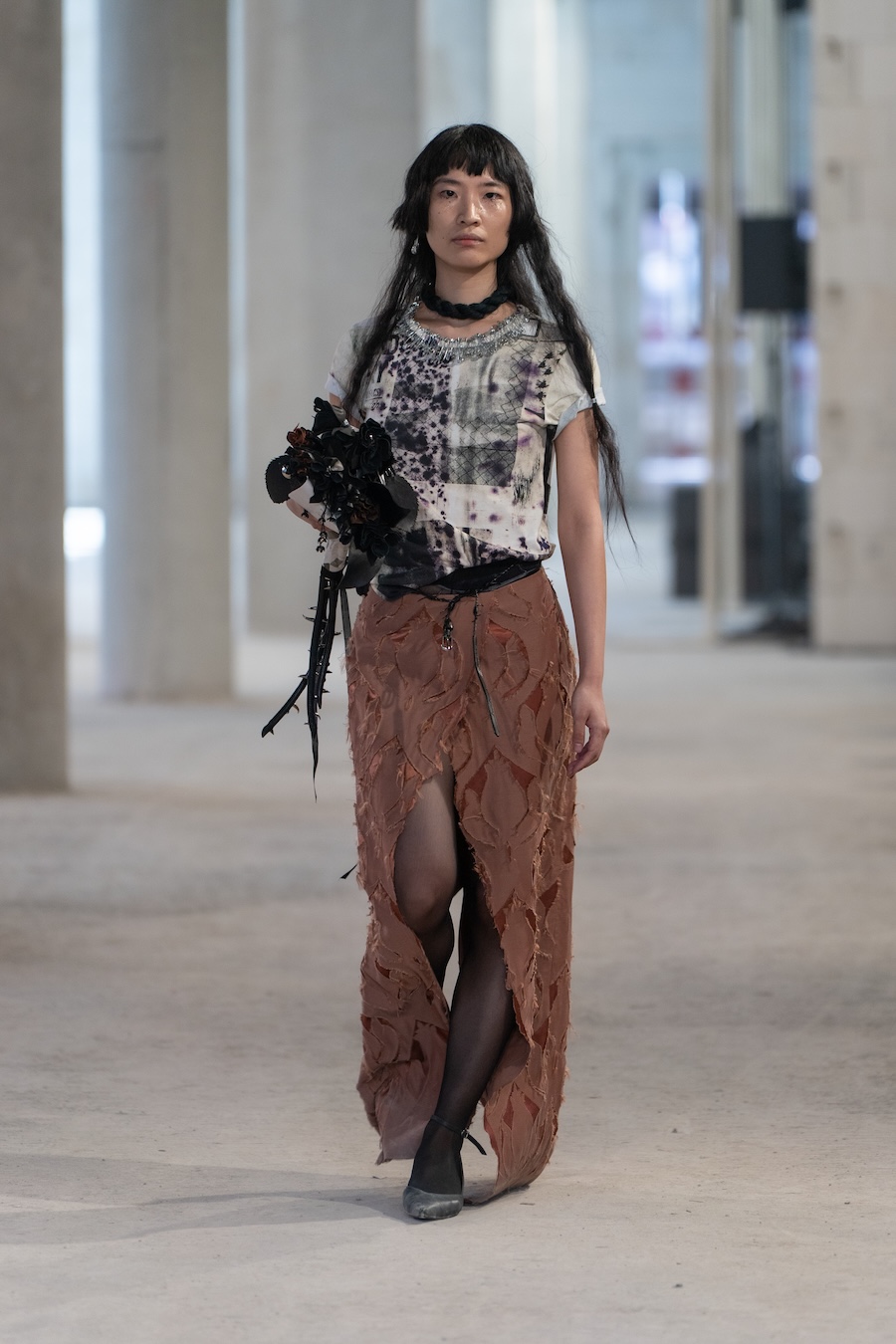 Inspired by their Belgian roots, the design language reflects a palette of dark, mystic tones, predominantly black and silver, sprinkled with warm browns, copper accents, and soft whites and greens, set against layers of dark silks. Flower prints emerge in a vintage manner, reminiscent of cherished pieces from grandmother’s wardrobe. The collection’s signature motif, the rural poetic punk, is represented through slashed and frayed fabrics showcasing intricate botanical patterns, cut open to reveal their deeper, often dangerous narratives.