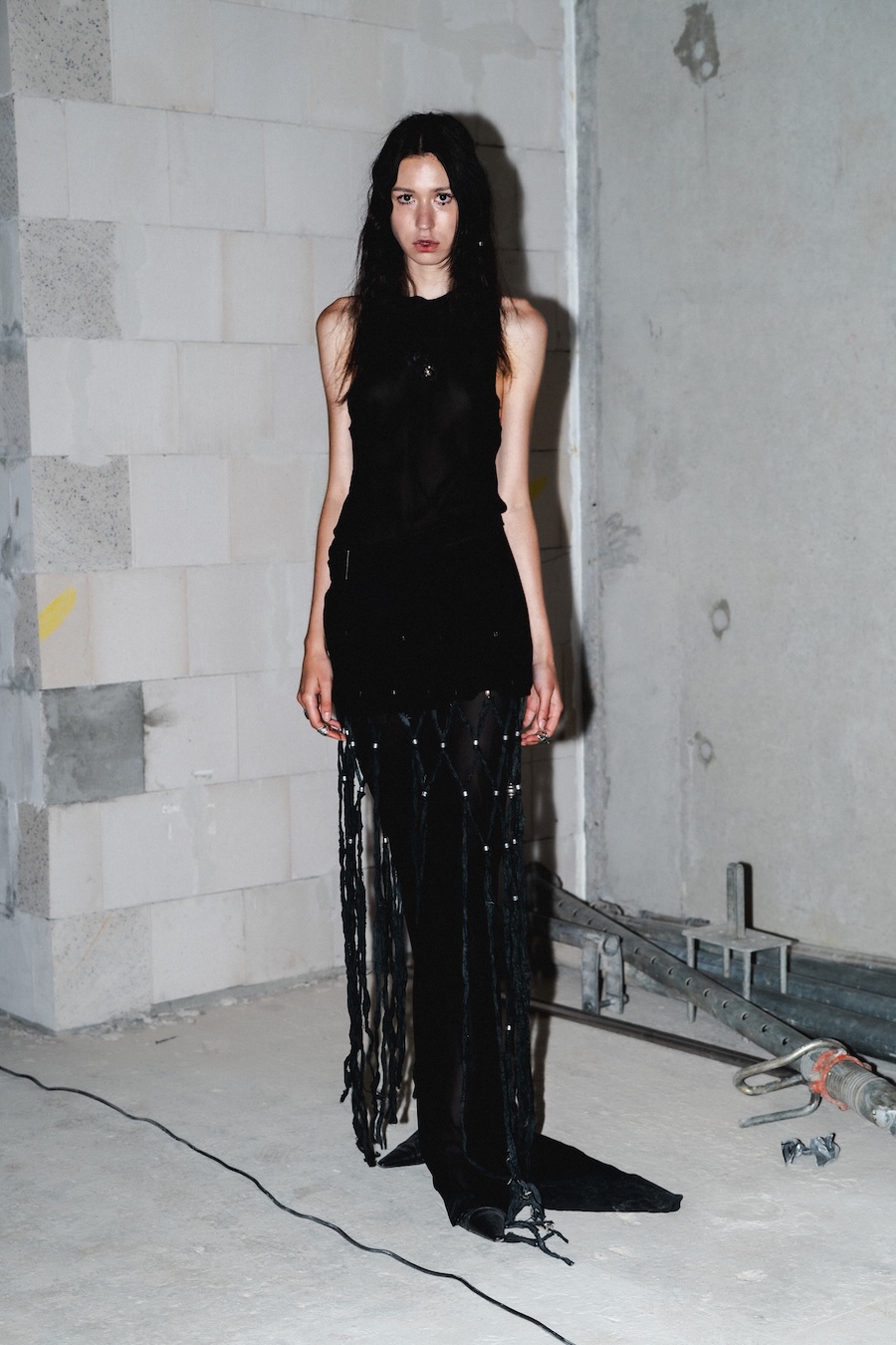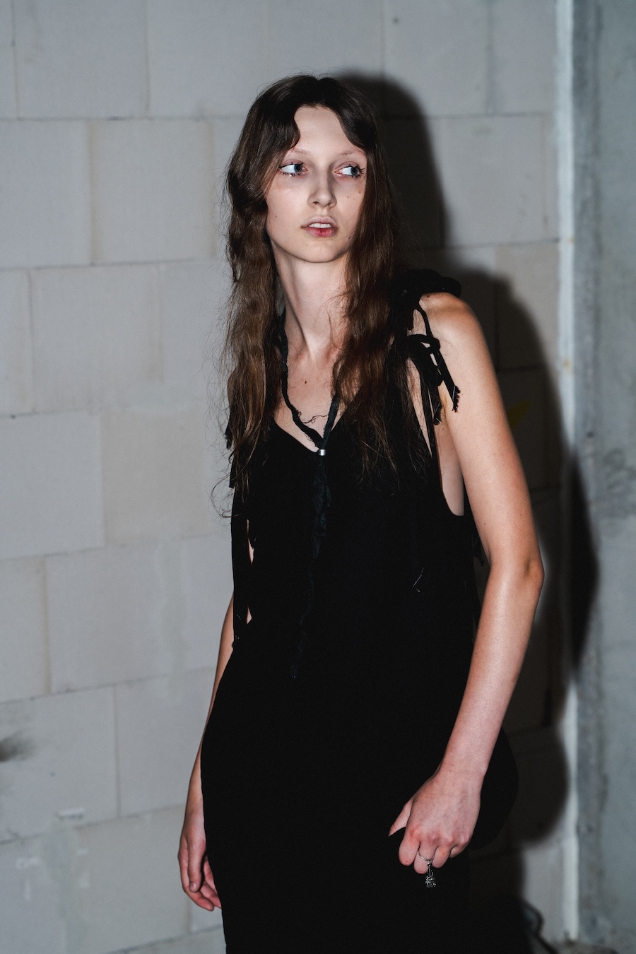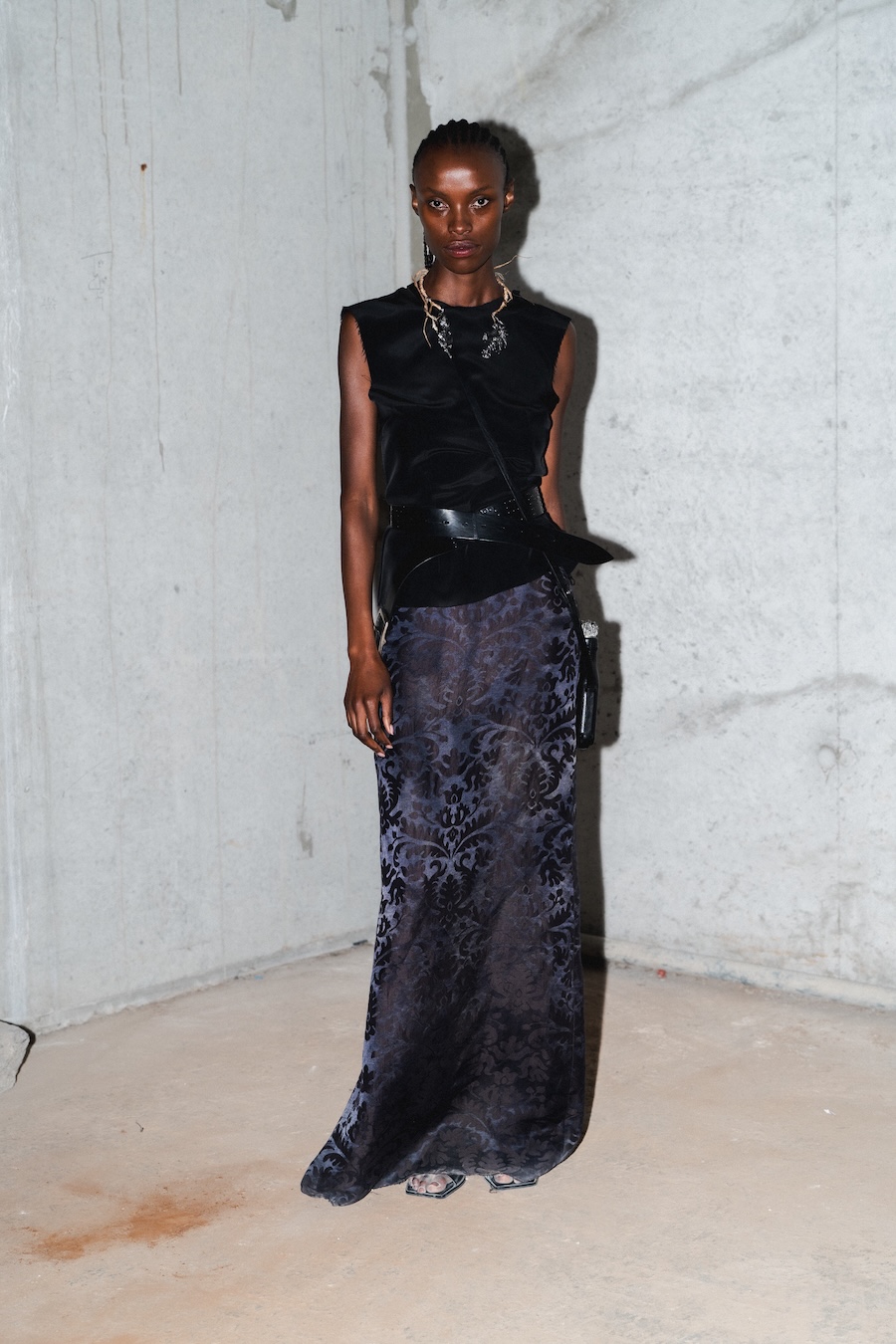 Inspired by their Belgian roots, the design language reflects a palette of dark, mystic tones, predominantly black and silver, sprinkled with warm browns, copper accents, and soft whites and greens, set against layers of dark silks. Flower prints emerge in a vintage manner, reminiscent of cherished pieces from grandmother’s wardrobe. The collection’s signature motif, the rural poetic punk, is represented through slashed and frayed fabrics showcasing intricate botanical patterns, cut open to reveal their deeper, often dangerous narratives.