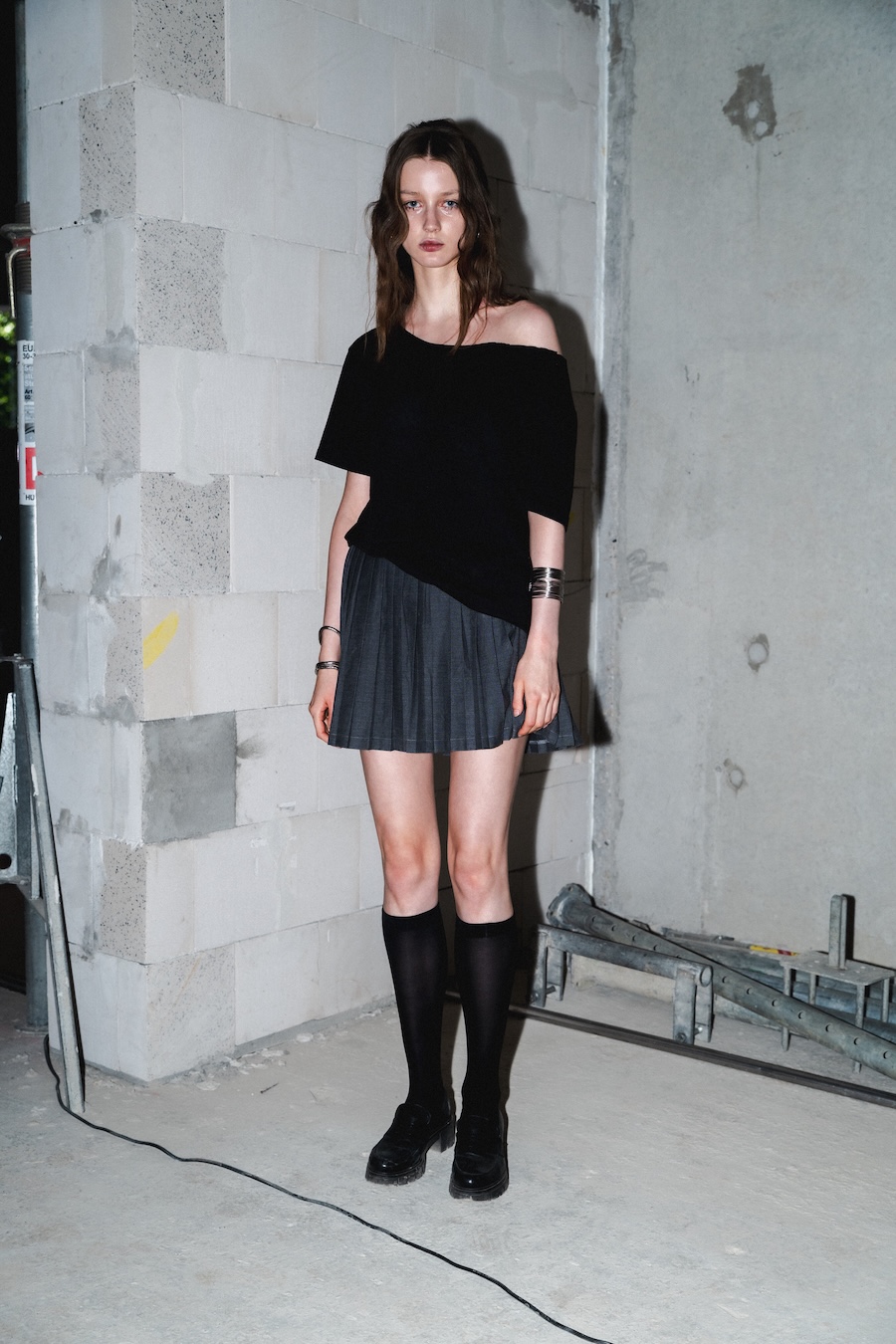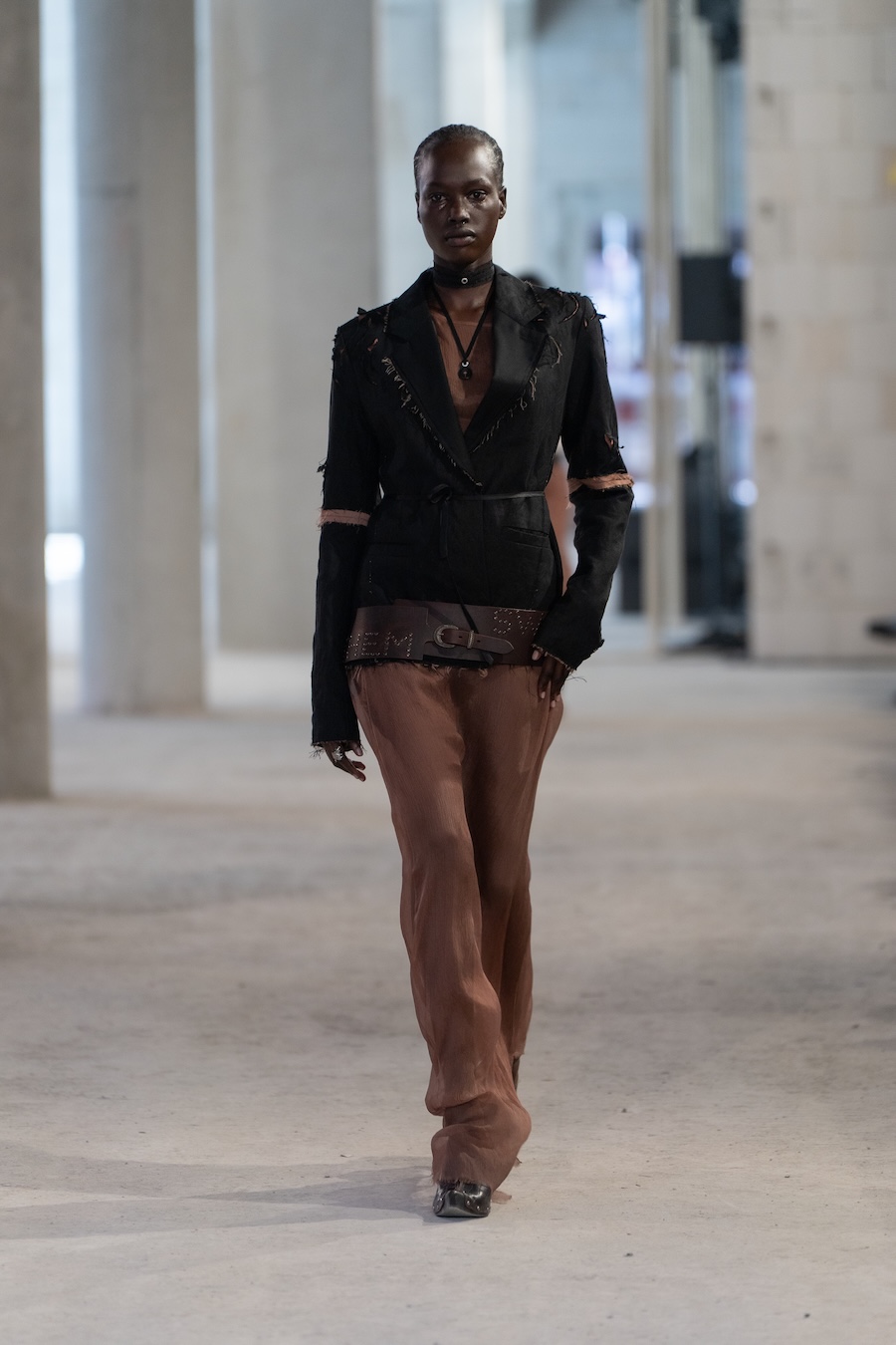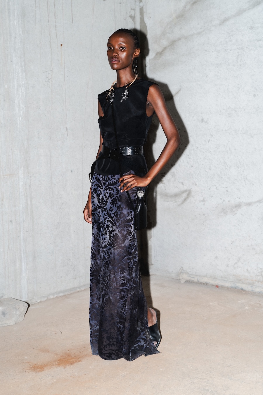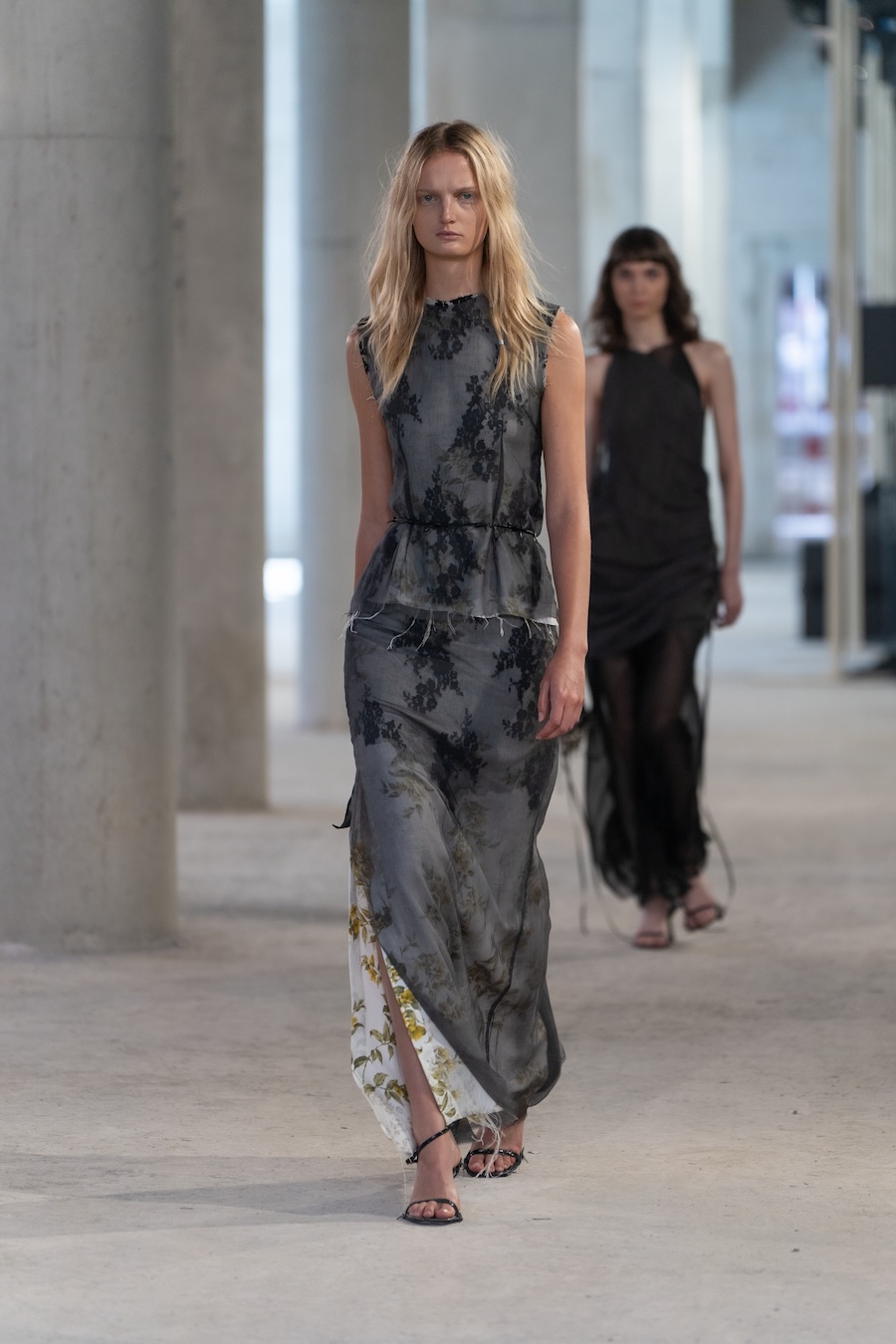 Inspired by their Belgian roots, the design language reflects a palette of dark, mystic tones, predominantly black and silver, sprinkled with warm browns, copper accents, and soft whites and greens, set against layers of dark silks. Flower prints emerge in a vintage manner, reminiscent of cherished pieces from grandmother’s wardrobe. The collection’s signature motif, the rural poetic punk, is represented through slashed and frayed fabrics showcasing intricate botanical patterns, cut open to reveal their deeper, often dangerous narratives.