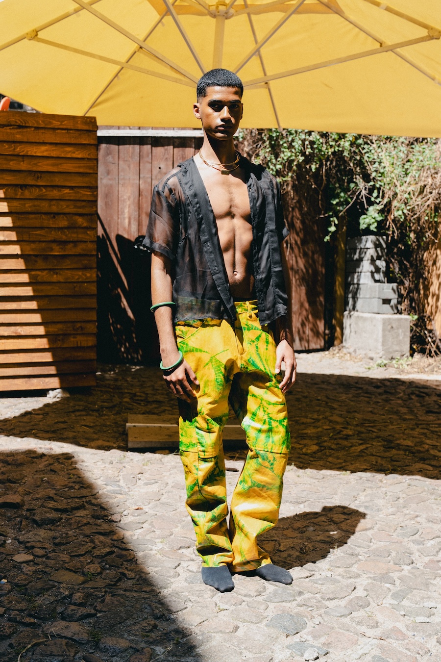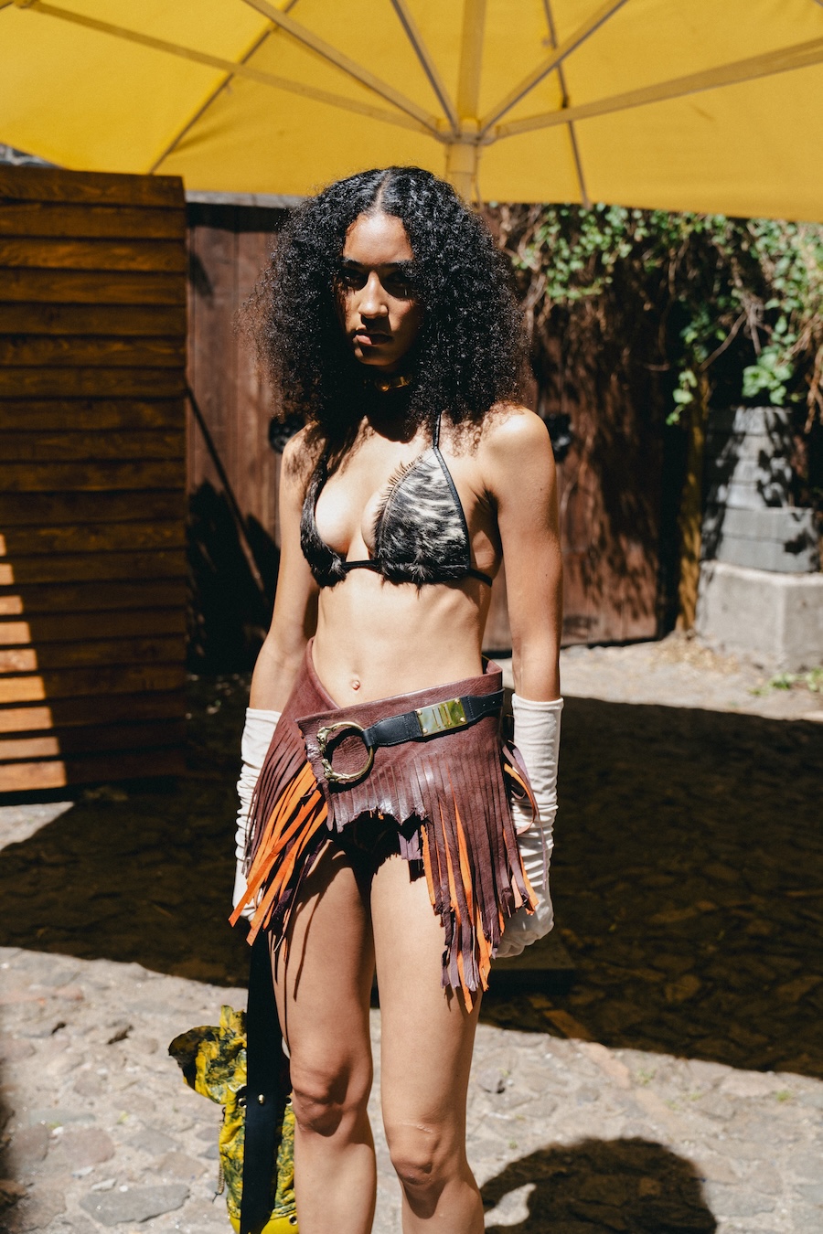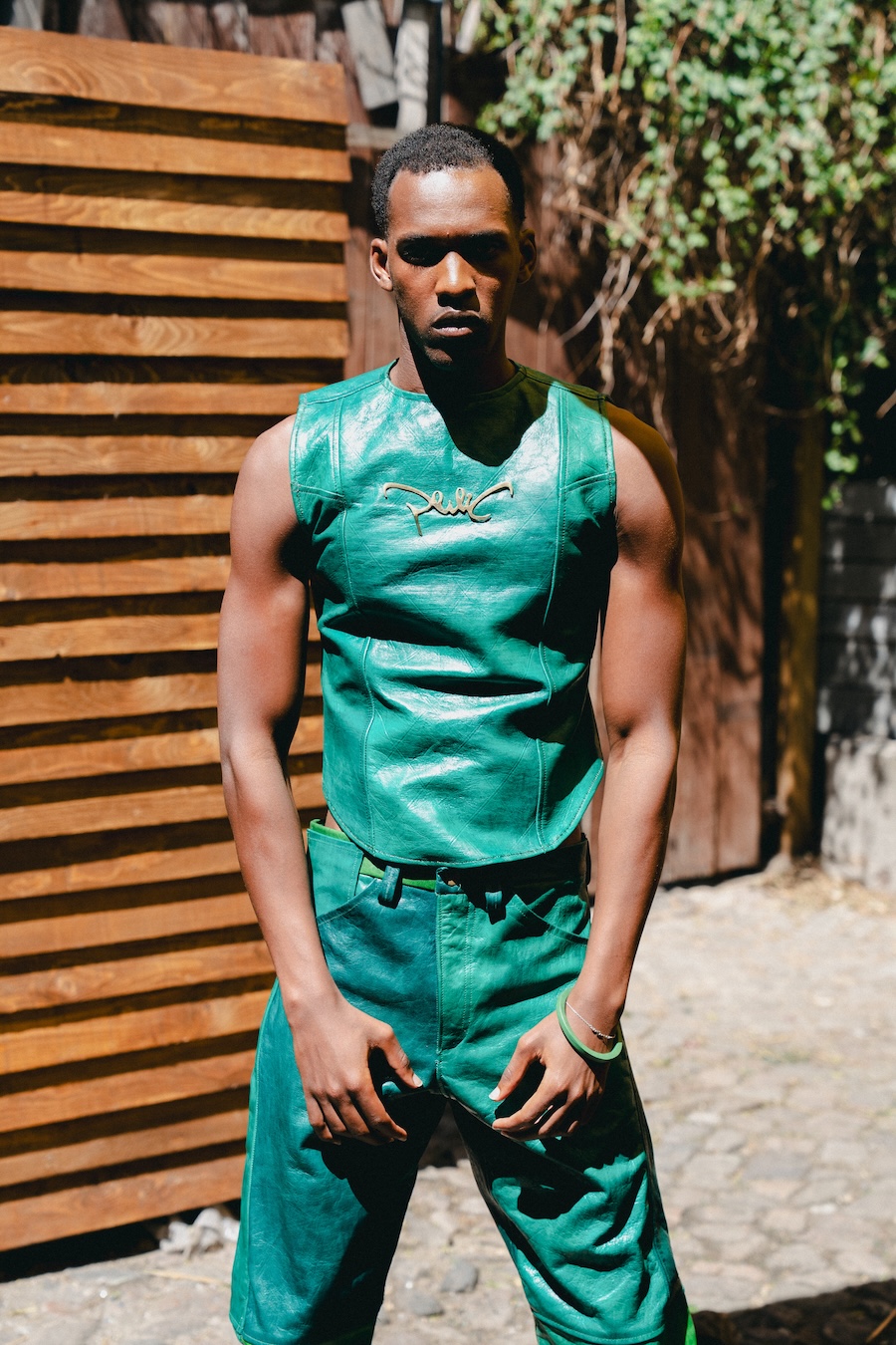 Craftsmanship remains at the core of PALMWINE IceCREAM’s identity. Each piece is meticulously handmade in Ghana, showcasing a deep respect for tradition while embracing innovation. A standout this season is the naturally dyed leather sourced from northern Ghana, meticulously coloured using tree bark and sun-drying techniques honed through generations. We also see the introduction of handwoven cotton, airy organza, and sumptuous deadstock fabrics.