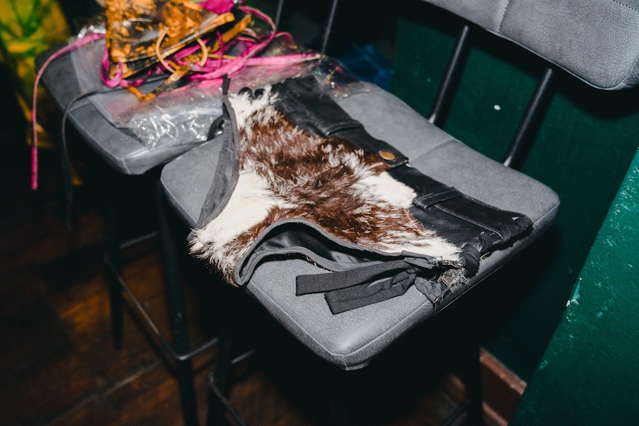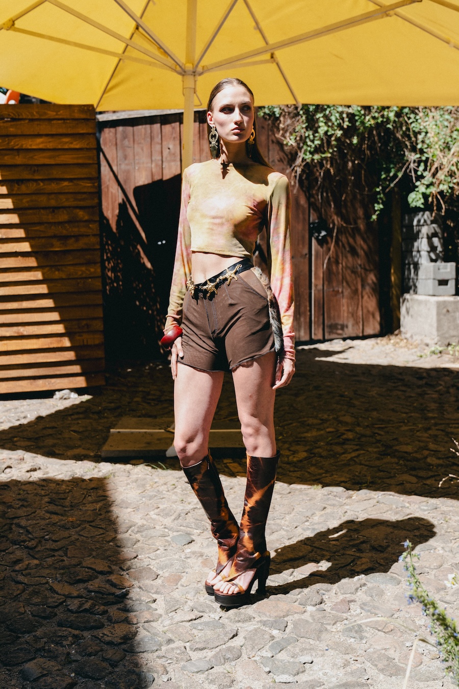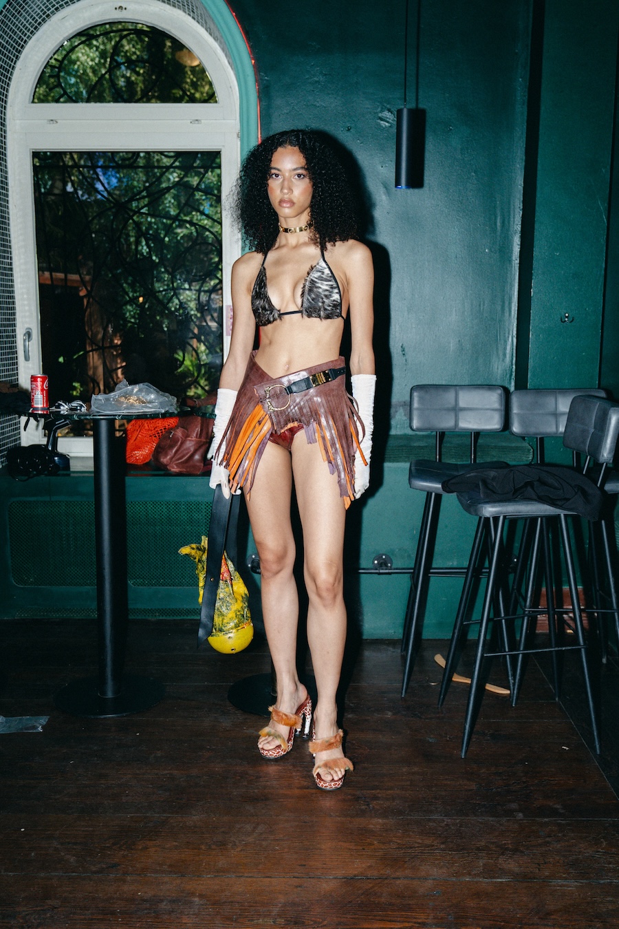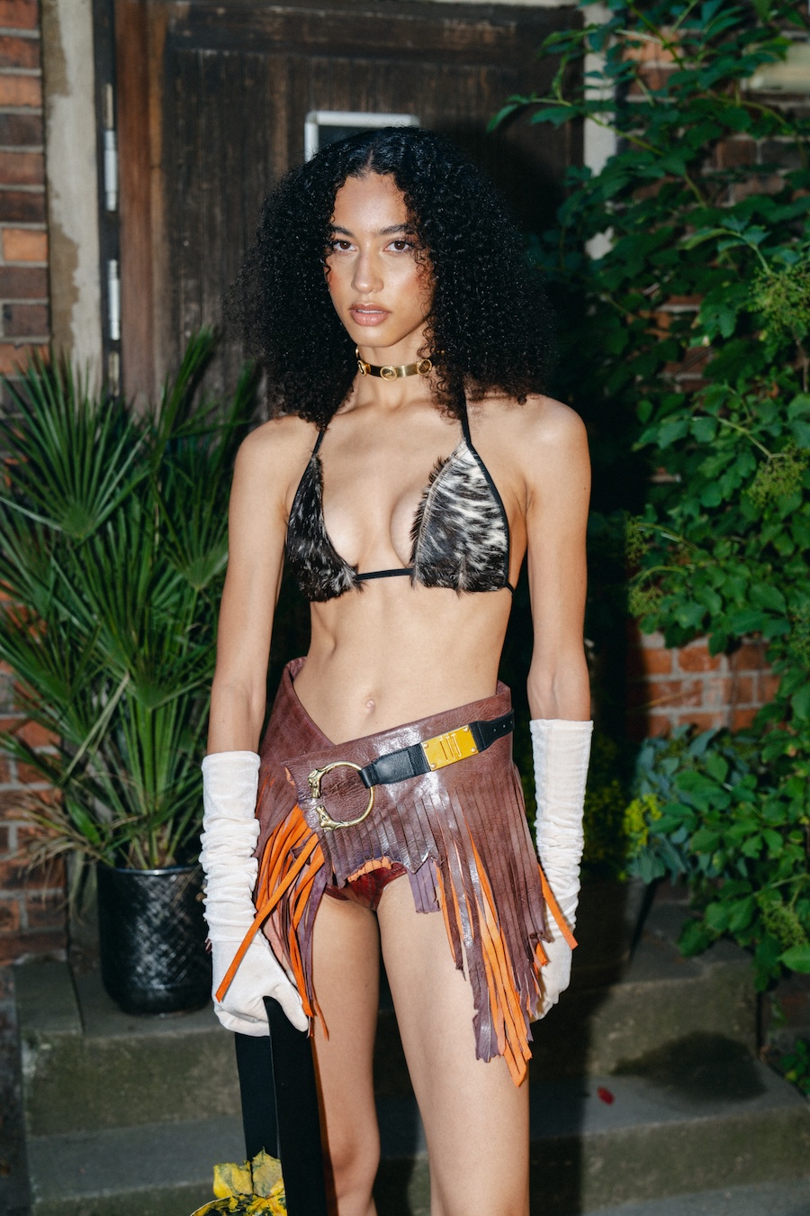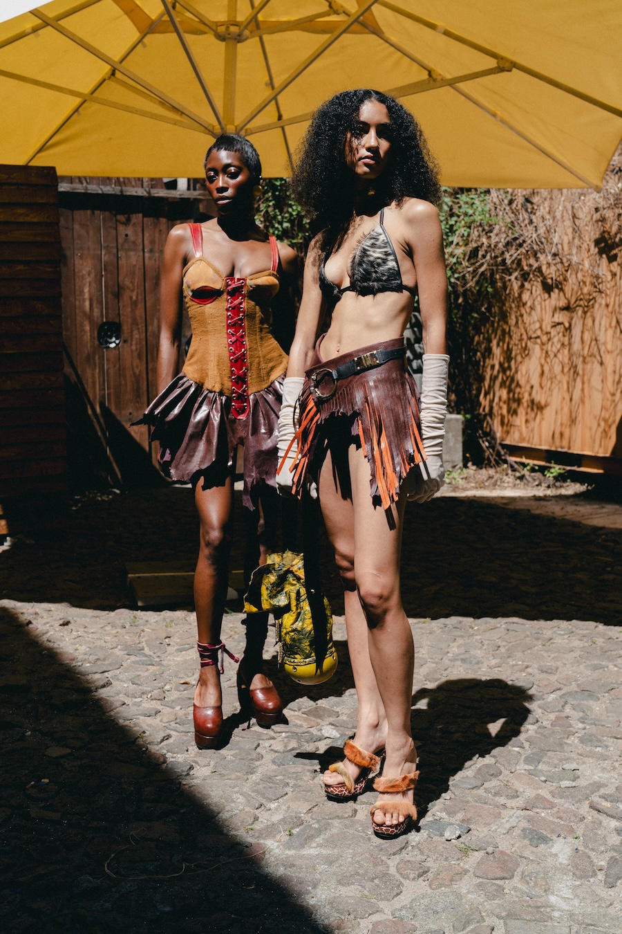 Fashion-forward pieces like a striking chainmail dress and a sculptural leather and mesh ballerina corset, crafted over a meticulous two-day process, capture the essence of the collection. Other highlights include green naturally dyed leather pants and hand-painted giraffe-print boots. This season also redefines accessories, with symbolic earrings depicting figures of women, spoons, and houses, alongside wooden bangles and hand-painted leather bags that add layers of artisanal charm.