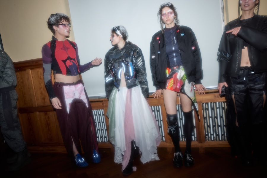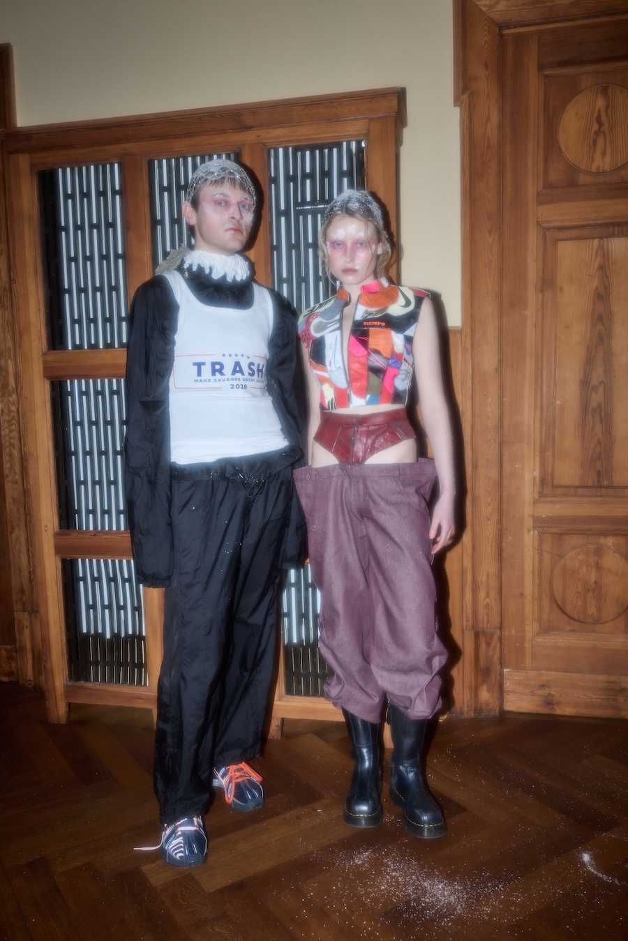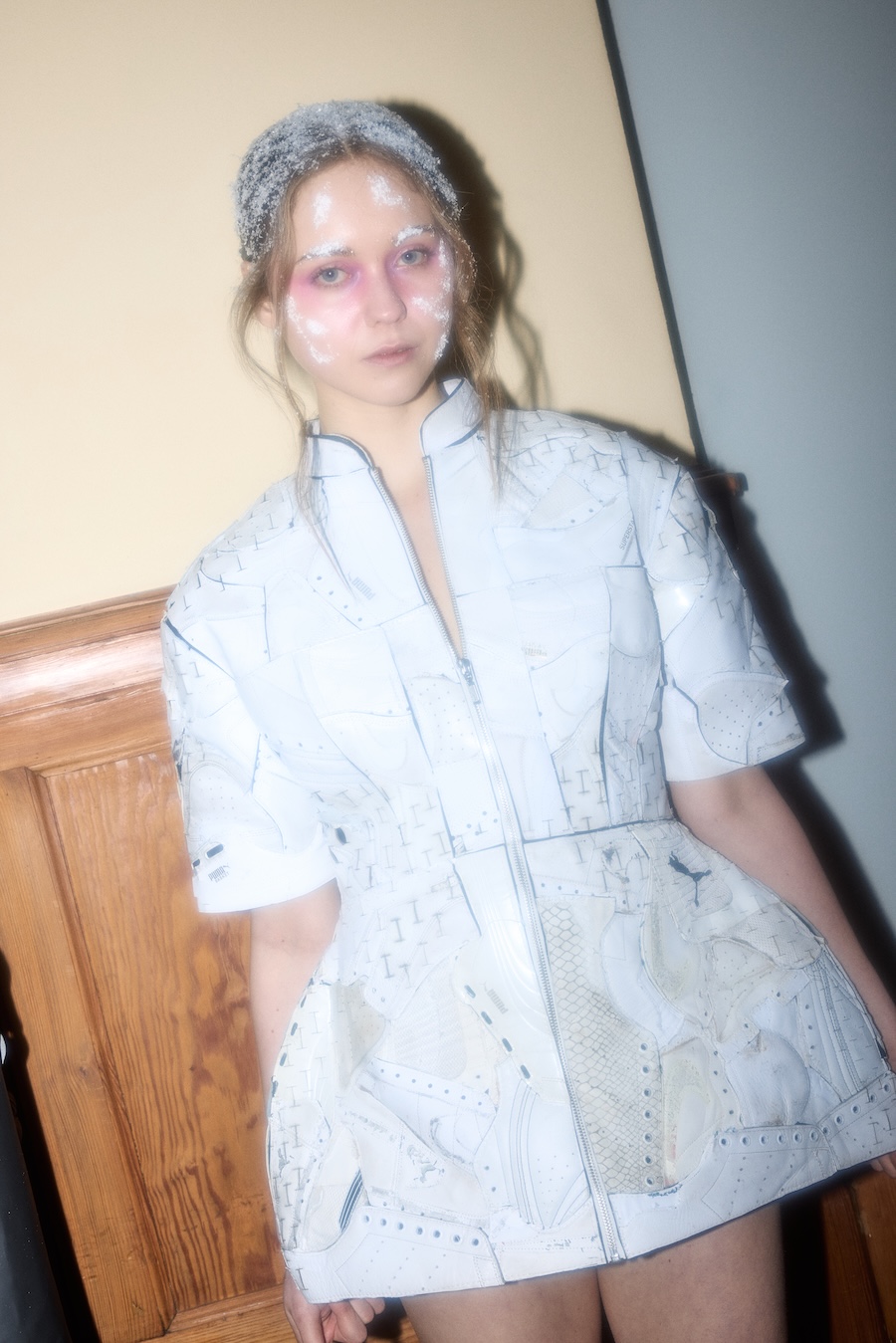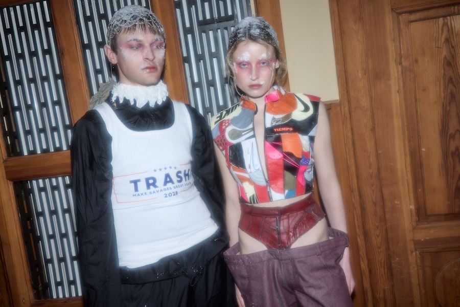Each ICONIC garment is produced through an intensive process that may require up to 80 hours of craftsmanship. This season, the collections repurpose between 500 and 800 pairs of sneakers. While the experimental studio is based in Europe, a significant portion of production is maintained in Ukraine, where development has encountered delays due to the impacts of war, power outages, and security concerns. The collection was presented in a unique hybrid format within a historic Berlin villa, highlighting the dynamic interplay of speed and stillness, tradition and disruption. This juxtaposition reinforces ERROR AS ASSET as both a distinctive fashion statement and a critical commentary on current systems.