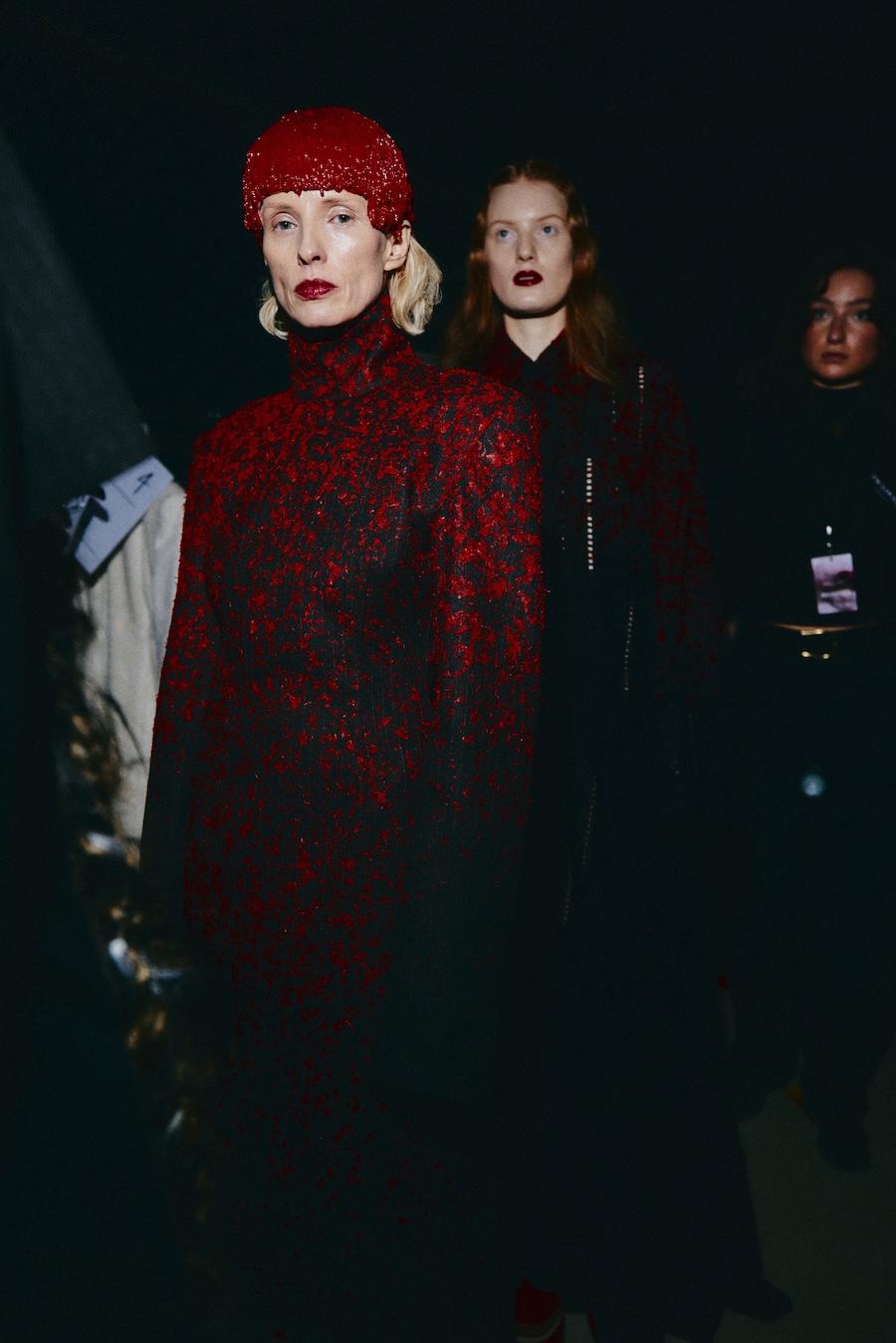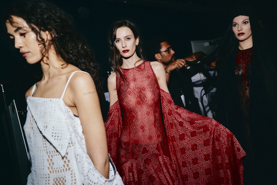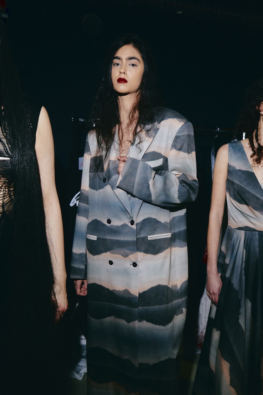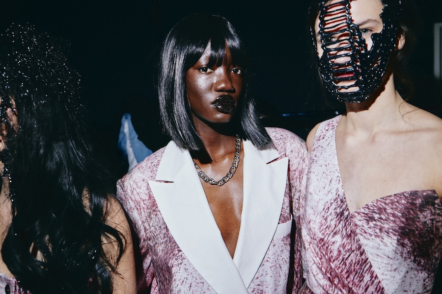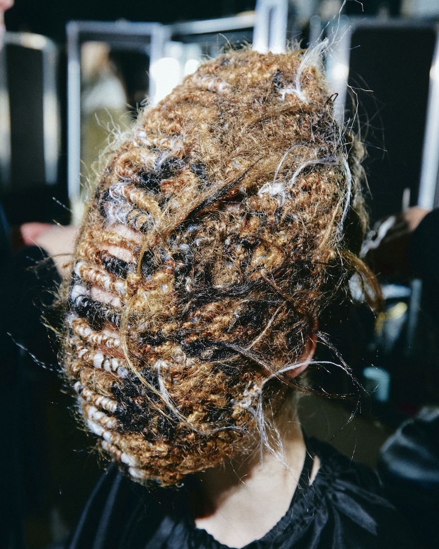 The hairstyling and makeup balance raw, untamed textures with crisp, graphic lines. This concept is rounded off with custom-made sculptural nail designs that resonate with the materials and motifs of the collection, extending the visual narrative throughout every detail.