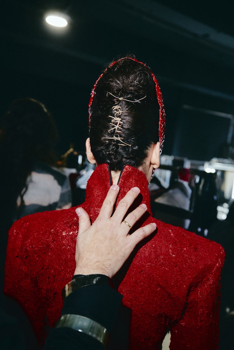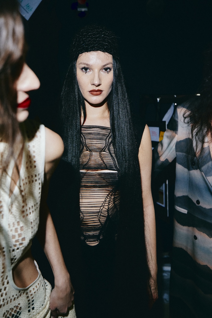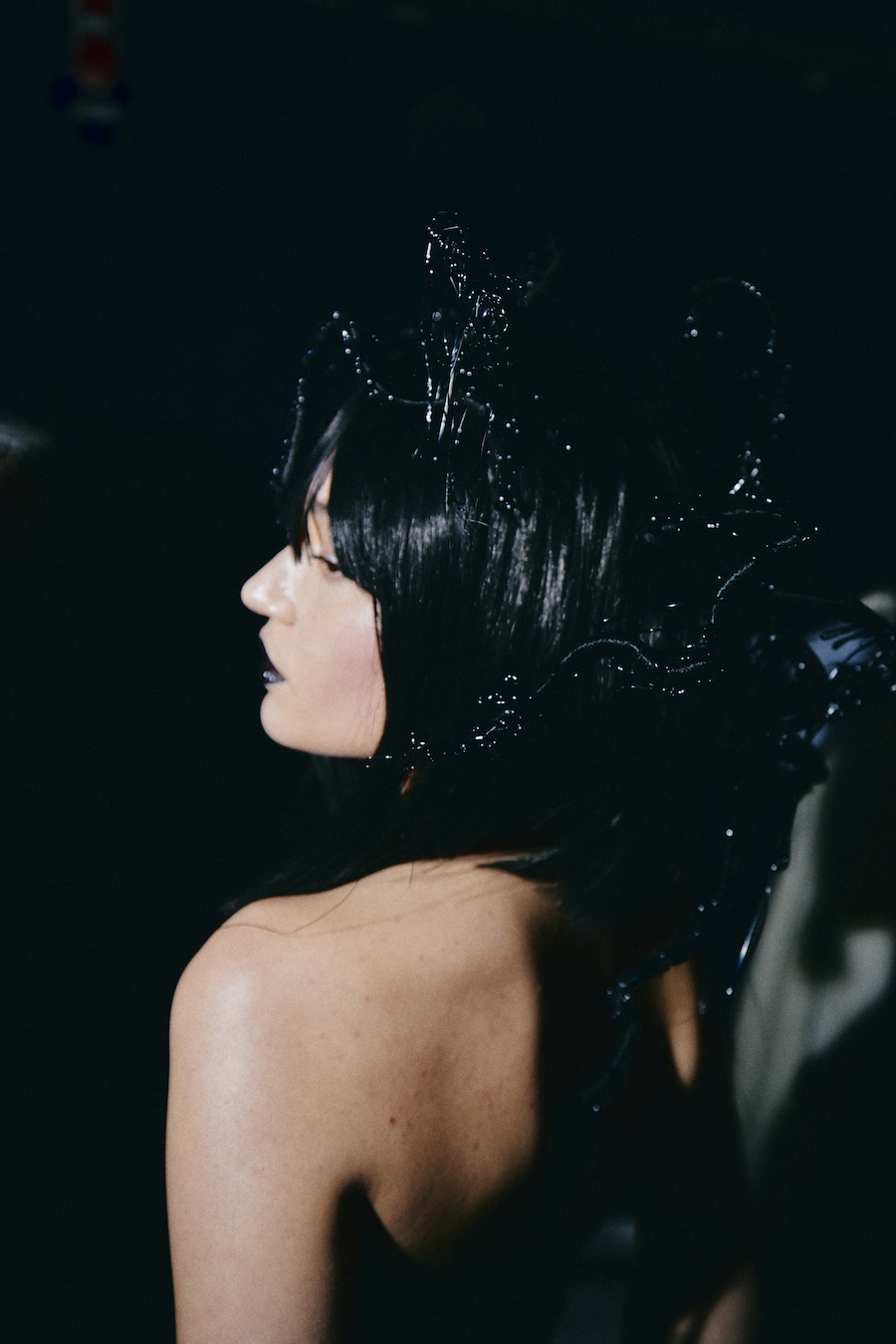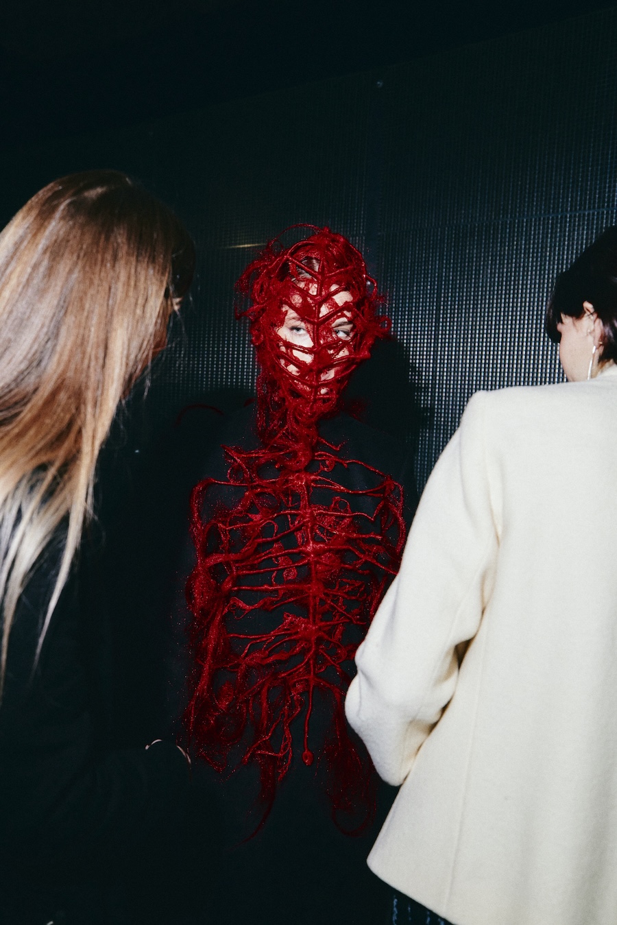 With over 400 hours of meticulous craftsmanship, hair accessories, masks, and braided caps made from vegan materials become pivotal elements of the styling. These pieces oscillate between functioning as a second skin and serving as protective shells, reflecting themes of innocence and strength, vulnerability, and the demonic qualities often ascribed to Lilith.