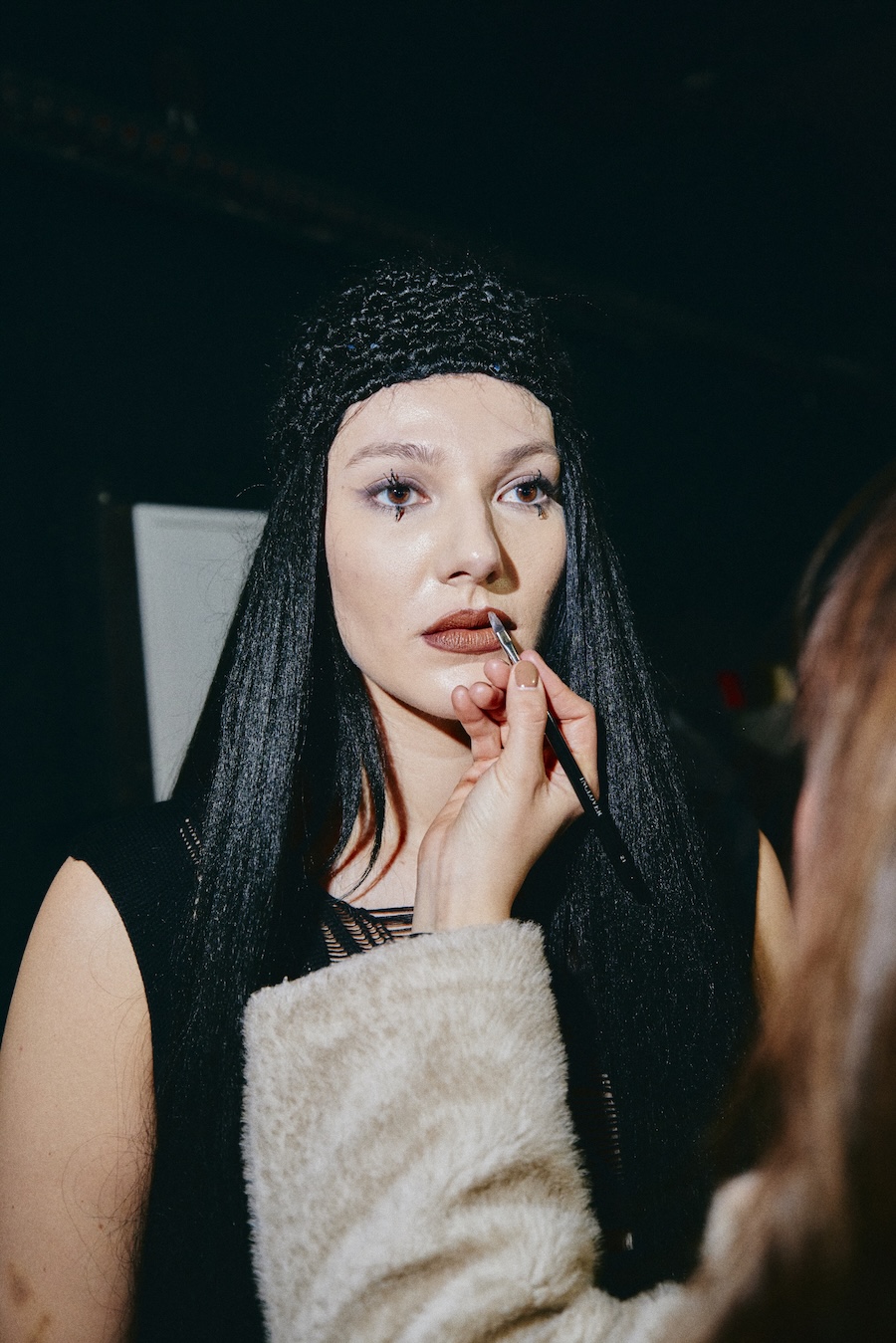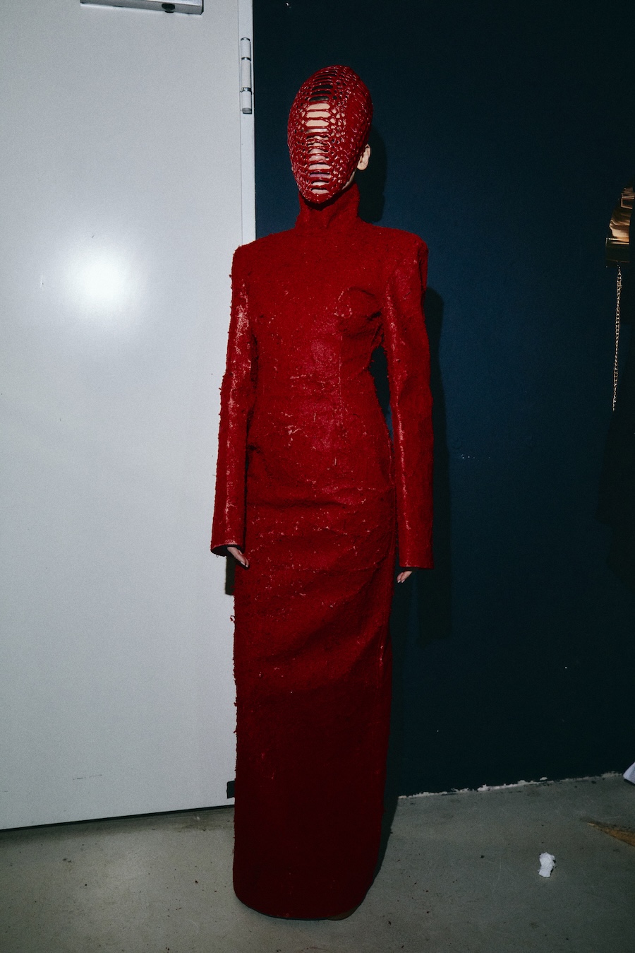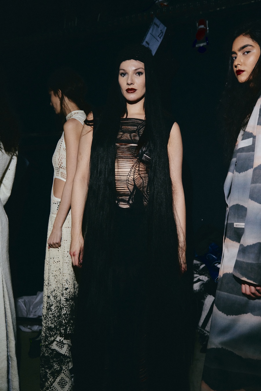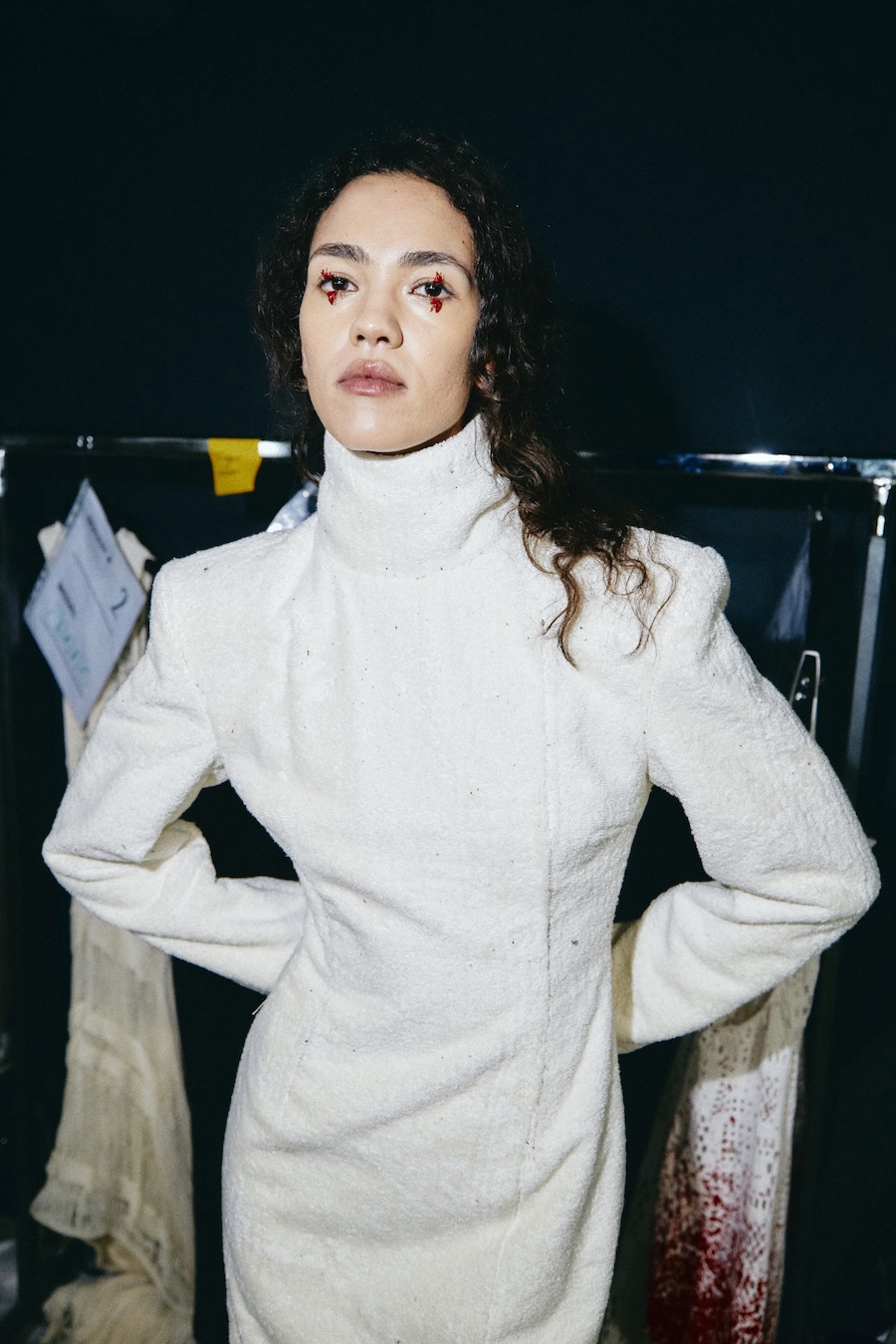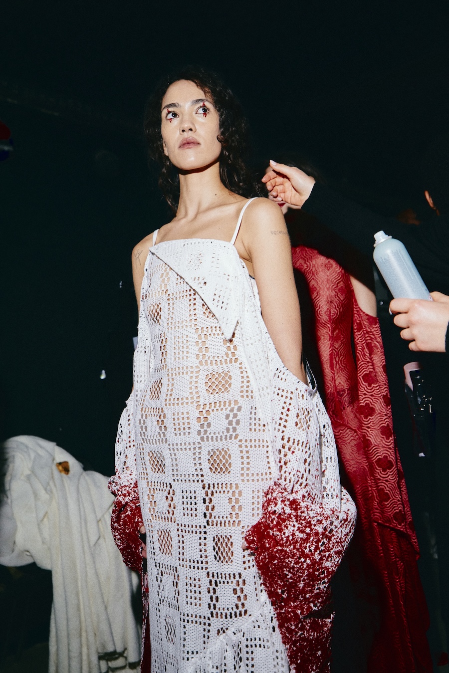 With over 400 hours of meticulous craftsmanship, hair accessories, masks, and braided caps made from vegan materials become pivotal elements of the styling. These pieces oscillate between functioning as a second skin and serving as protective shells, reflecting themes of innocence and strength, vulnerability, and the demonic qualities often ascribed to Lilith.
