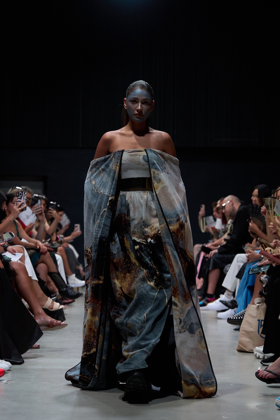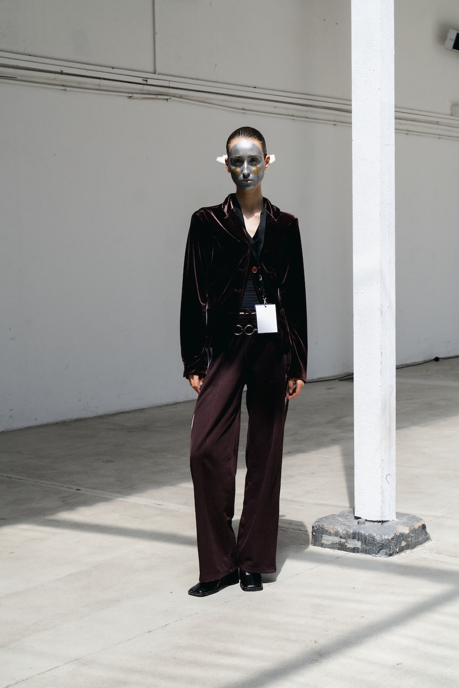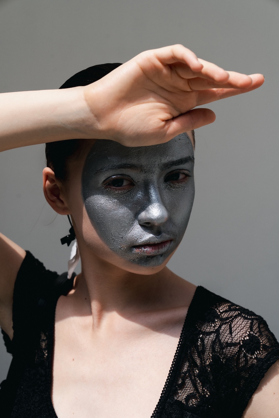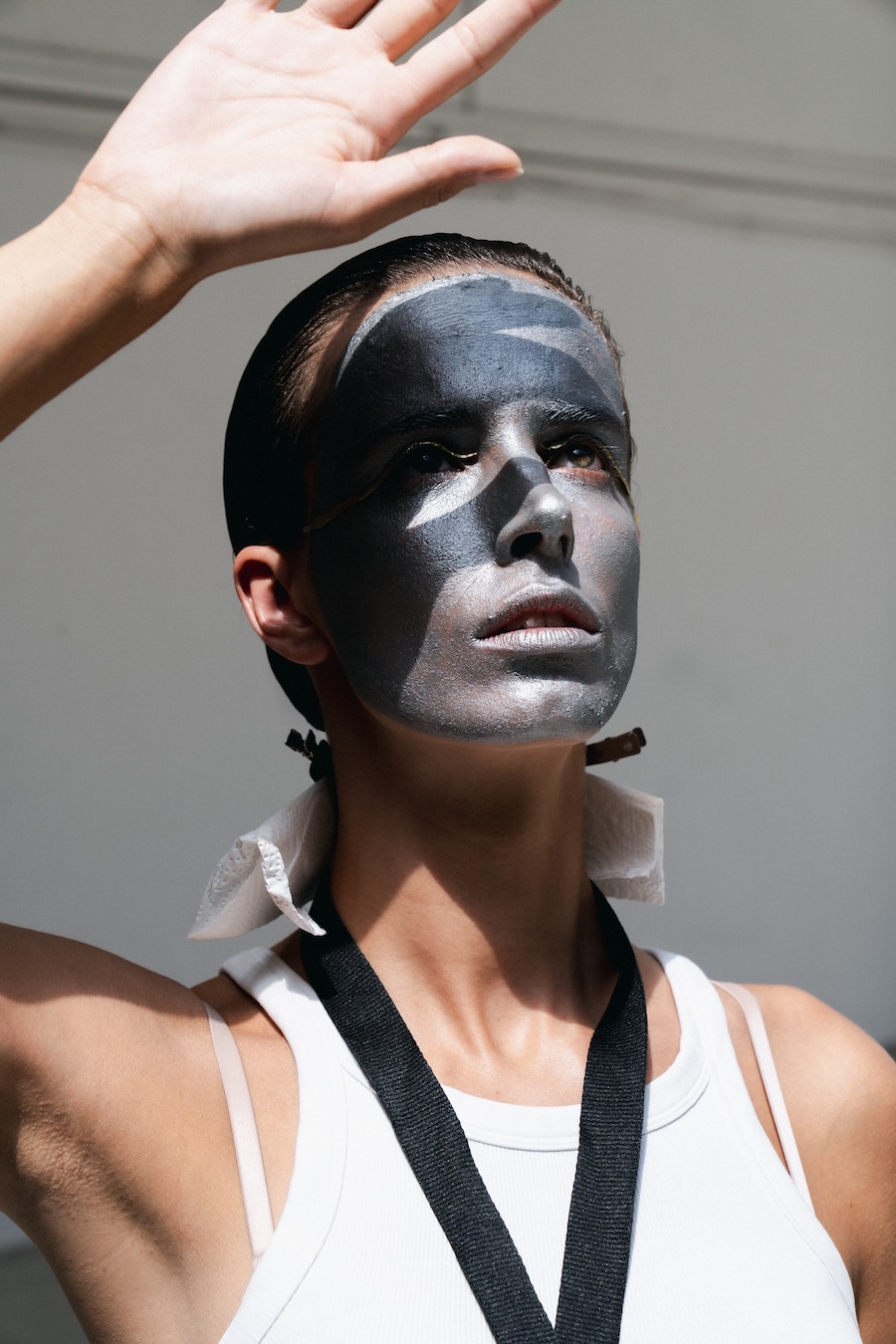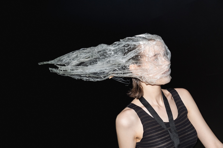 The designs are steeped in a palette and forms inspired by the contemporary collection and the elegance of Japanese porcelain painting, echoing the tension between identity and performance. Each look, rough, abstract, and theatrical, serves as a powerful metaphor for the act of shedding external facades in favour of genuine self-revelation. The delicate threads, reminiscent of zippers drawn across the face, symbolise the unfastening of the mask, heralding the emergence of one’s true self into vibrant authenticity.