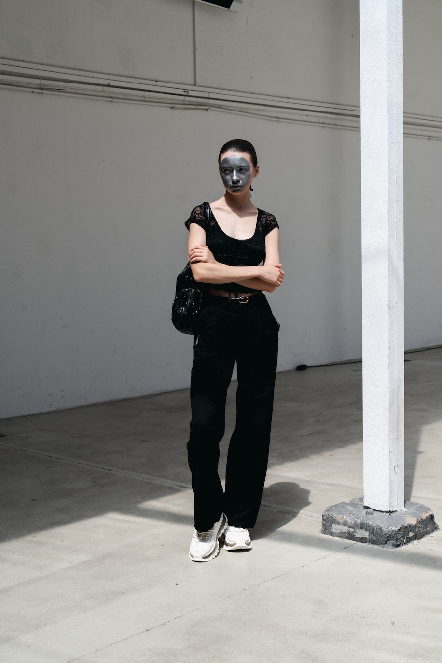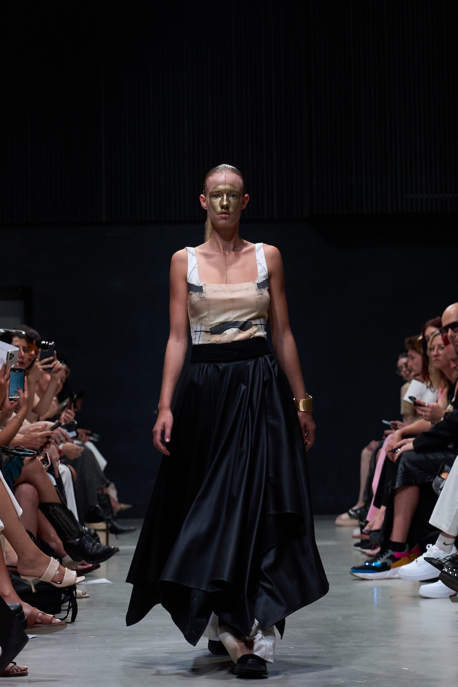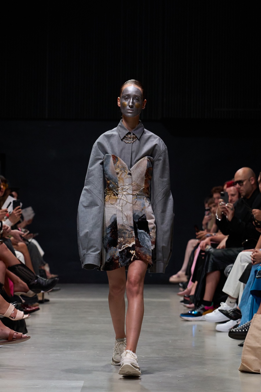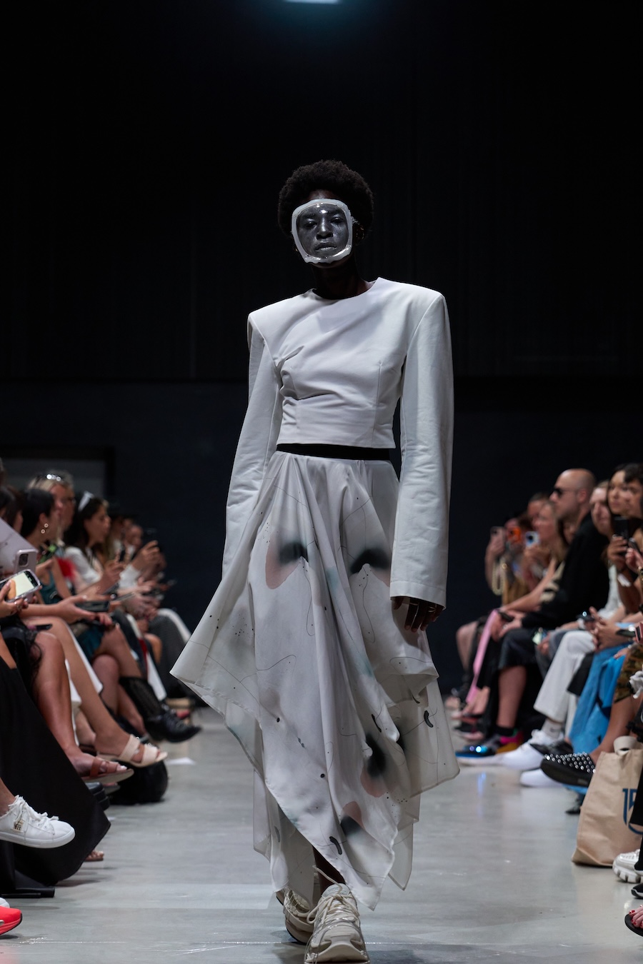 The designs are steeped in a palette and forms inspired by the contemporary collection and the elegance of Japanese porcelain painting, echoing the tension between identity and performance. Each look, rough, abstract, and theatrical, serves as a powerful metaphor for the act of shedding external facades in favour of genuine self-revelation. The delicate threads, reminiscent of zippers drawn across the face, symbolise the unfastening of the mask, heralding the emergence of one’s true self into vibrant authenticity.