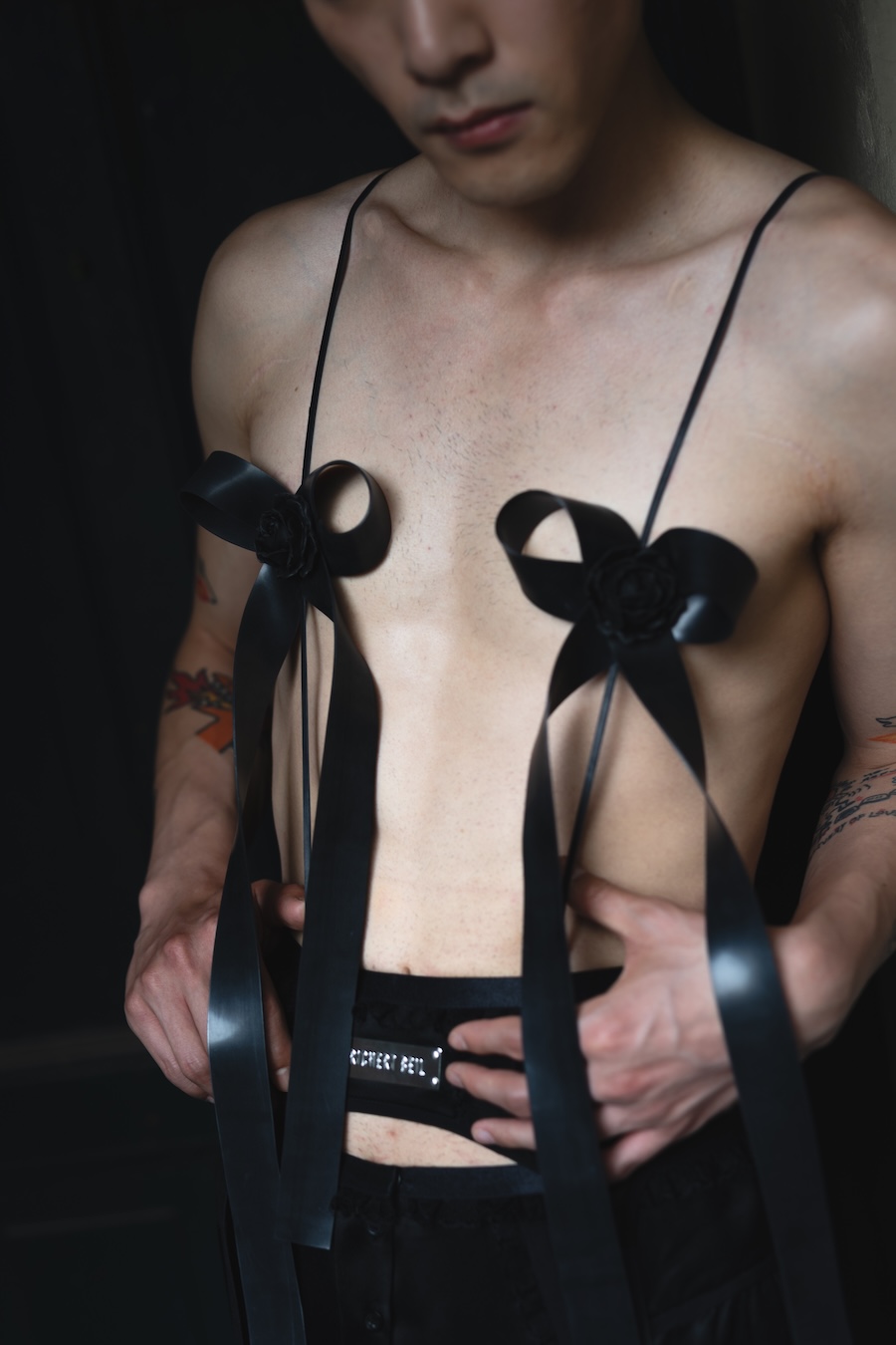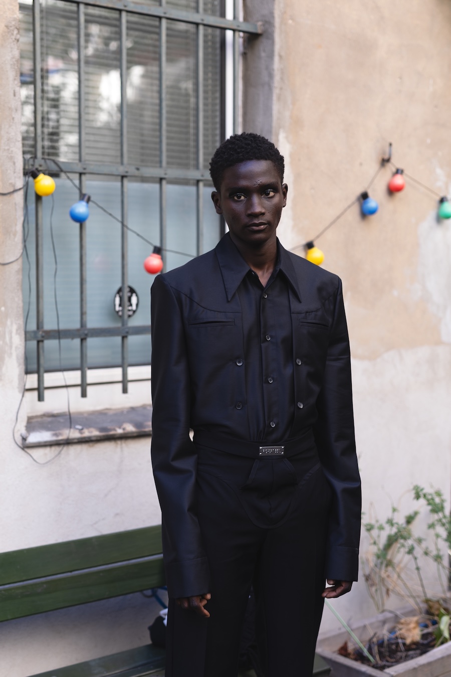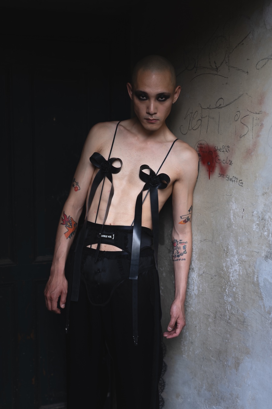 A strong commitment to craftsmanship is evident through lingerie-inspired techniques and hand-finished details, bringing each piece to life. Traditional “Tracht” elements undergo a striking modern transformation, evident in the bold latex lederhosen flaunting suspender-like details. Structured shirts channel the spirit of classic uniforms and traditional cuts, helping to ground the collection in cultural memory.