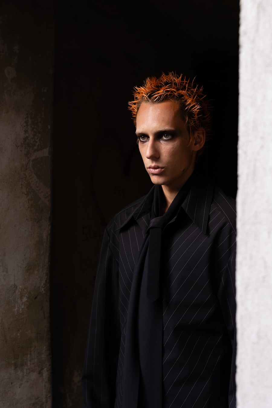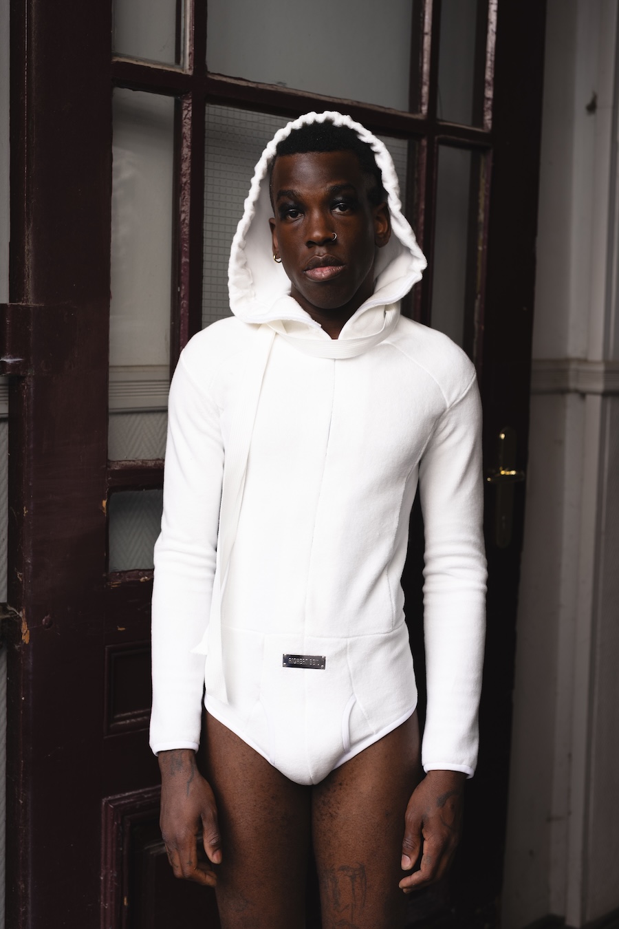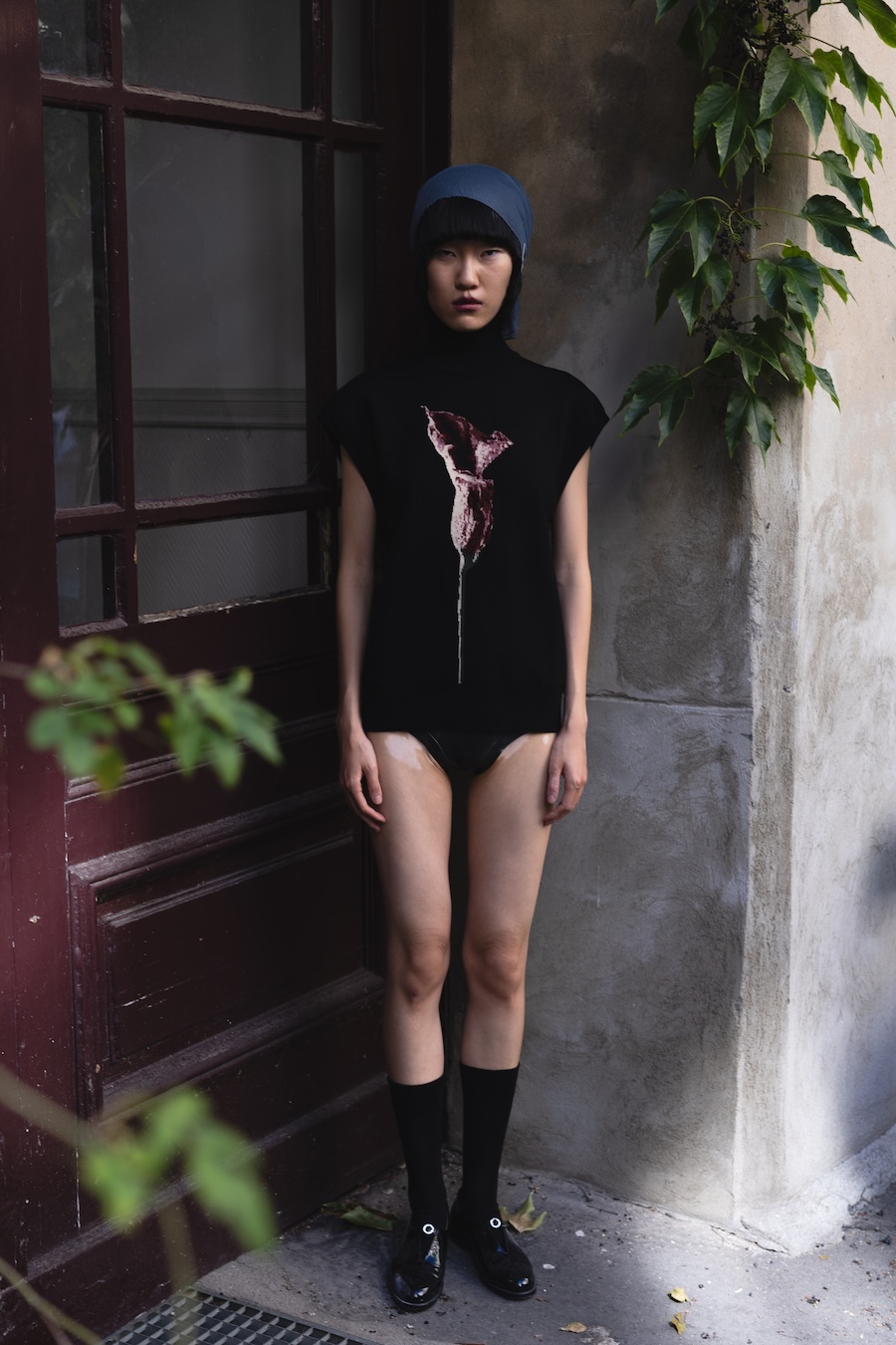 A strong commitment to craftsmanship is evident through lingerie-inspired techniques and hand-finished details, bringing each piece to life. Traditional “Tracht” elements undergo a striking modern transformation, evident in the bold latex lederhosen flaunting suspender-like details. Structured shirts channel the spirit of classic uniforms and traditional cuts, helping to ground the collection in cultural memory.