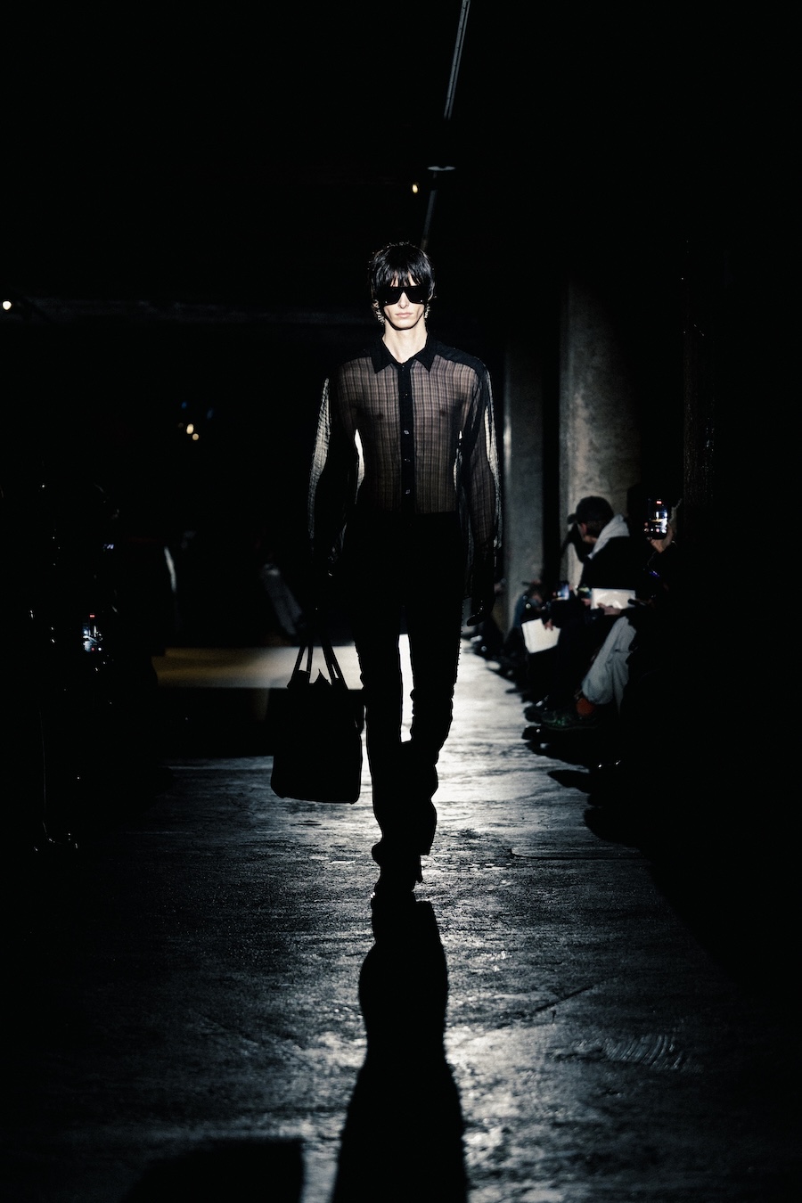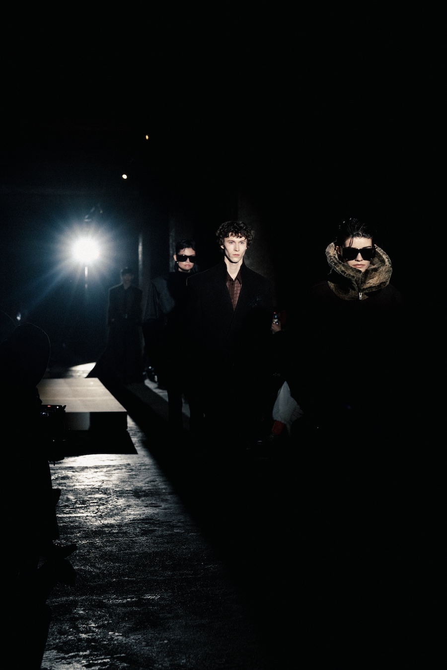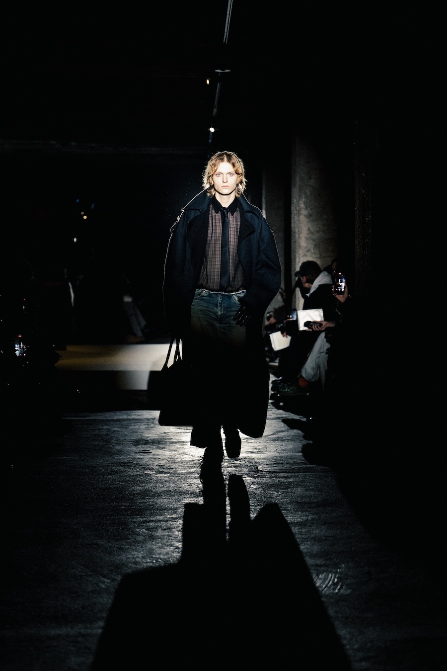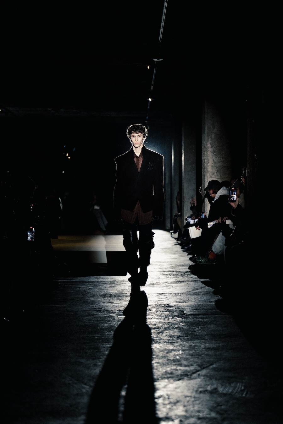 The runway experience was further enriched by a multisensory scent installation developed in collaboration with RYOKO. This innovative installation added an olfactory dimension to the show, with models carrying incense burners that gradually released a custom fragrance, culminating in a full aromatic experience that extended the presentation beyond the visual.