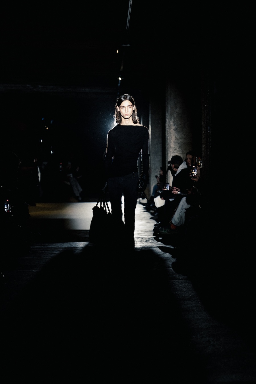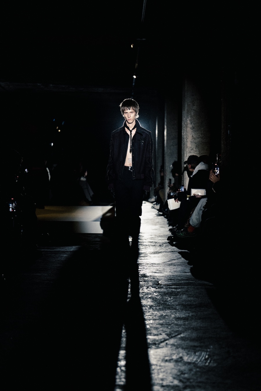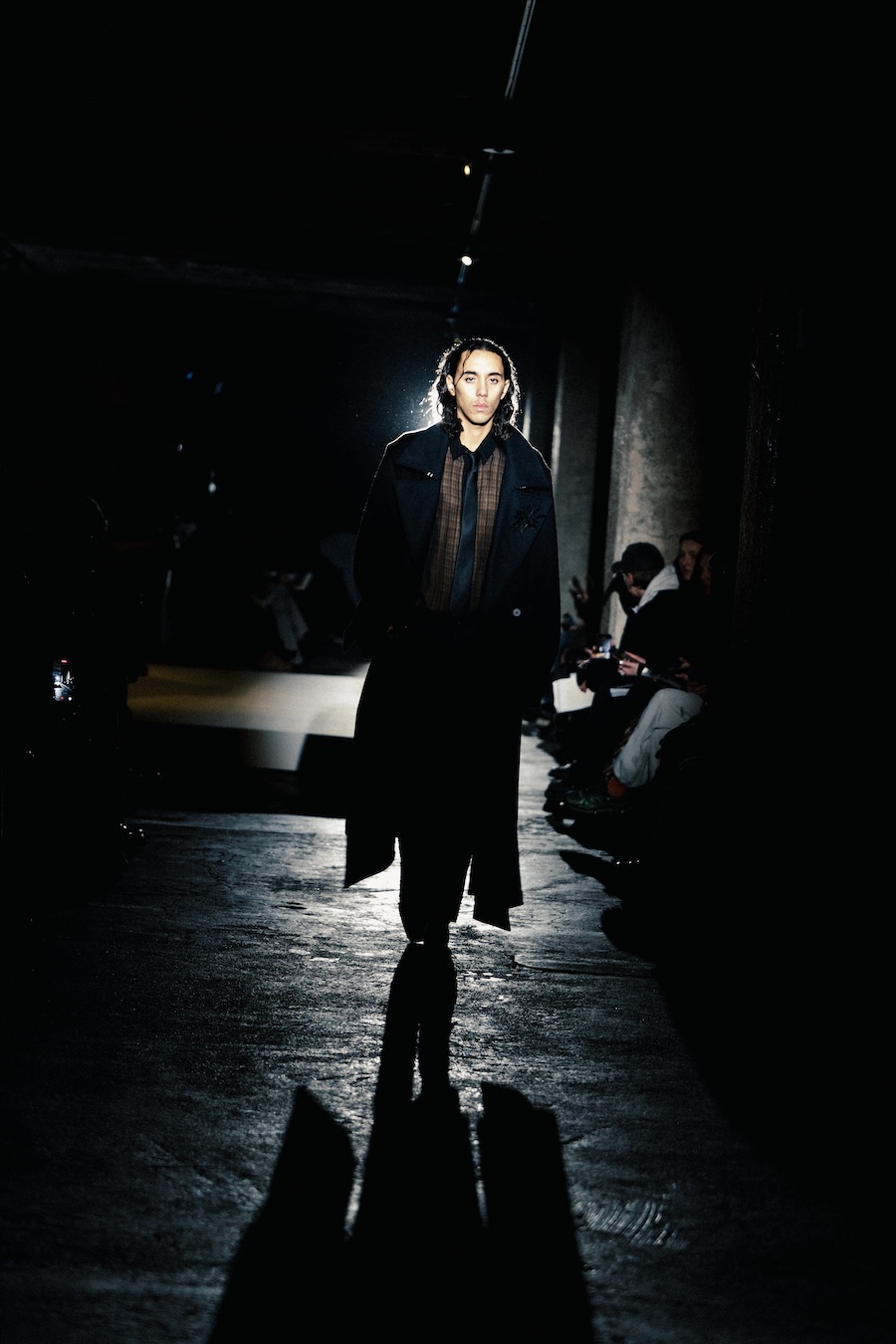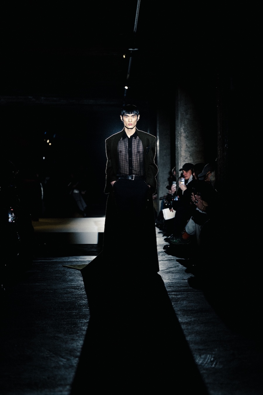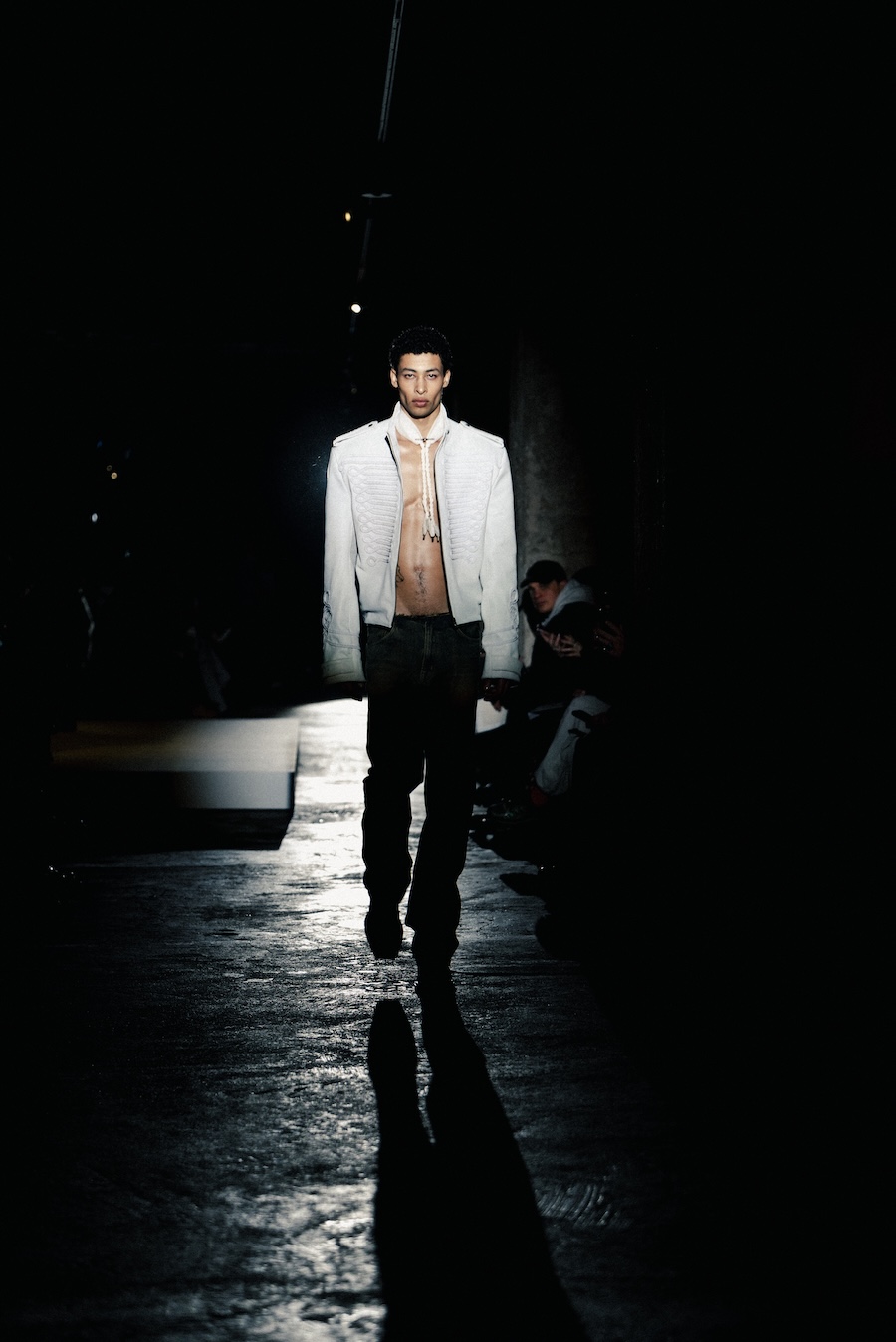 The runway experience was further enriched by a multisensory scent installation developed in collaboration with RYOKO. This innovative installation added an olfactory dimension to the show, with models carrying incense burners that gradually released a custom fragrance, culminating in a full aromatic experience that extended the presentation beyond the visual.