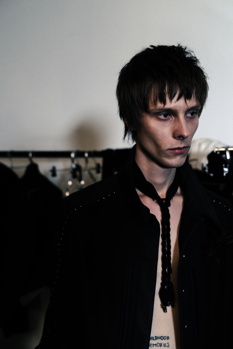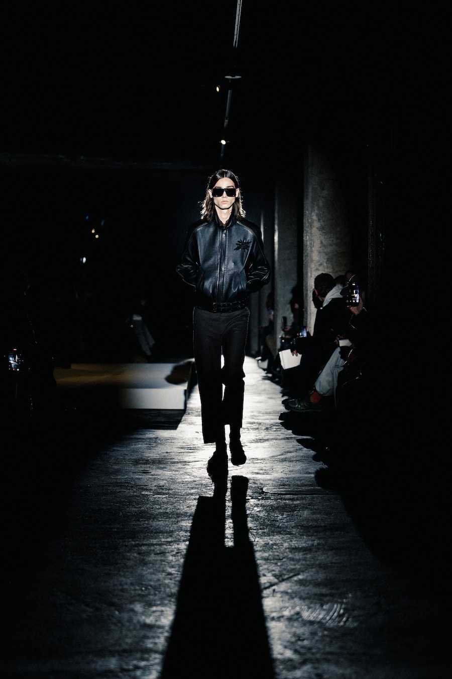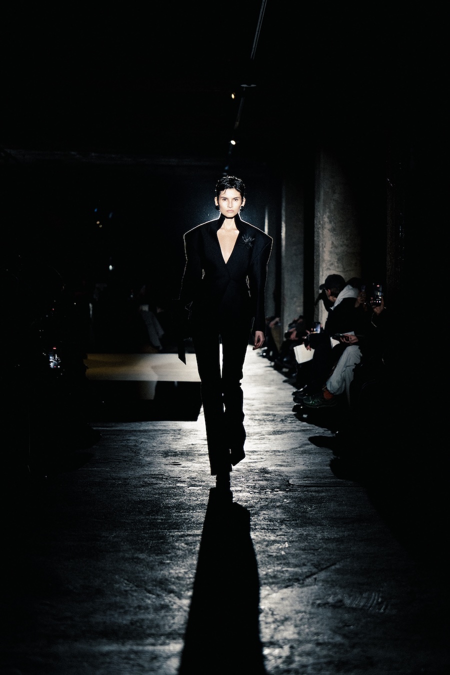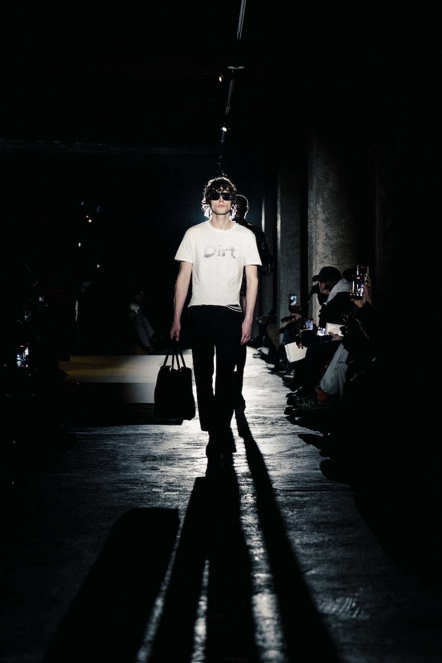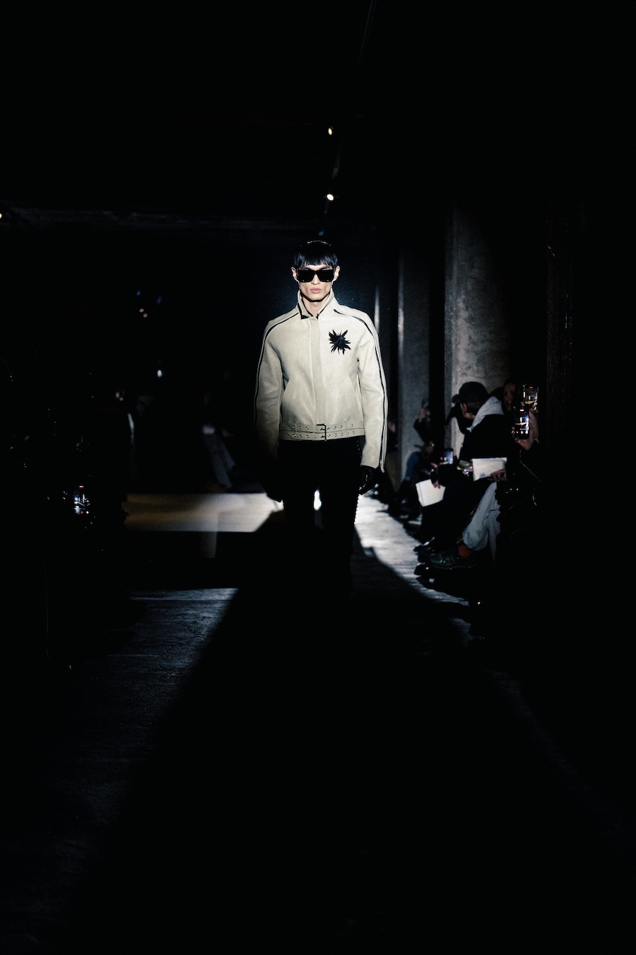 The runway experience was further enriched by a multisensory scent installation developed in collaboration with RYOKO. This innovative installation added an olfactory dimension to the show, with models carrying incense burners that gradually released a custom fragrance, culminating in a full aromatic experience that extended the presentation beyond the visual.