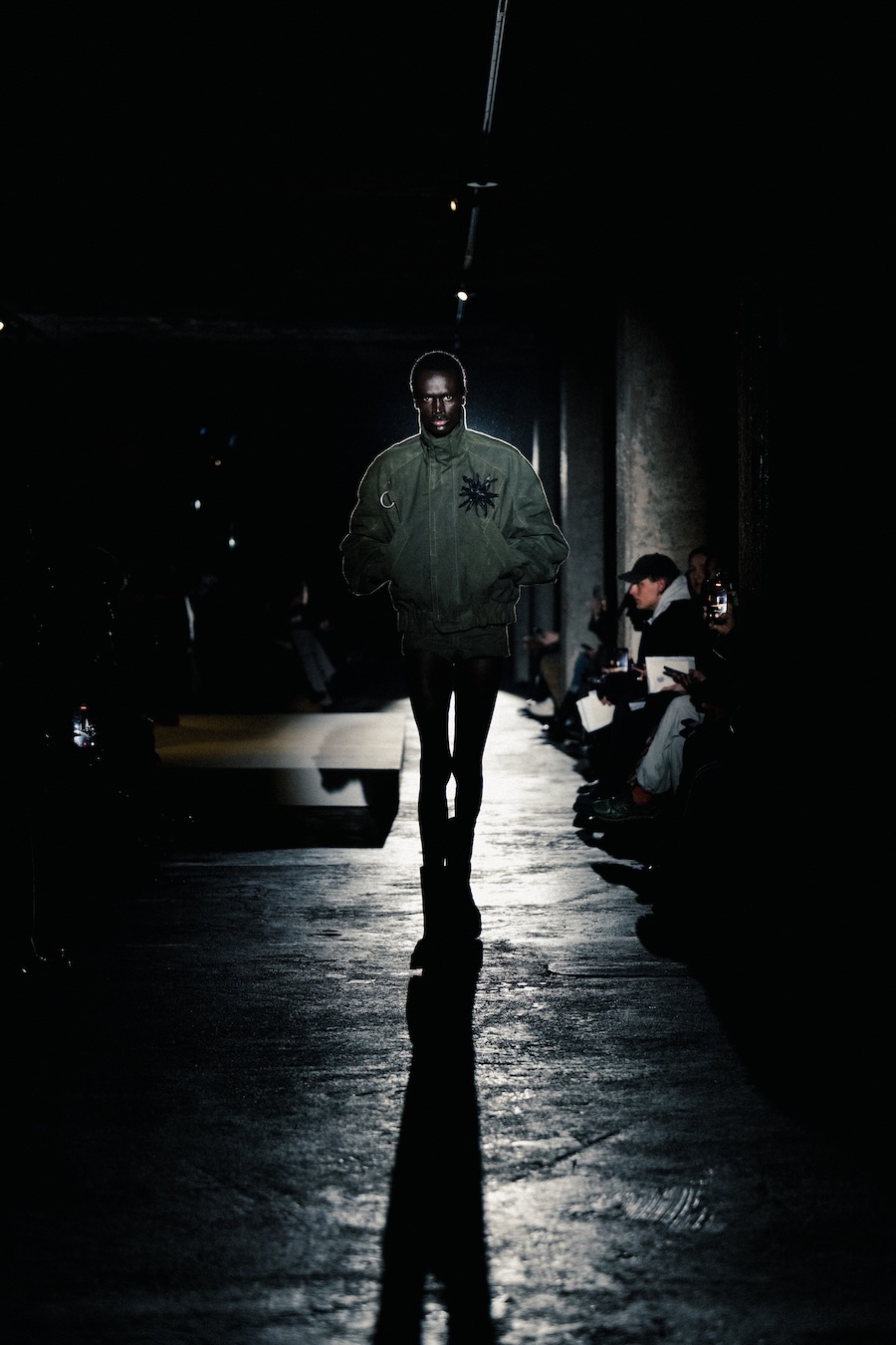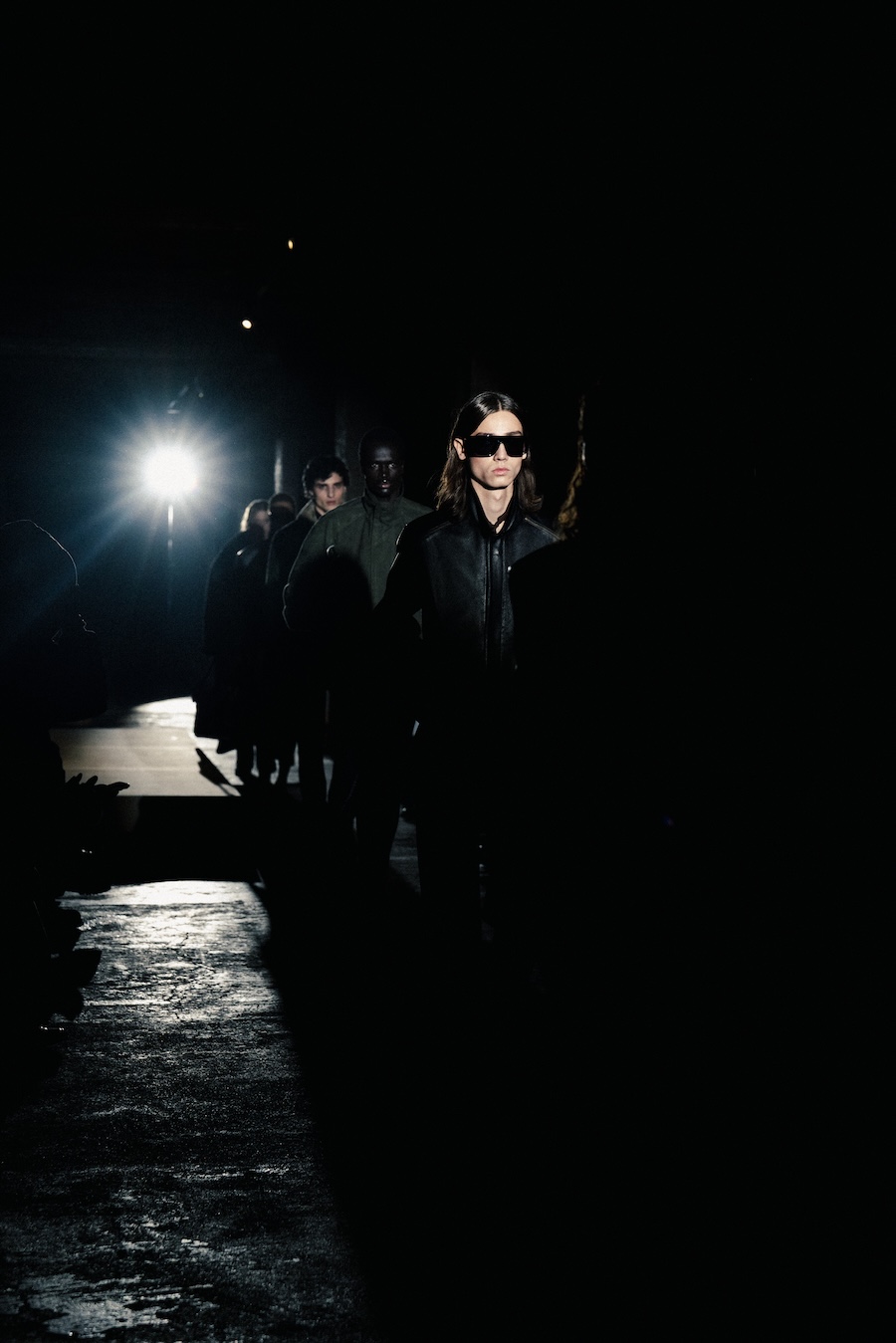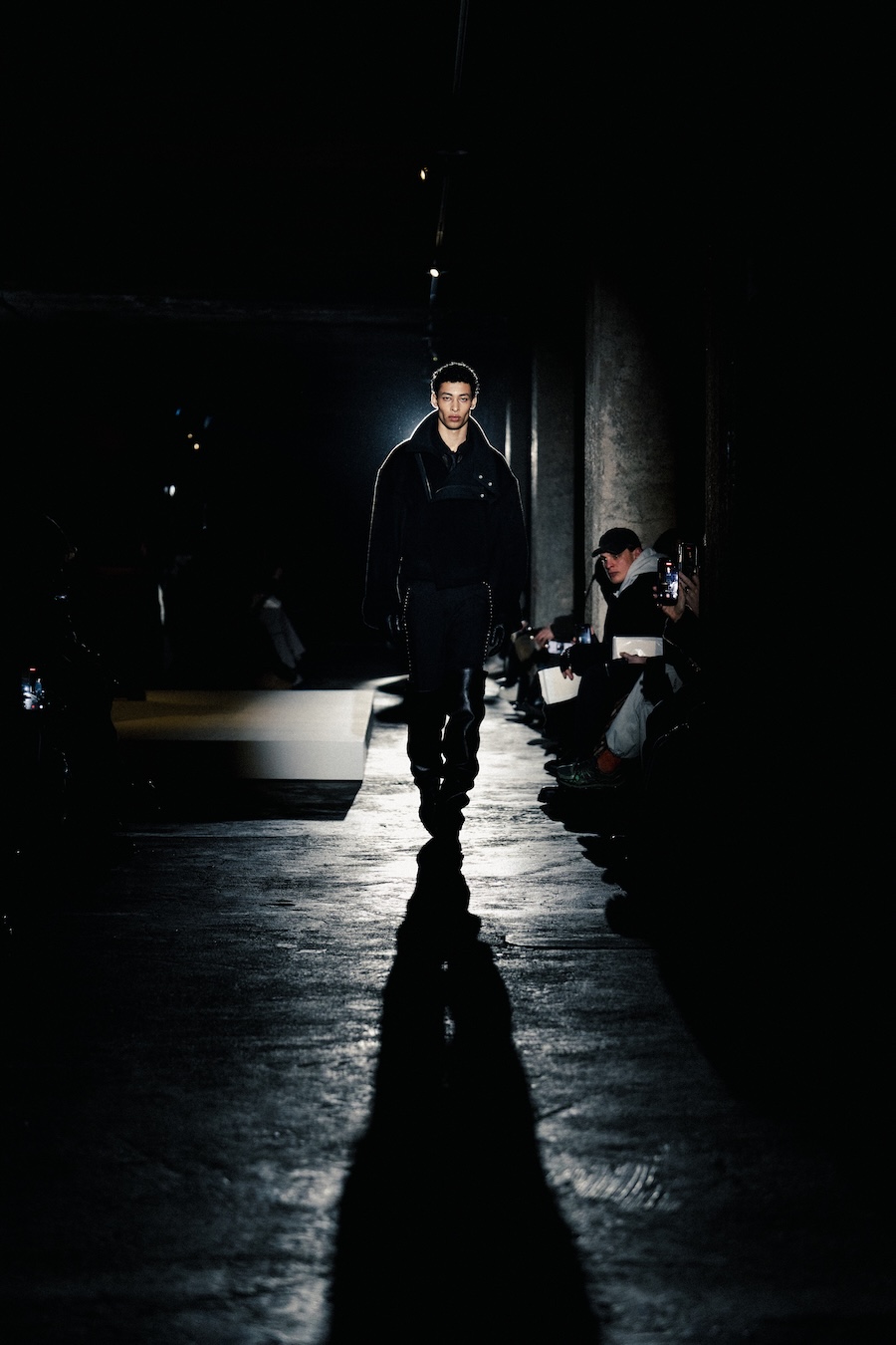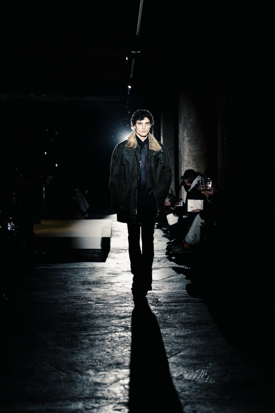 The runway experience was further enriched by a multisensory scent installation developed in collaboration with RYOKO. This innovative installation added an olfactory dimension to the show, with models carrying incense burners that gradually released a custom fragrance, culminating in a full aromatic experience that extended the presentation beyond the visual.
