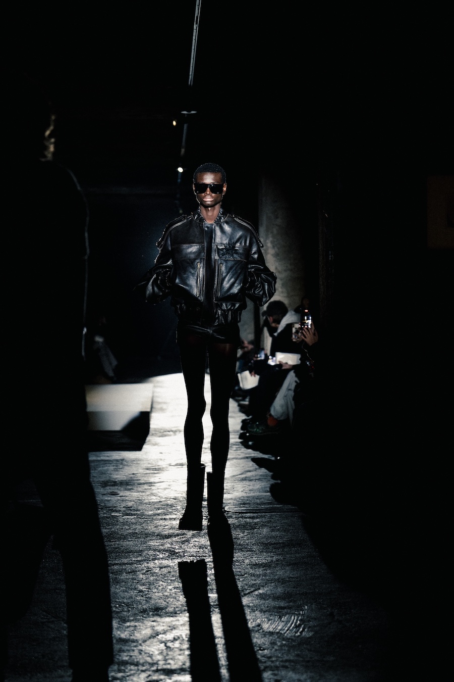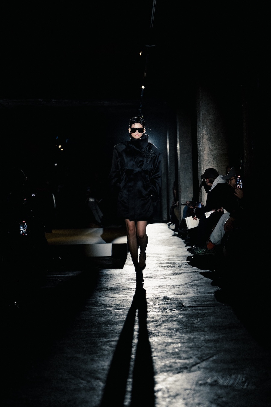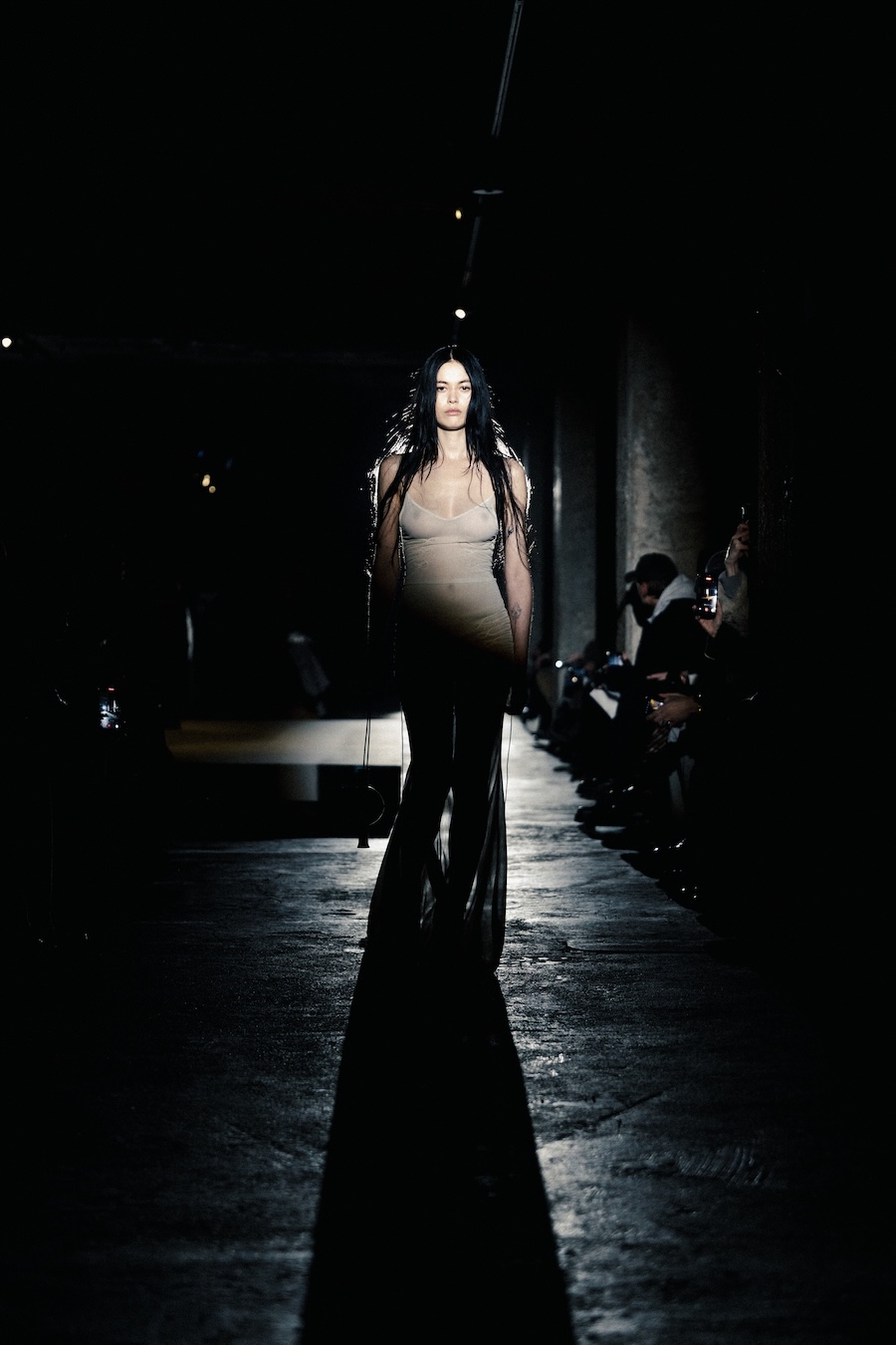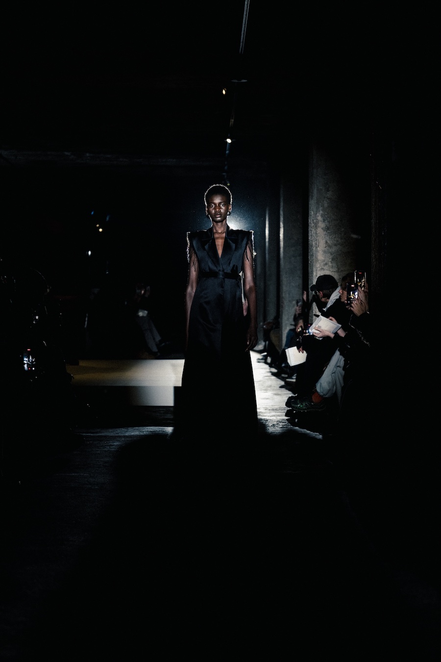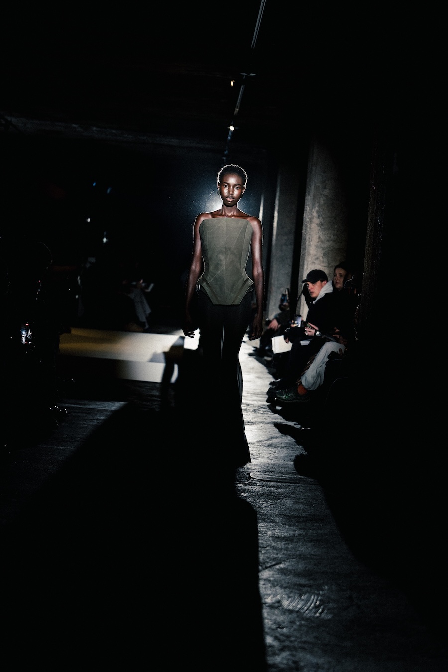 The runway experience was further enriched by a multisensory scent installation developed in collaboration with RYOKO. This innovative installation added an olfactory dimension to the show, with models carrying incense burners that gradually released a custom fragrance, culminating in a full aromatic experience that extended the presentation beyond the visual.