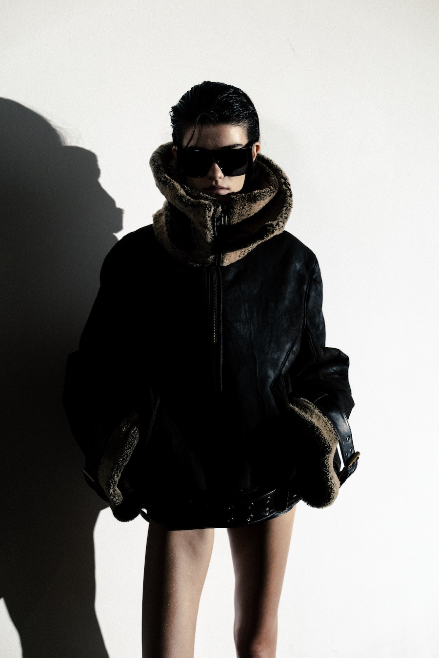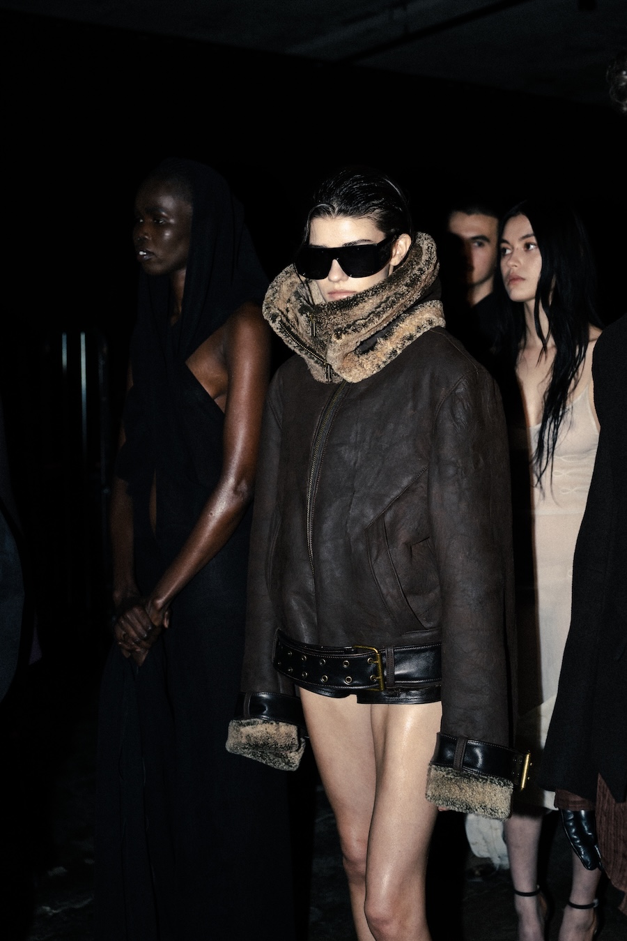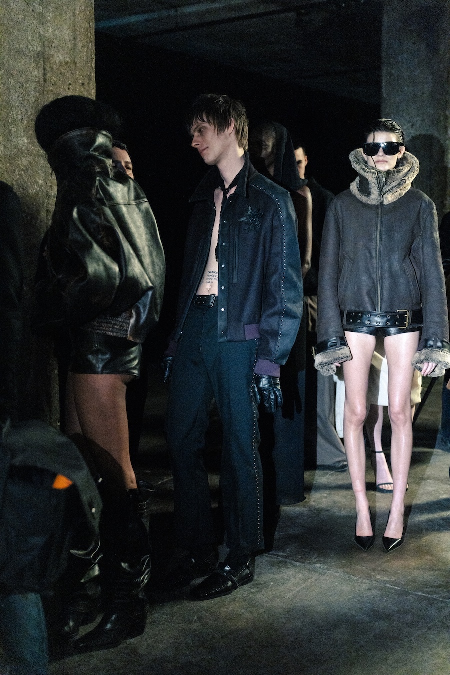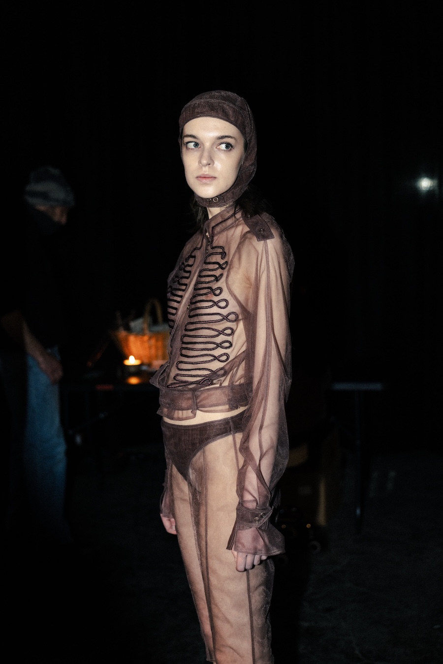 Silhouettes within the collection navigate between sharp minimalism and striking architectural forms. Features such as epaulettes, studs, transparent fabrics, leather, Napoleonic details, and upcycled fur accents interact in a compelling dialogue between structure and vulnerability.