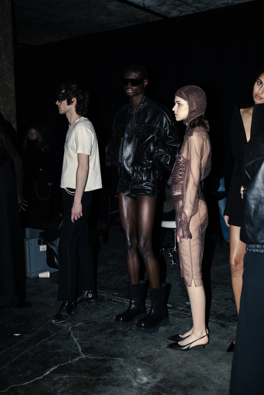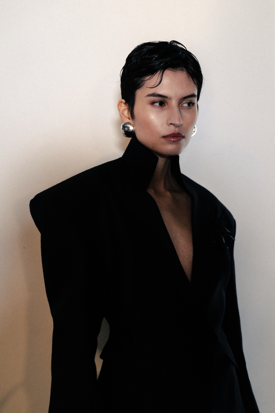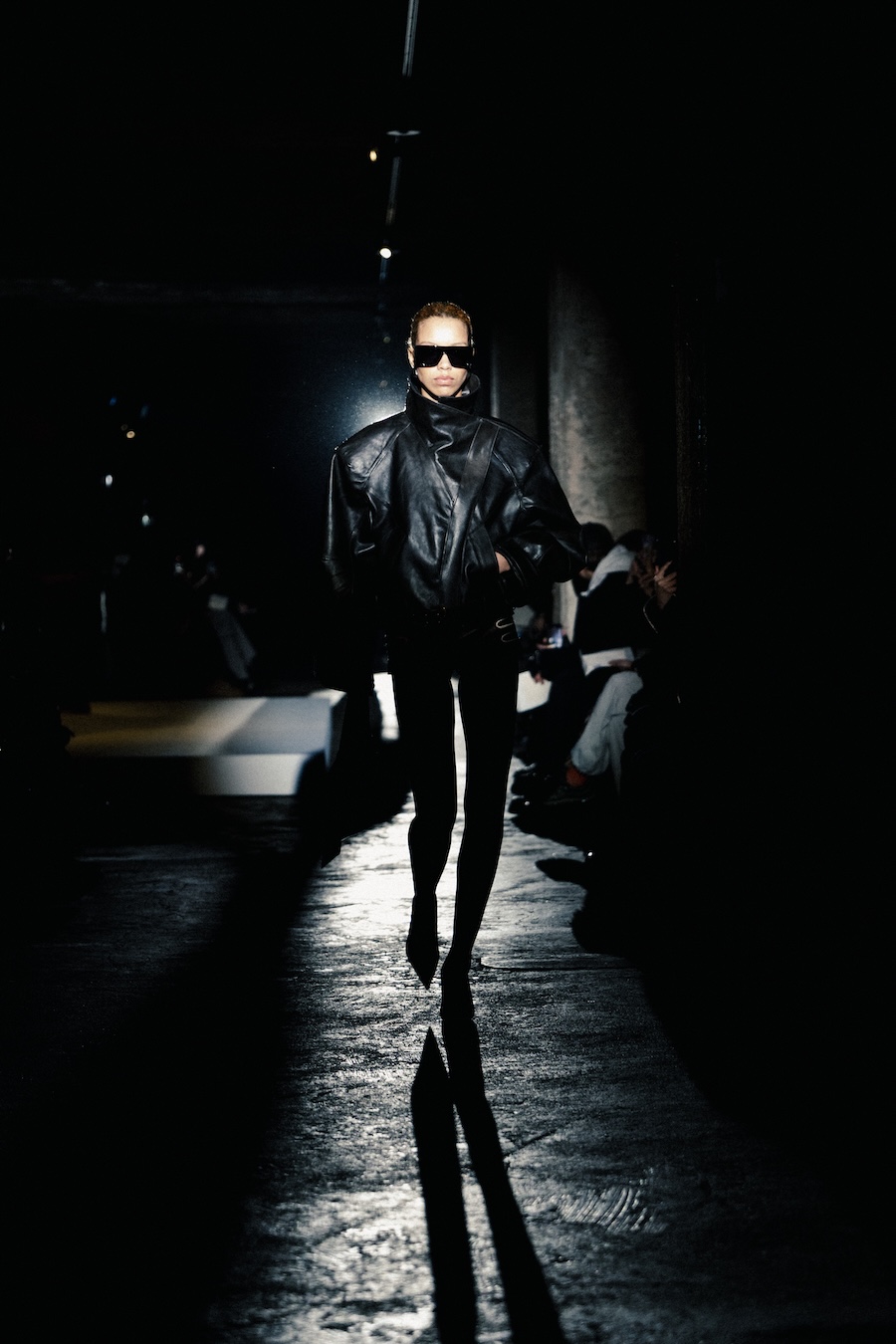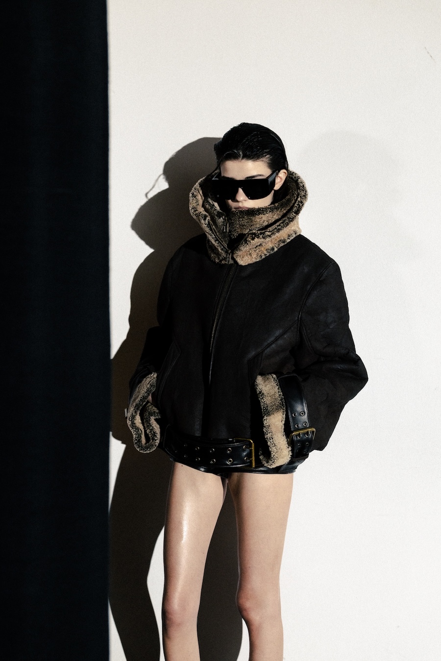 Silhouettes within the collection navigate between sharp minimalism and striking architectural forms. Features such as epaulettes, studs, transparent fabrics, leather, Napoleonic details, and upcycled fur accents interact in a compelling dialogue between structure and vulnerability.