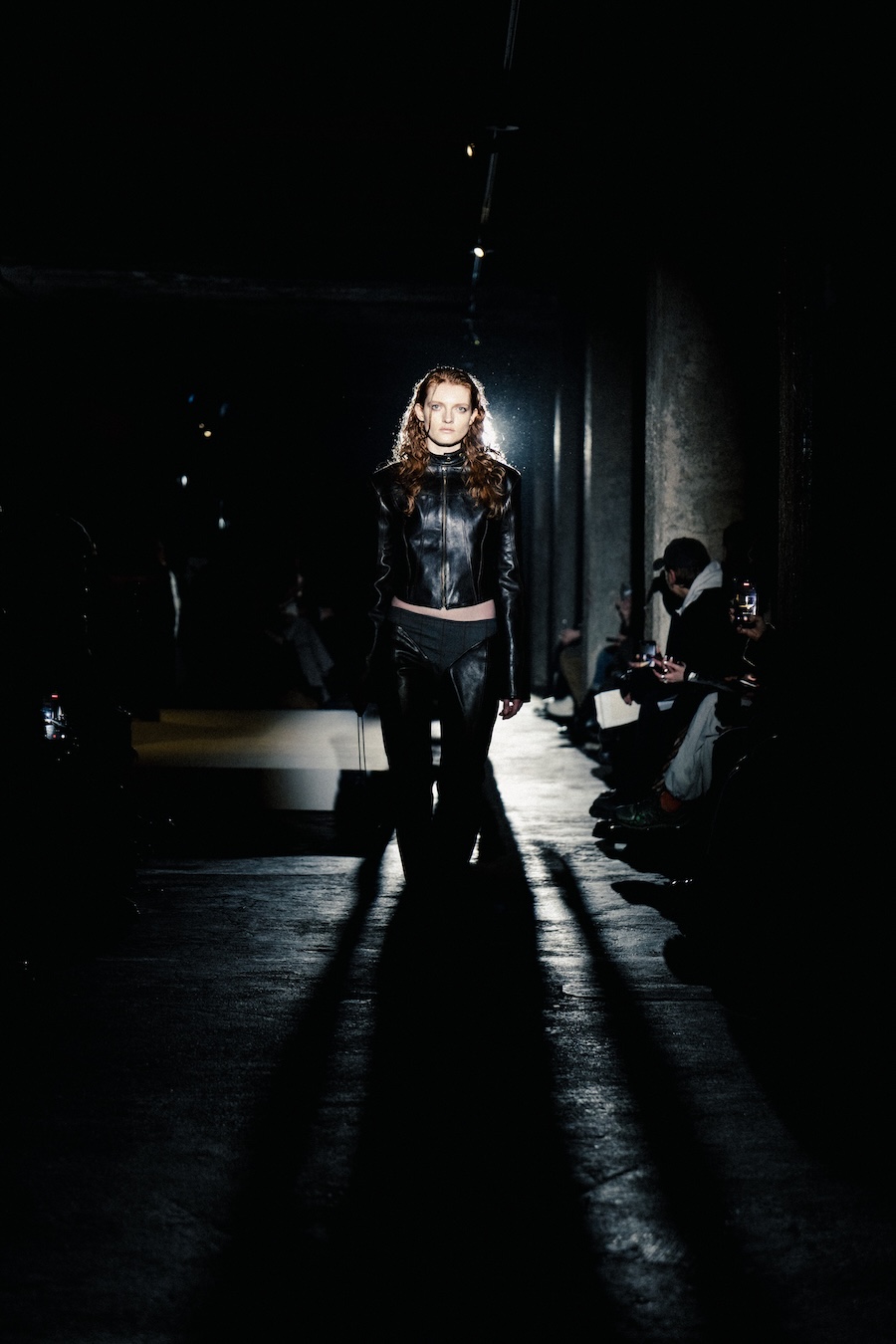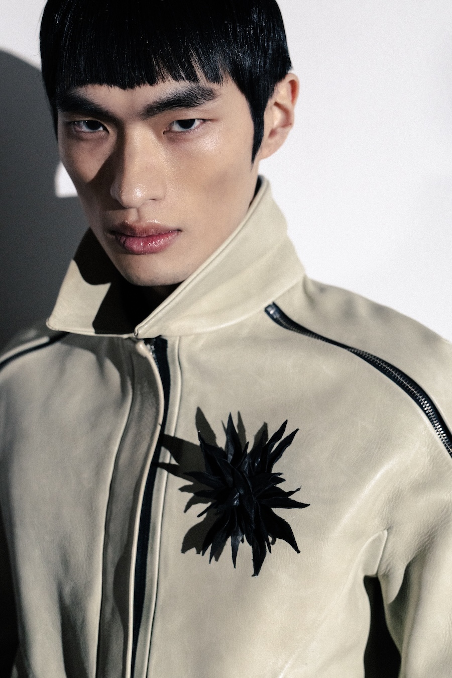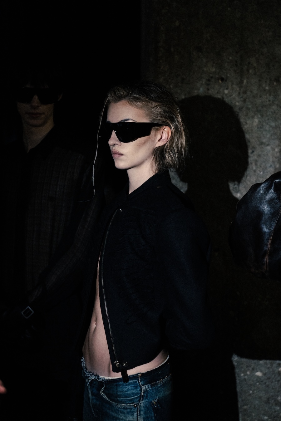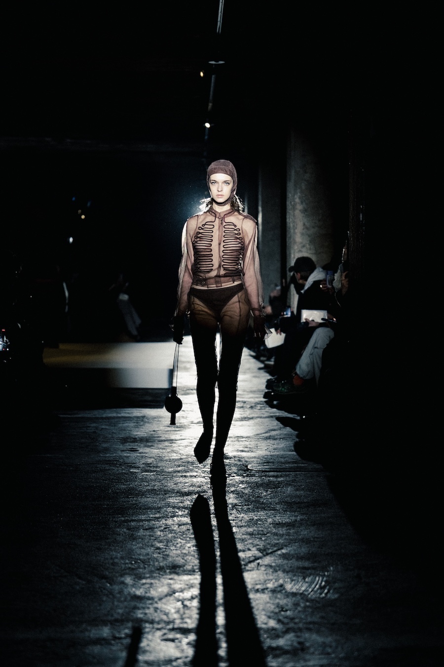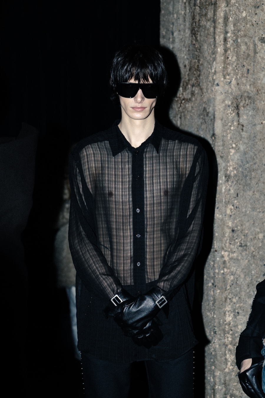 Silhouettes within the collection navigate between sharp minimalism and striking architectural forms. Features such as epaulettes, studs, transparent fabrics, leather, Napoleonic details, and upcycled fur accents interact in a compelling dialogue between structure and vulnerability.