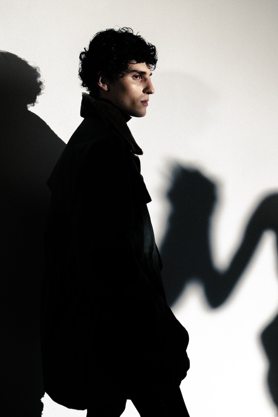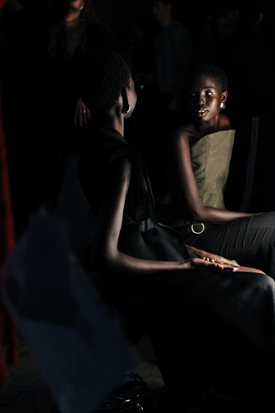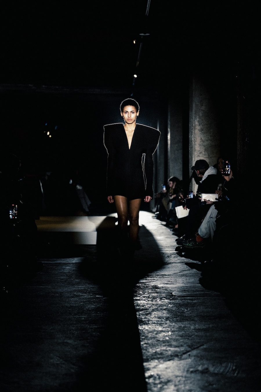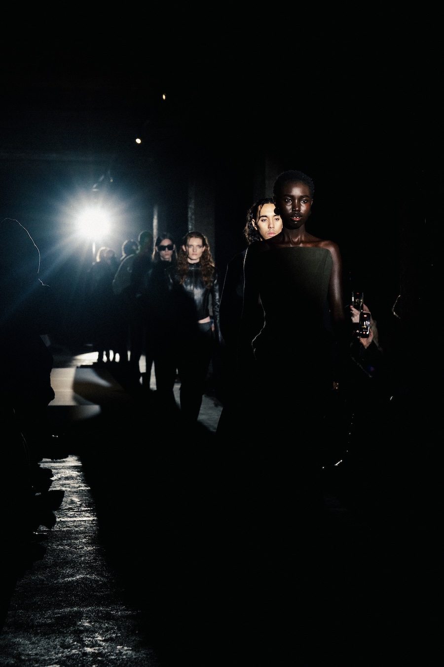 Silhouettes within the collection navigate between sharp minimalism and striking architectural forms. Features such as epaulettes, studs, transparent fabrics, leather, Napoleonic details, and upcycled fur accents interact in a compelling dialogue between structure and vulnerability.