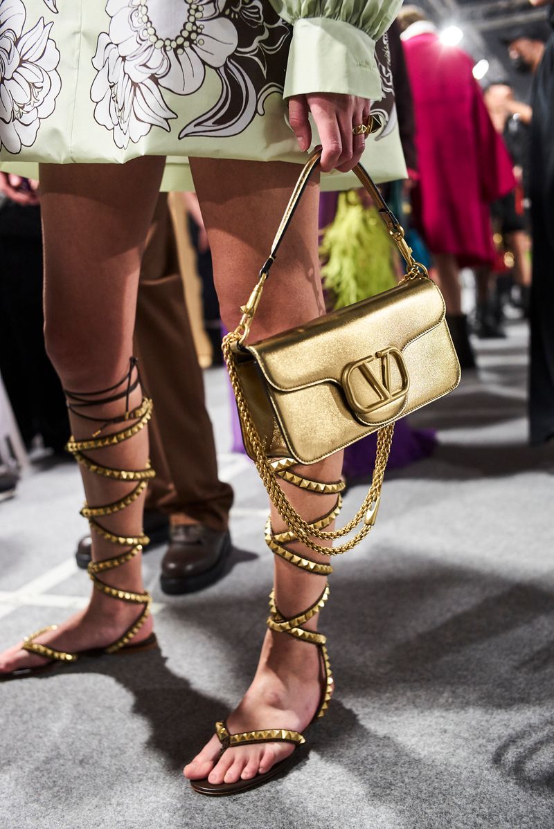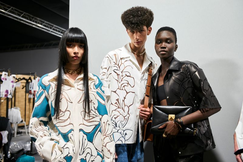 Taffetas, a symbol of Couture, is washed, beaten, deprived of any preciousness to turn into jackets, anoraks, oversized shirts, Bermuda shorts, the play of additions enhanced by the contrasting colors. Denim, worn with precious white shirts that are decorated, inlaid with broderie anglaise, embroidered, is another tribute to the archive. The overblown floral prints are instinctively mixed, while embroideries move from eveningwear to outerwear. Reconnecting with the street, in the end, means touching the ground: wearing boots, or flat Valentino Garavani Roman Stud sandals, and a re-edition of the snake sandal. A single macro stud closes the cleanly-designed bags.