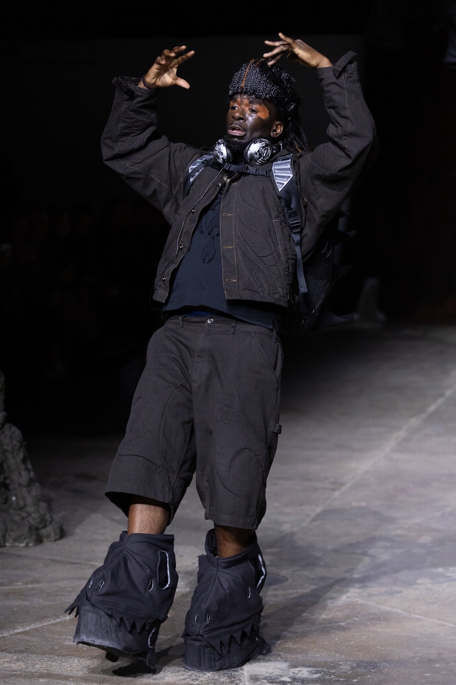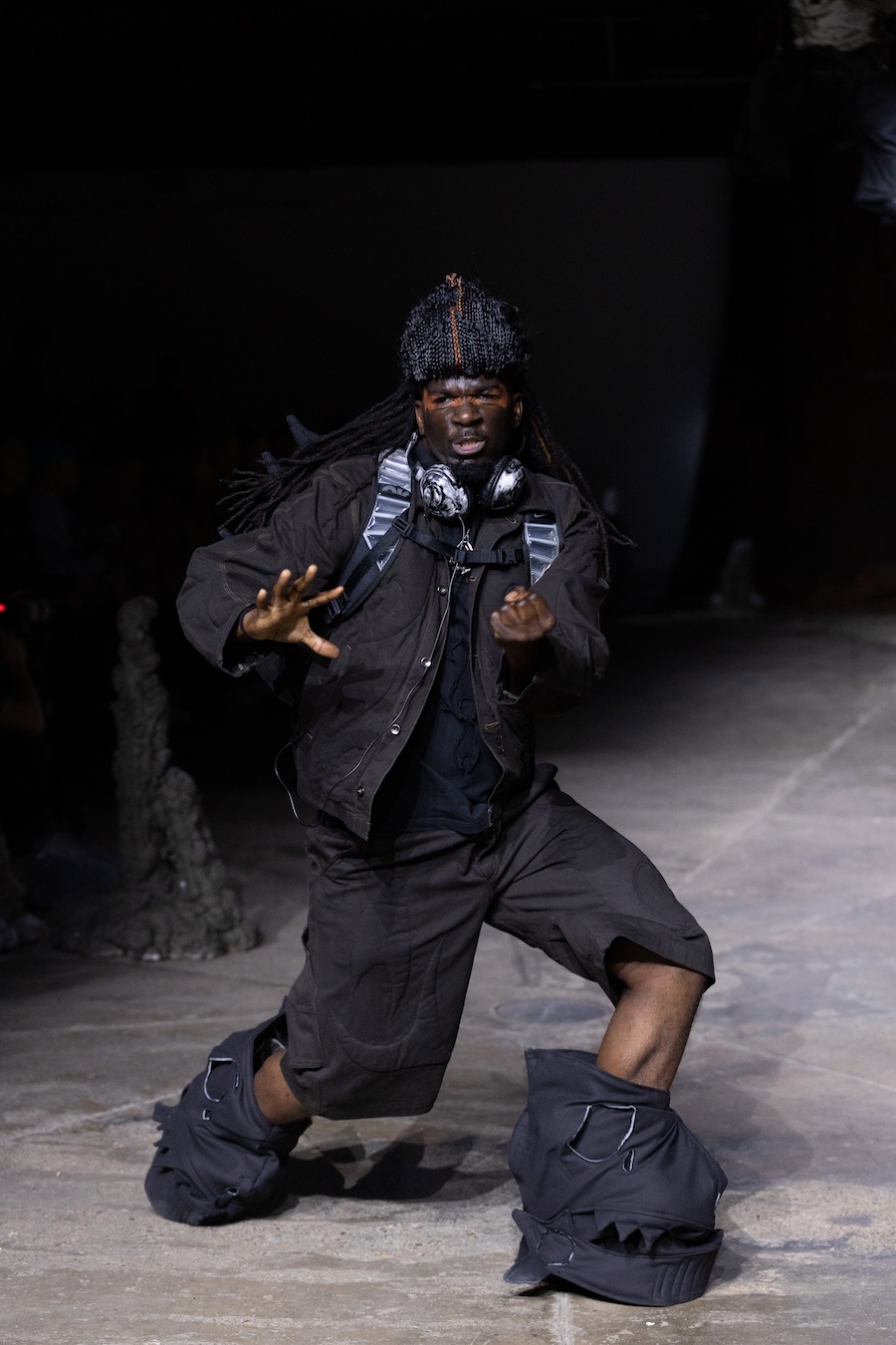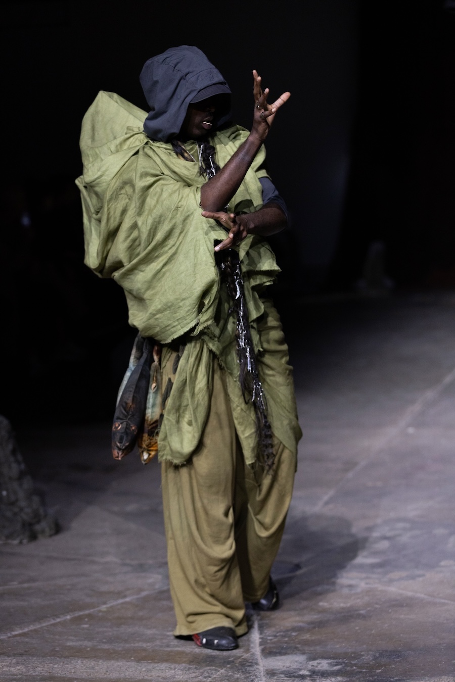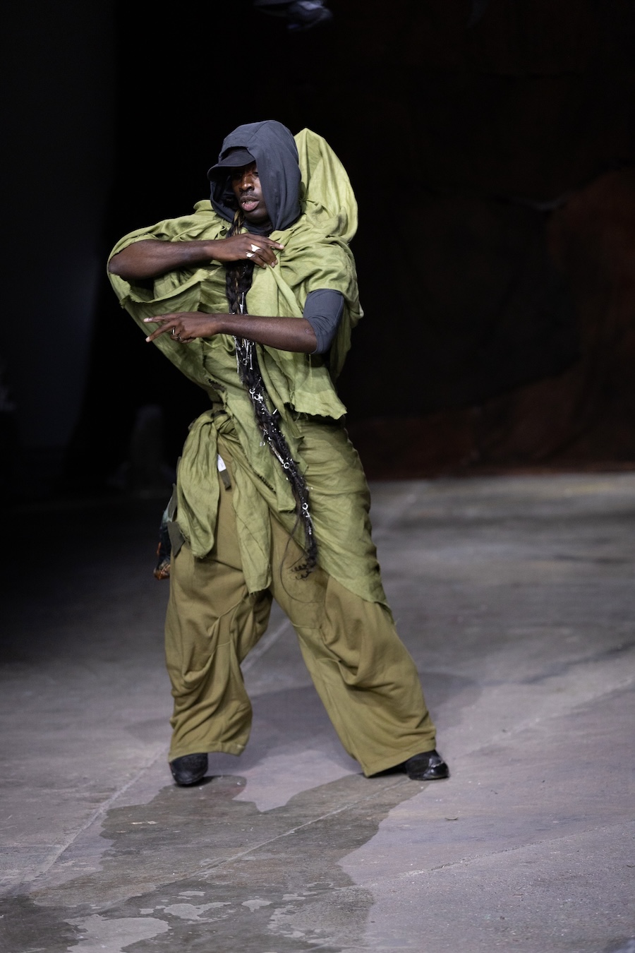 For the latest collection, Stapleson moved to the catwalk format for the first time with “A Ground to Stand On.” This sixth chapter departed from the training grounds of previous seasons, venturing into themes of pre-colonial Caribbean resistance, thus bridging the gap from preparation to lived reality. This evolution reflects YAKU’s commitment to using fashion as a narrative tool, expanding the storytelling through performance, space, and intricate world-building.