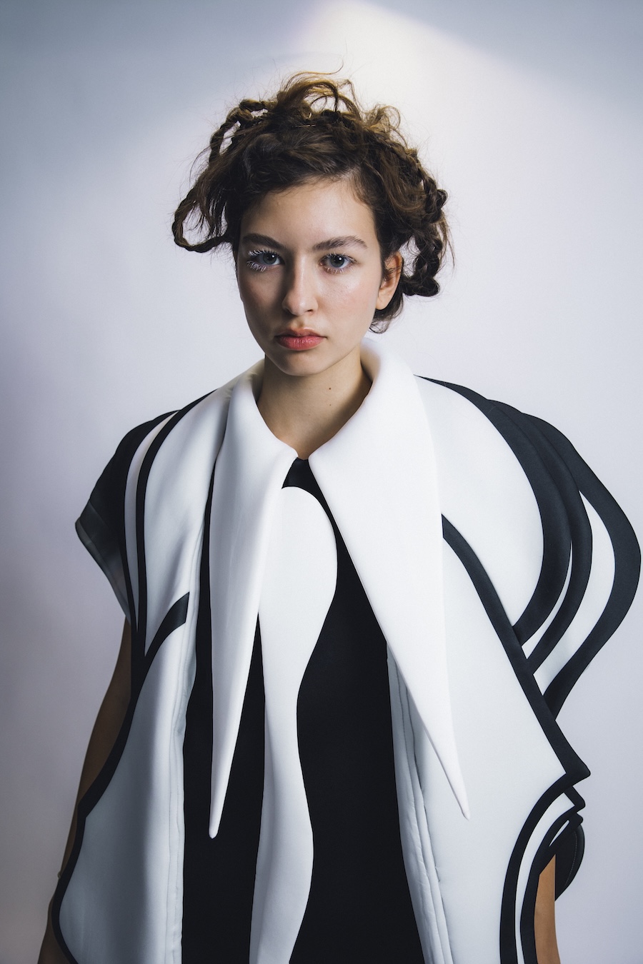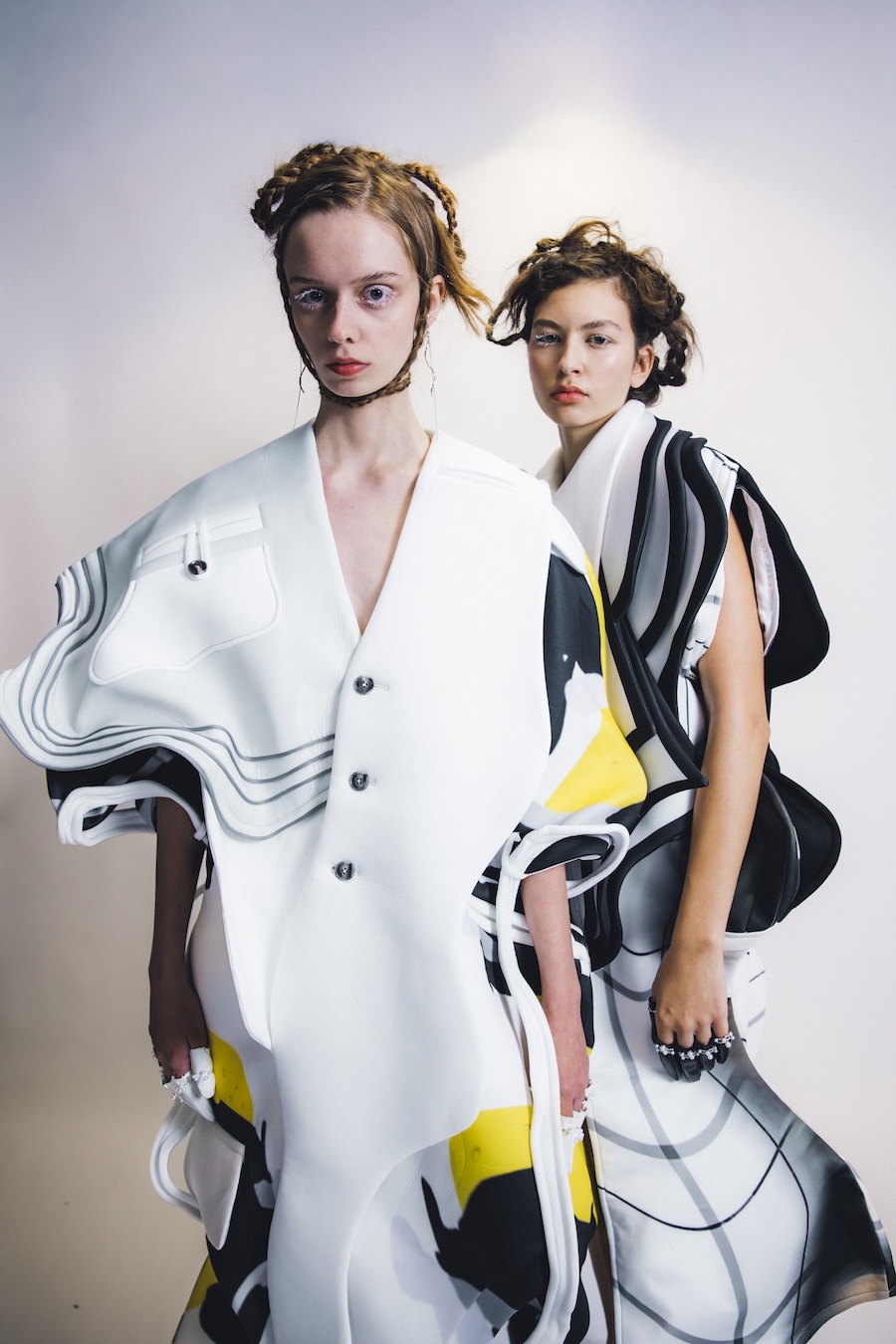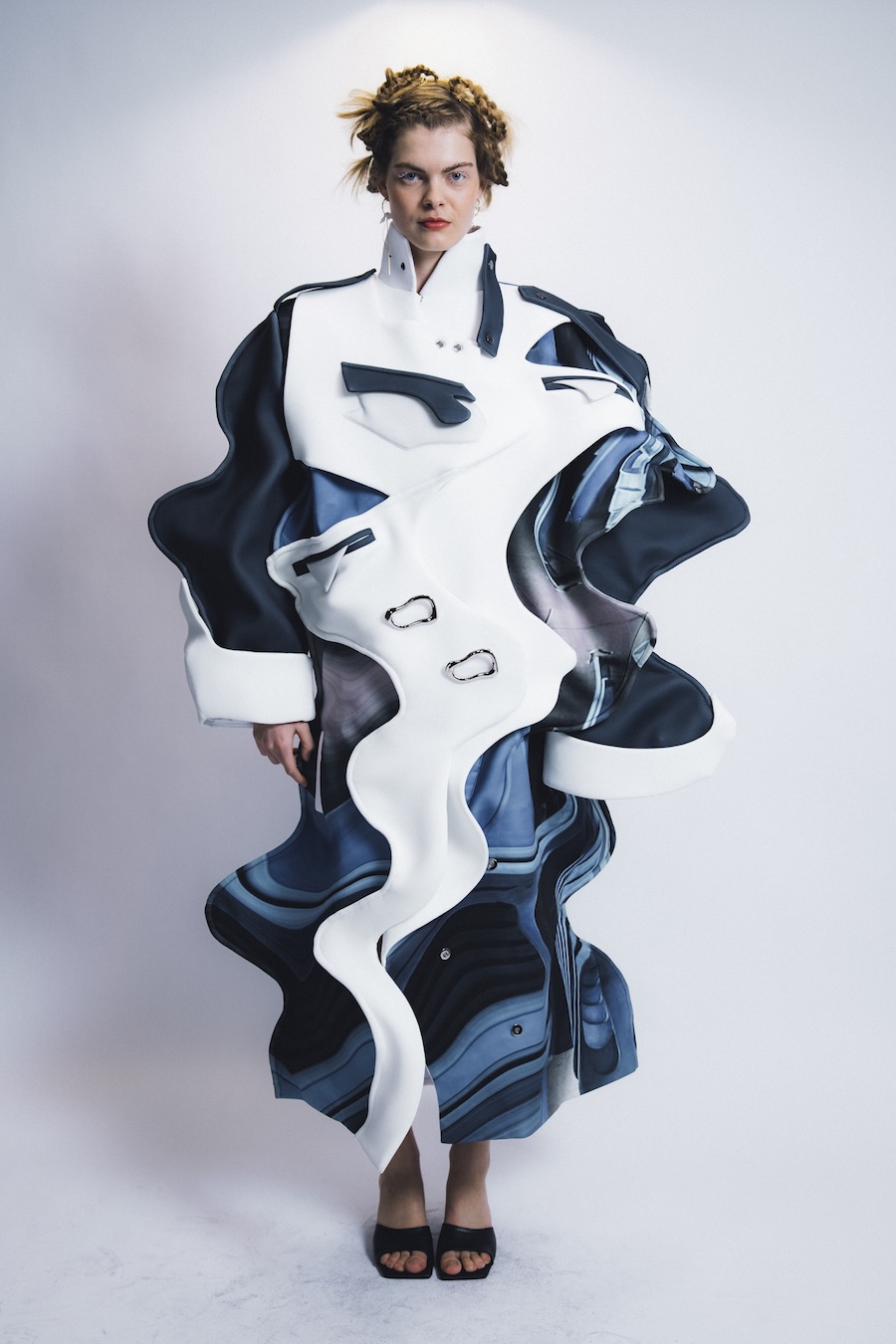 Chu is the poet of the group. Her Liminal Forms collection drifts through black, grey, and white gradients, evoking Taiwanese imagery of the soul’s journey after death. The knits float and dissolve like smoke signals or incense trails, heavy with meaning but light on the body. They’re eerie and elegant, clothes that make you feel like you’re halfway here, halfway in another dimension.