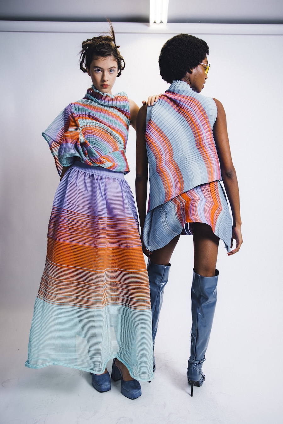 Lin’s Vivid Swirl is a kaleidoscope you can actually wear. Ribbed knits twist and stretch around the body, colour-blocked like a trippy lava lamp. The pieces curve and cling in all the right places, balancing softness and strength so you look like you’re glowing from the inside out. It’s femme, it’s playful, and it knows exactly how to catch the light.