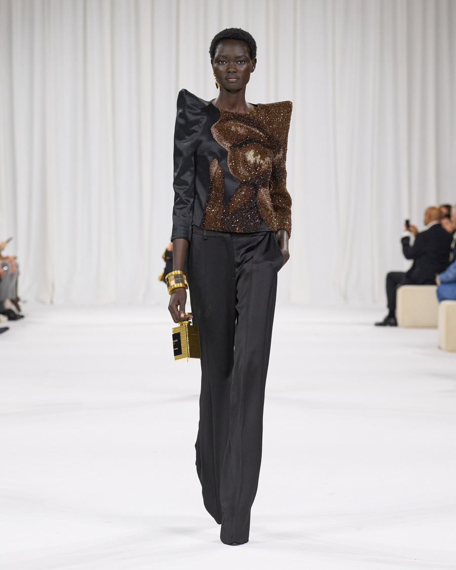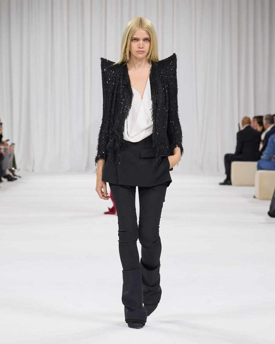 The craftsmanship behind this collection is impeccable. Rousteing and his team have evolved the signature precision cuts and tailoring that Balmain is known for, with powerful shoulders, angular hips, and the innovative trouser-boot design ensuring an unerring silhouette. The intricate embellishments, particularly the pearl patterns and photo-realistic bead creations, are jaw-droppingly beautiful and a testament to the skills of Balmain’s atelier artisans.