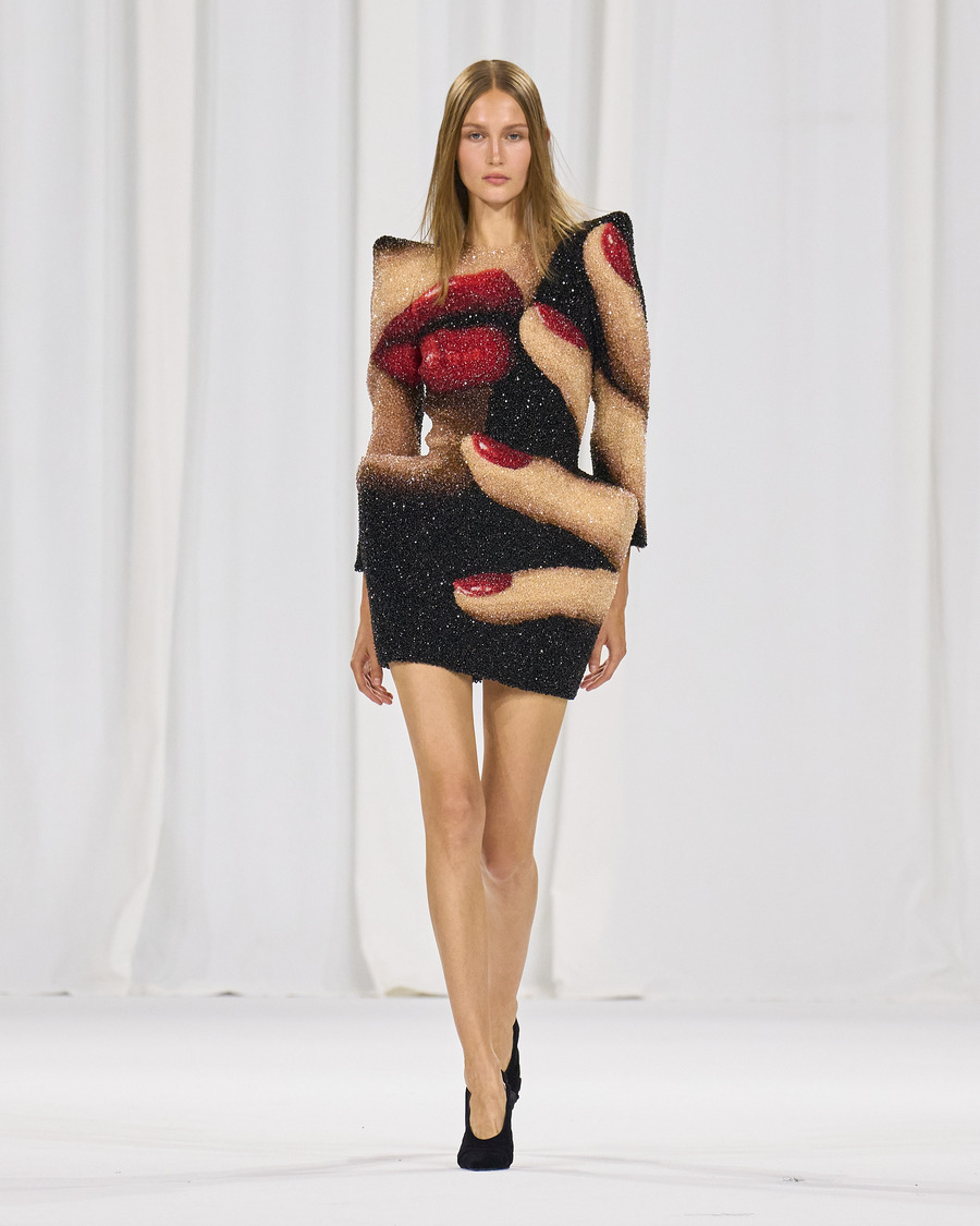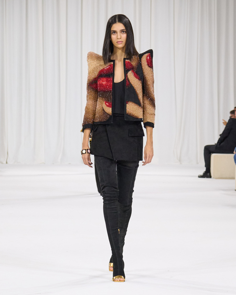 The craftsmanship behind this collection is impeccable. Rousteing and his team have evolved the signature precision cuts and tailoring that Balmain is known for, with powerful shoulders, angular hips, and the innovative trouser-boot design ensuring an unerring silhouette. The intricate embellishments, particularly the pearl patterns and photo-realistic bead creations, are jaw-droppingly beautiful and a testament to the skills of Balmain’s atelier artisans.