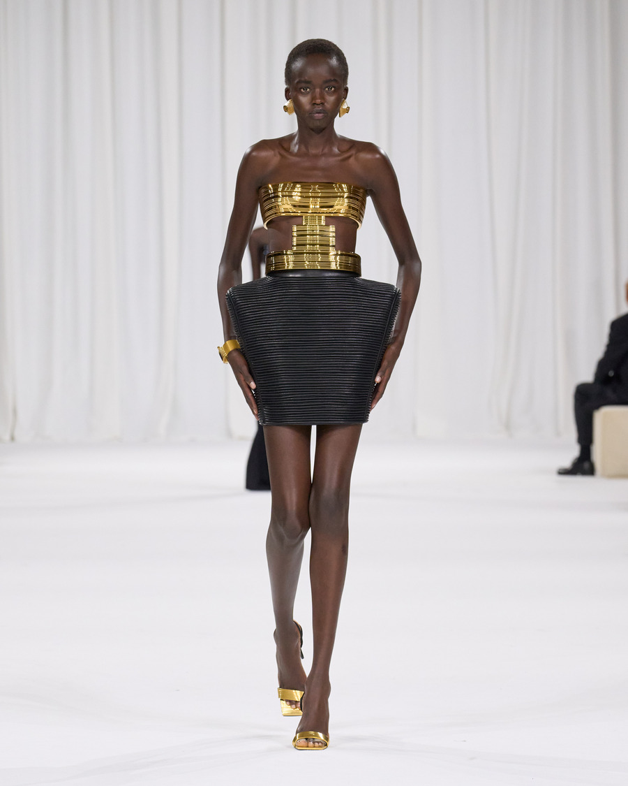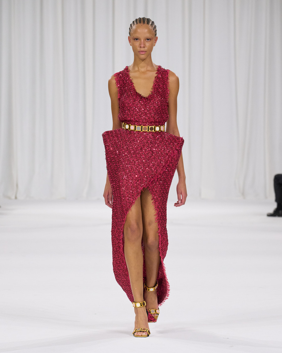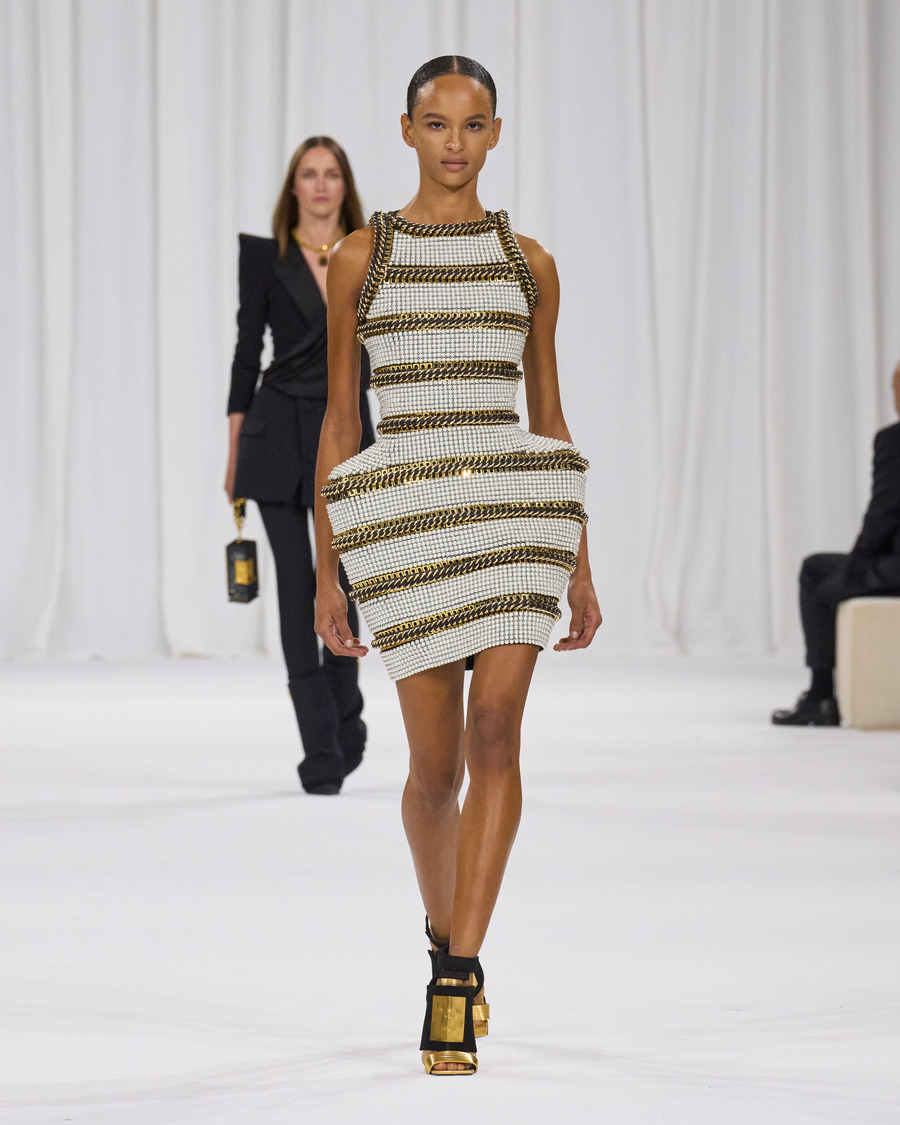 The collection also pays tribute to Balmain’s beauty range, with several designs reflecting the brand’s famous perfume packaging and the diverse palette of the newly launched Balmain Beauty collection. The minimalist silk sheaths in the final runway grouping are particularly striking, beautifully harmonizing the fashion and beauty worlds.