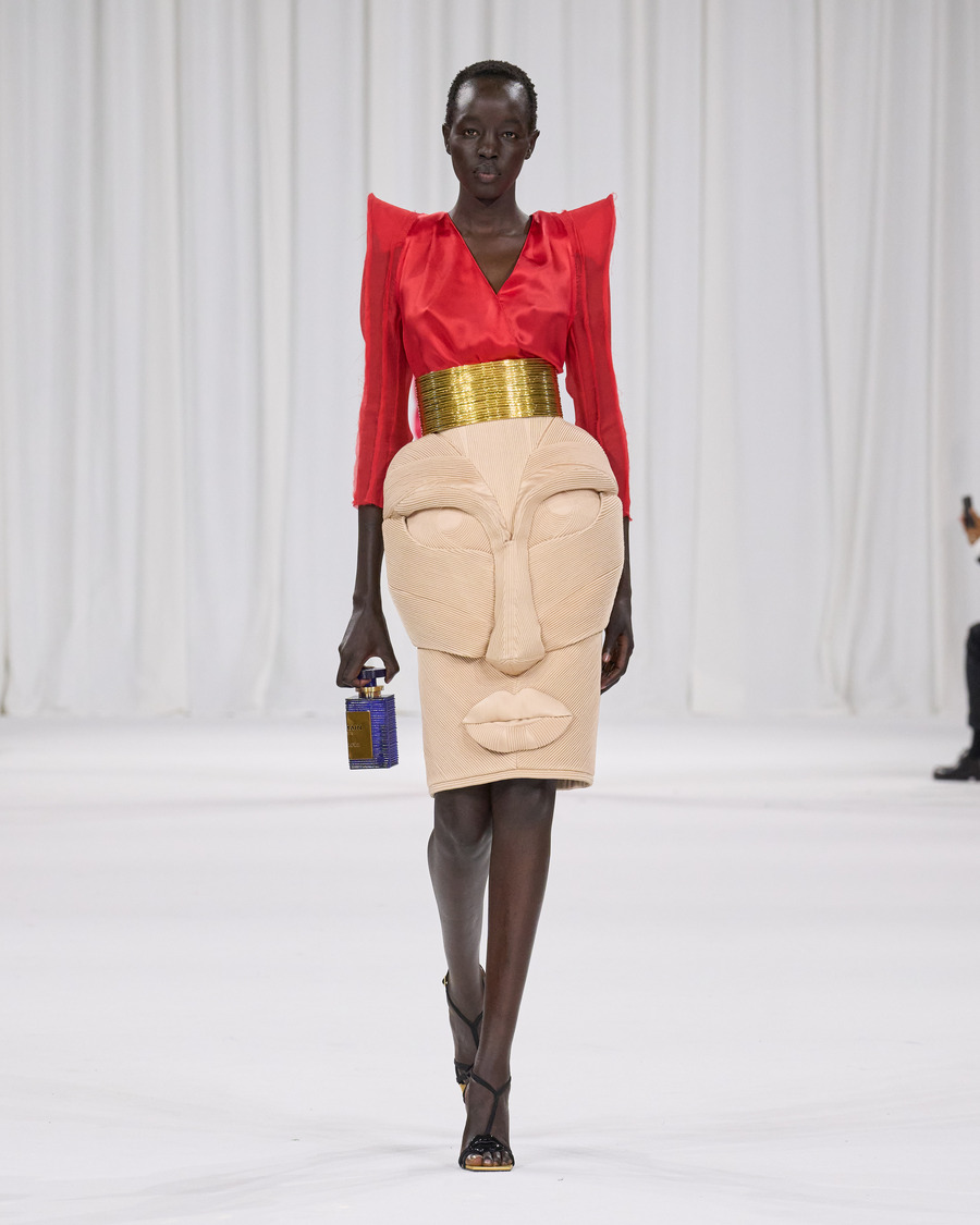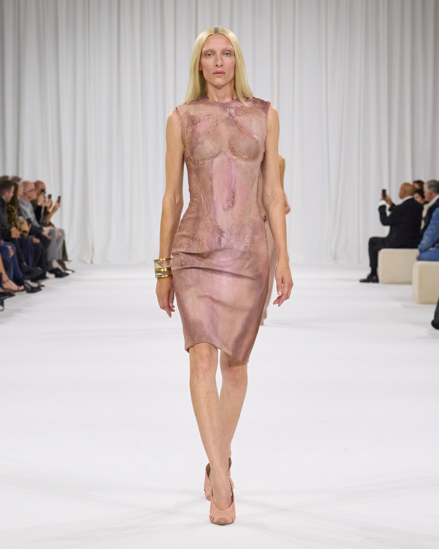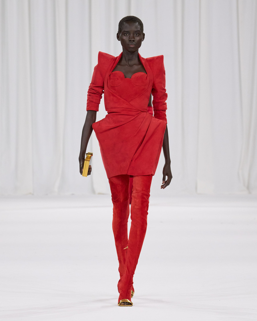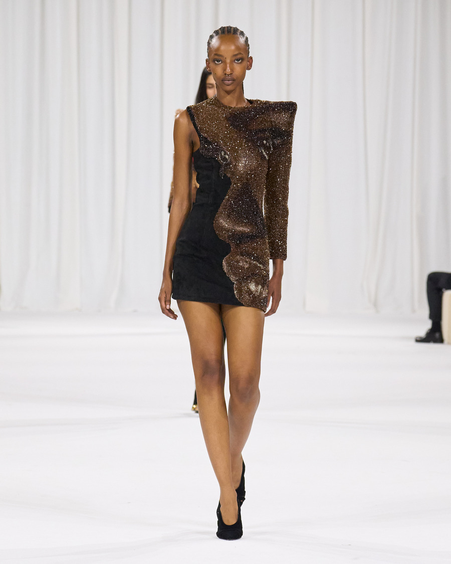 The collection also pays tribute to Balmain’s beauty range, with several designs reflecting the brand’s famous perfume packaging and the diverse palette of the newly launched Balmain Beauty collection. The minimalist silk sheaths in the final runway grouping are particularly striking, beautifully harmonizing the fashion and beauty worlds.