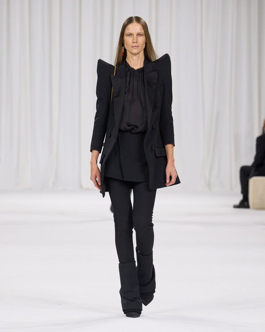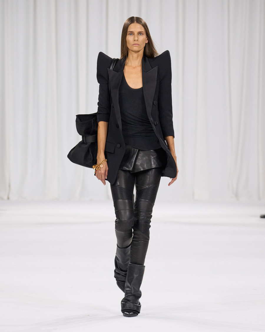 The accessories, particularly the new Anthem bag, caught our eye. These leather masterpieces, inspired by both mid-century couture and contemporary Balmain tailoring, encapsulate the brand’s deep ties with music and popular culture. The wide ceinture detail and the bag’s name itself evoke a sense of confidence and empowerment.