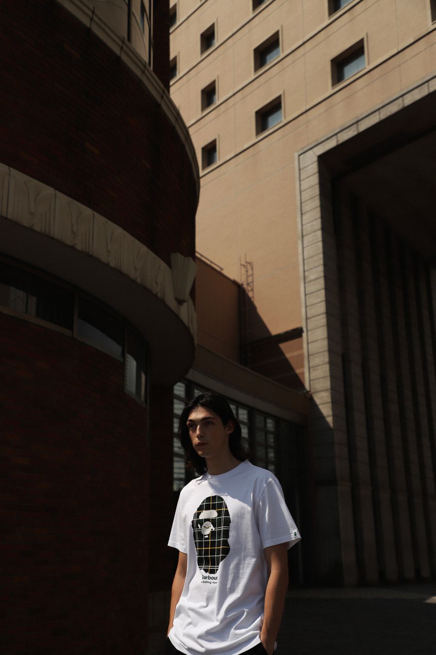 The Barbour BAPE® Tee comes in three colours, Black, White and Burnt Olive – the design features a tartan BAPE® ape head logo.
