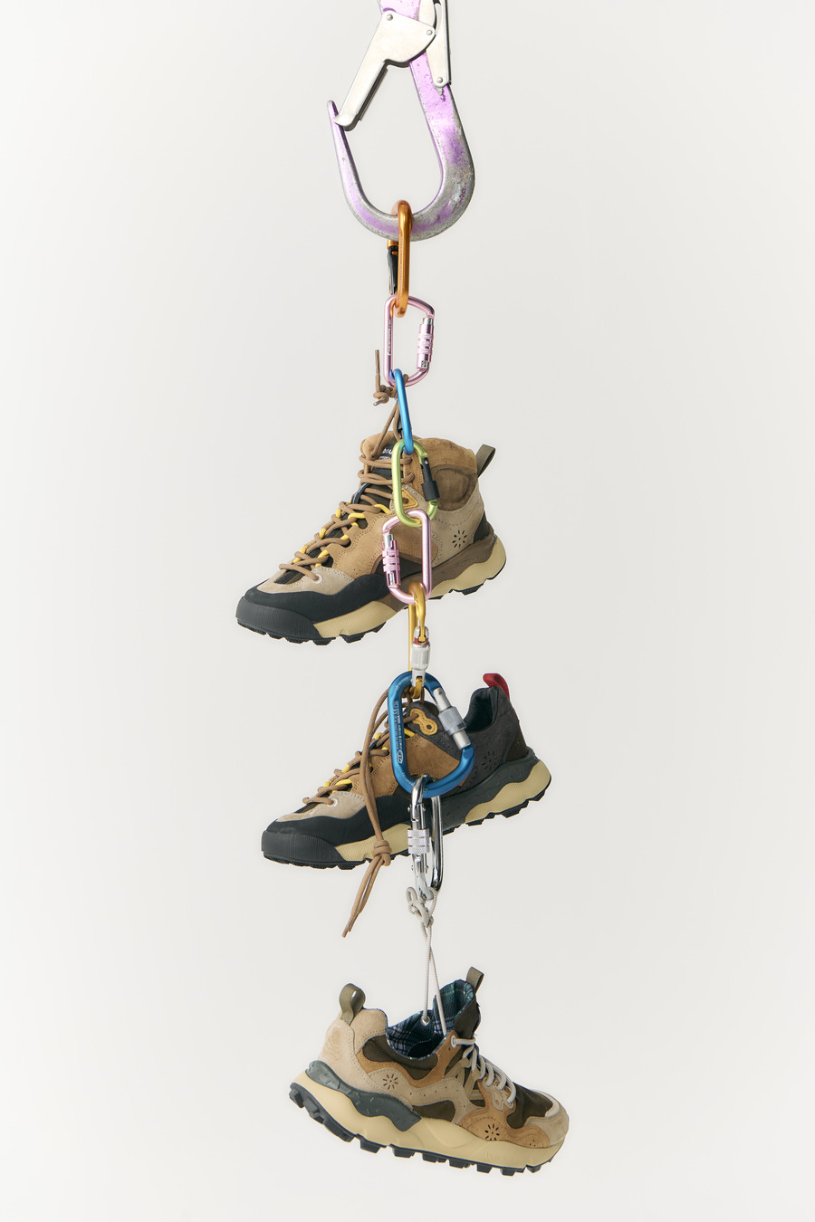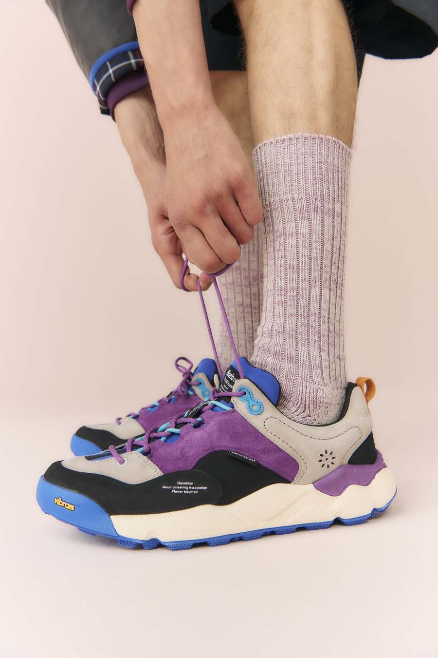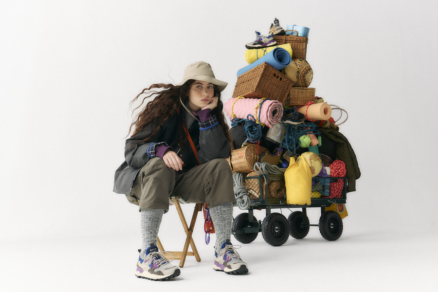 The capsule collection includes a unisex jacket based on Barbour’s classic Transporter Wax Jacket, presented in various bright colour combinations, and three shoe designs that mirror the jacket’s hues. Flower Mountain’s trademark dandelion symbol now adorns the classic tartan-lined jacket as embroidery, becoming part of the Barbour logo. Meanwhile, Flower Mountain’s most practical and technical shoe, the Back Country model, combines suede leather on the upper with waterproof, waxed nylon derived from the jacket.