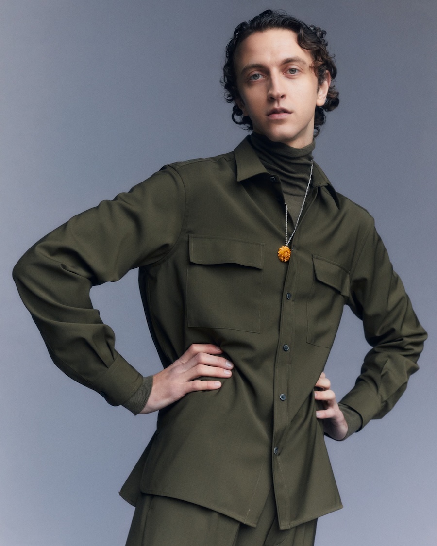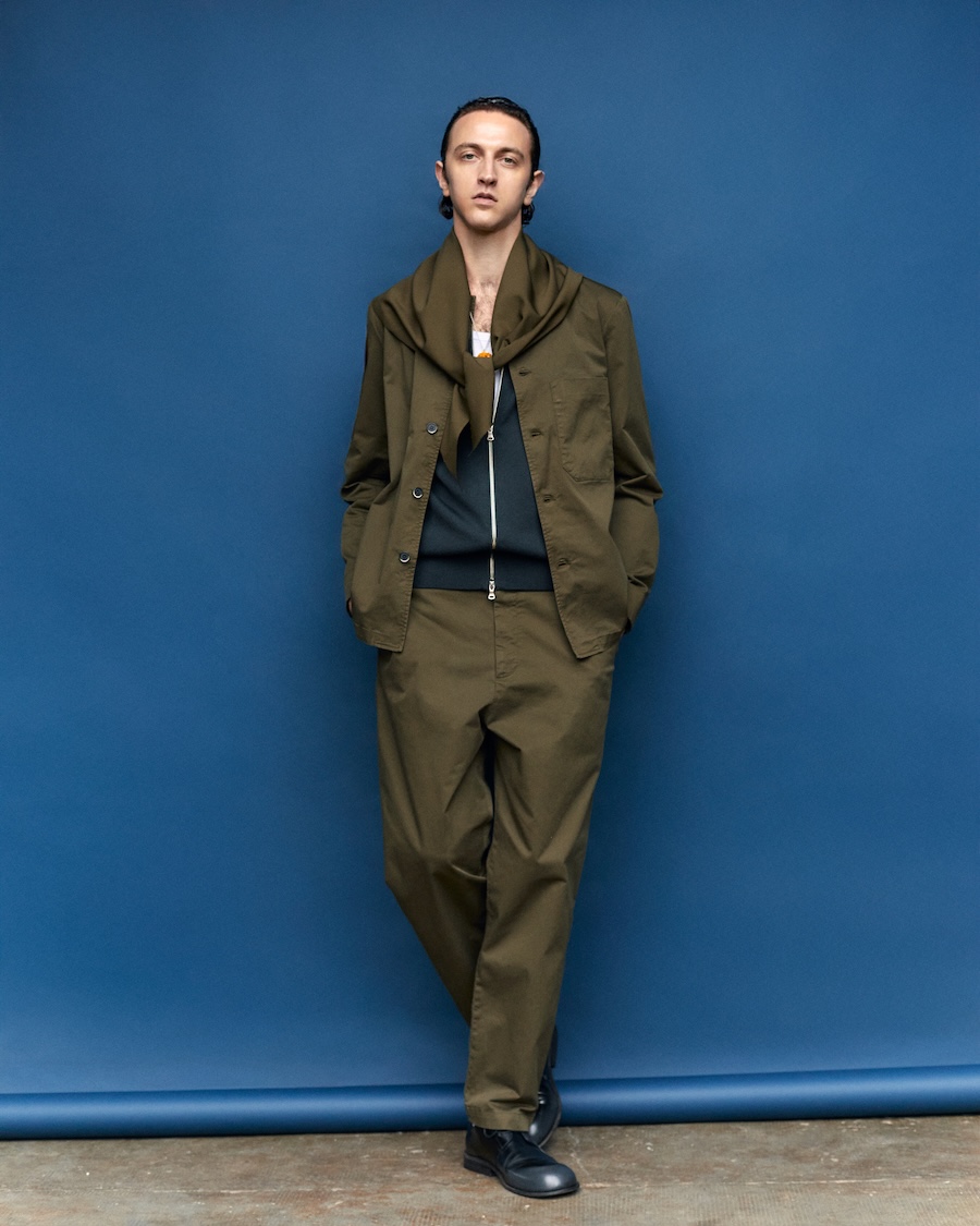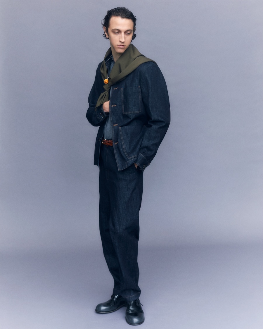 The collection makes a compelling case for suits that embrace both leisure and formal occasions, featuring sartorial blazers paired with overshirts and trousers, reflecting a transversal stylistic attitude. Rich textures such as strongly twisted wool yarns, archival-inspired patterns, and naturally crinkled wools work together to create garments with dimension and lightness. The use of corduroy velvet—dyed with unique fade effects inspired by traditional Venetian craftsmanship- evokes a sense of history while remaining utterly relevant.