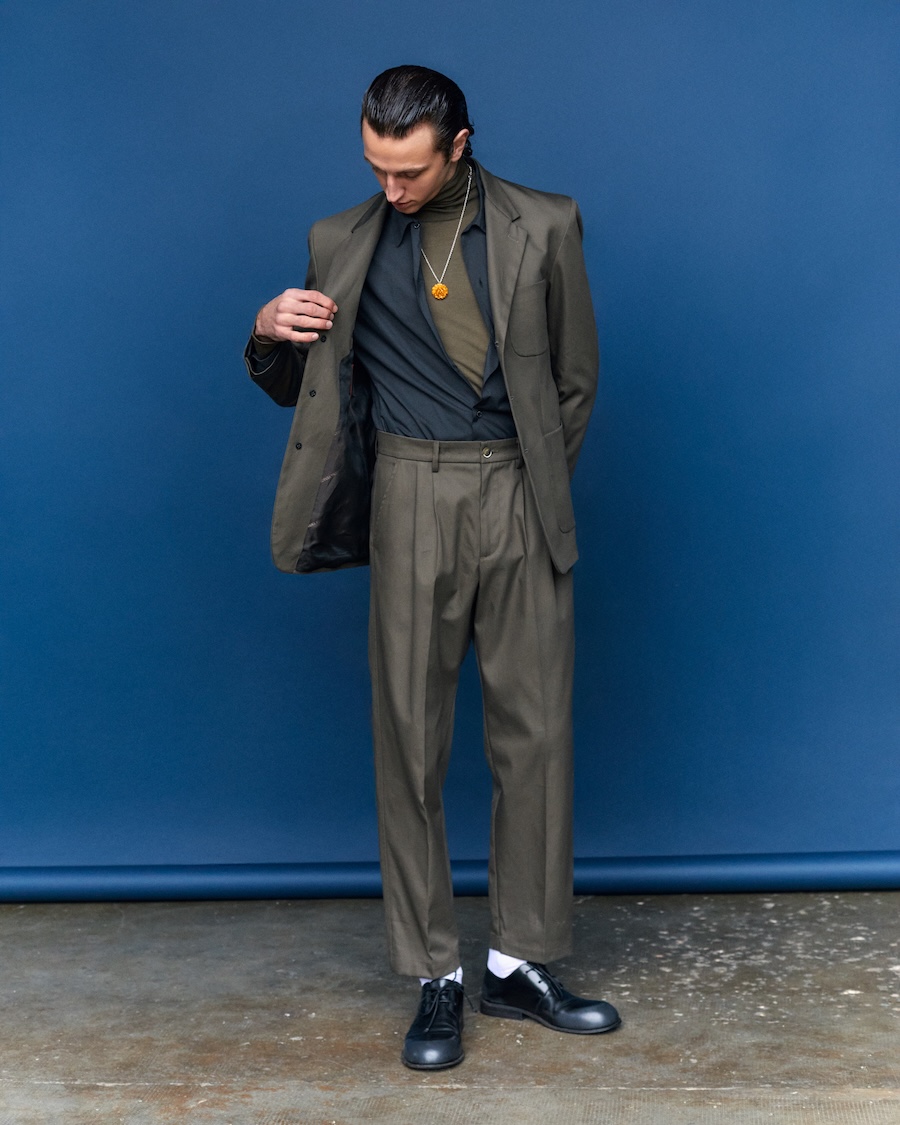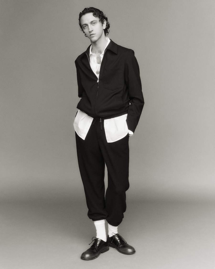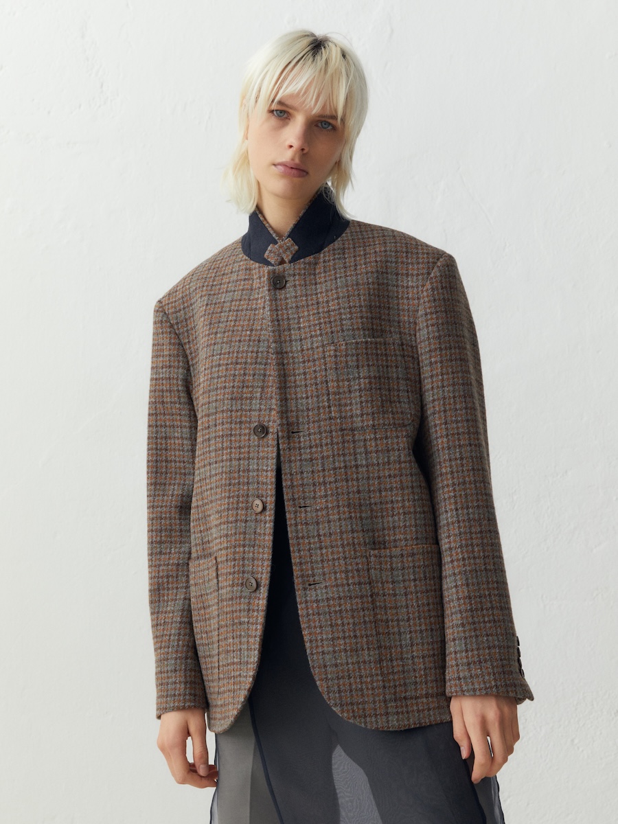 The collection makes a compelling case for suits that embrace both leisure and formal occasions, featuring sartorial blazers paired with overshirts and trousers, reflecting a transversal stylistic attitude. Rich textures such as strongly twisted wool yarns, archival-inspired patterns, and naturally crinkled wools work together to create garments with dimension and lightness. The use of corduroy velvet—dyed with unique fade effects inspired by traditional Venetian craftsmanship- evokes a sense of history while remaining utterly relevant.
