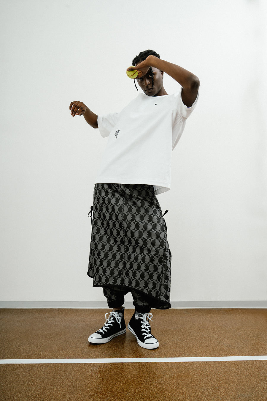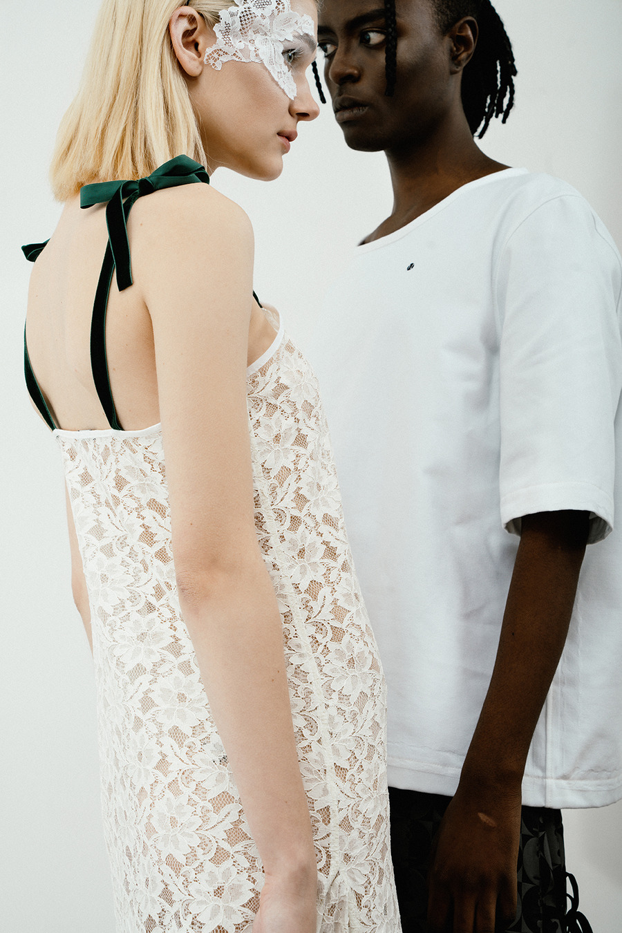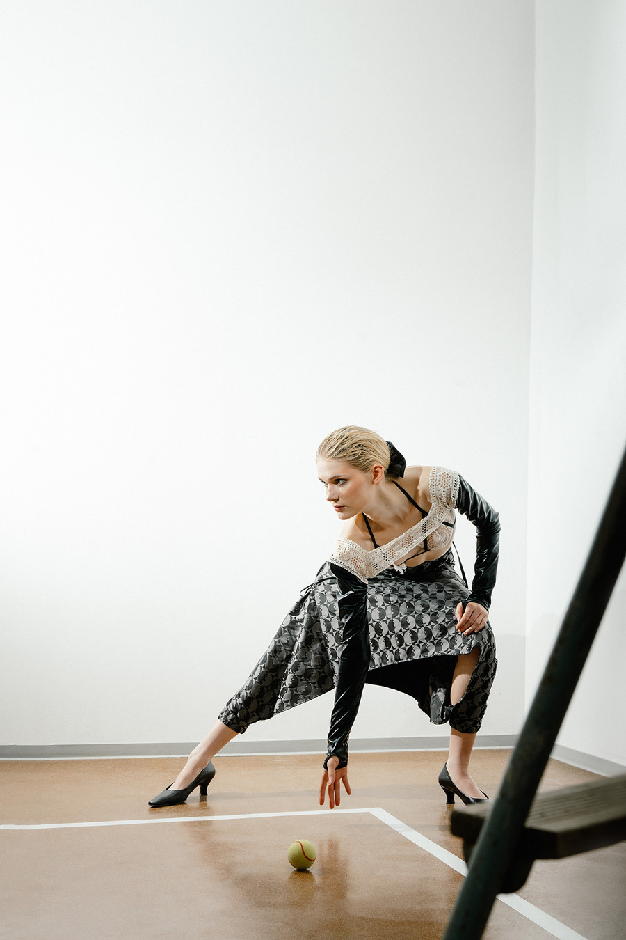 “The Spherical Human Philosophy by Plato deals with love, attraction relationships and sexuality – Bedroom Tennis. It is the idea that, at the beginning of mankind, we were spherical beings. Perfect self-sufficient units. It describes why we fall in love, and why we long for proximity. Because: When people, due to their perfectly spherical shape, became too powerful, the gods split them into two halves. Since then they have been looking – we are looking – for our other half and hoping to be able to form a sphere again. Sportive elements are combined with delicate materials. Precious, pre-loved fabrics tell a story and create unique garments.”