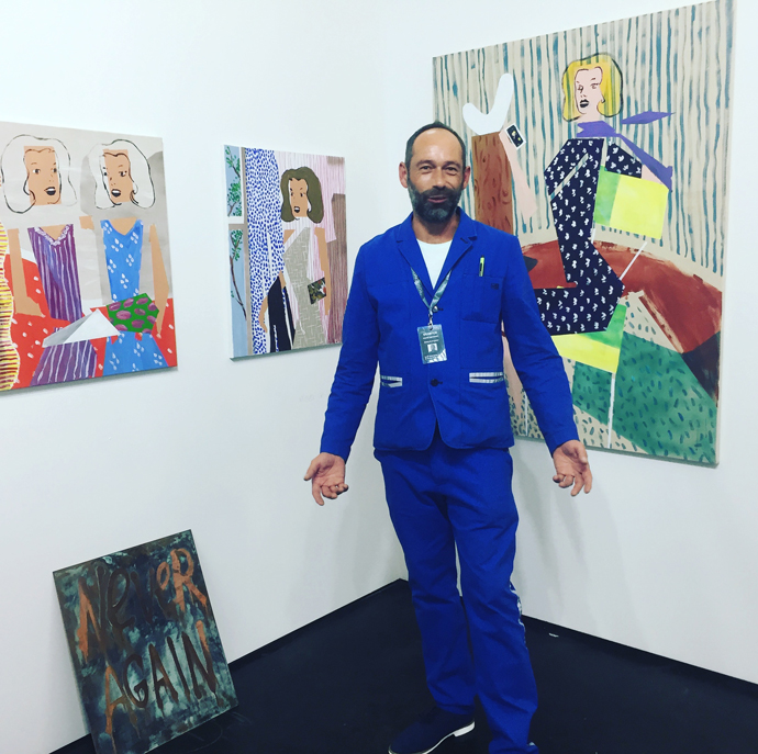 Goes to the lovely Michel Castaignet. I’ve known his work for a few years, and he’s been constantly producing exciting paintings. This new body of work is focused on ironic Barbie interiors that remind me of « Just what is it that makes today’s homes so different, so appealing? » from Richard Hamilton as well as the video clip from « I want to Break Free » by Queen. That’s a personal view, and you might want to check with Michel if I’m aiming even close to what he wants to say. Represented by the Gallery Nivet-Carzon, the artist was wearing a brilliant blue suit that complimented his work in a sparkly way.