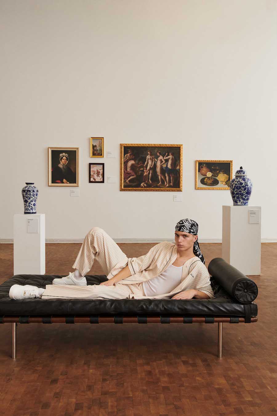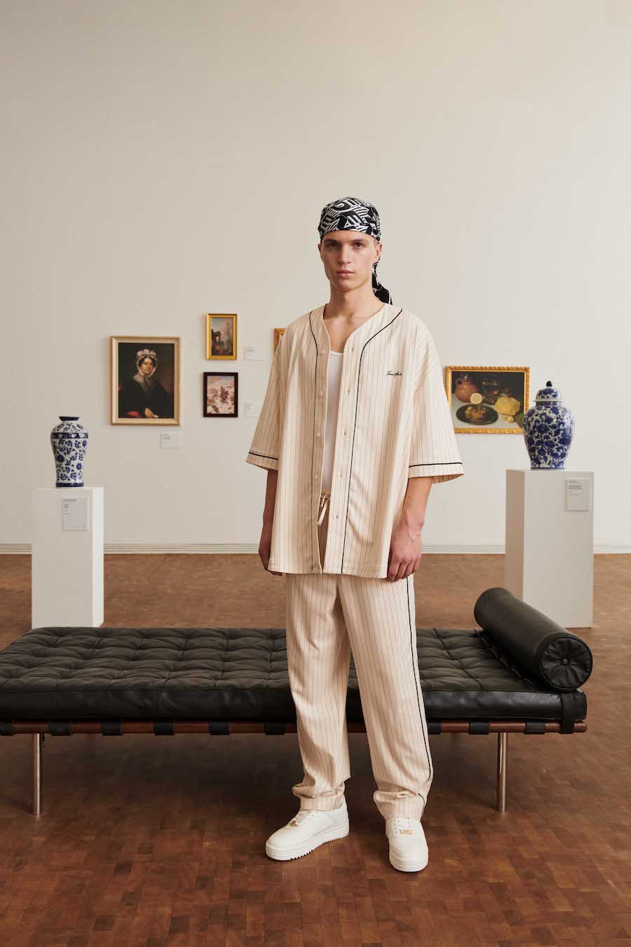 Stripe print has become the base of the looks and is combined with other sports-inspired garments in the form of classic college-style long-sleeved polo shirts. All-over monogram print with lettering is also present in a cotton jacket and trousers set that reminds us of the most vibrant style of the streets of New York.