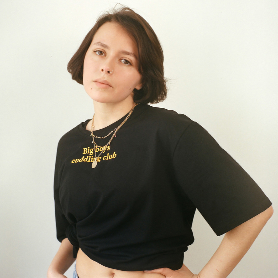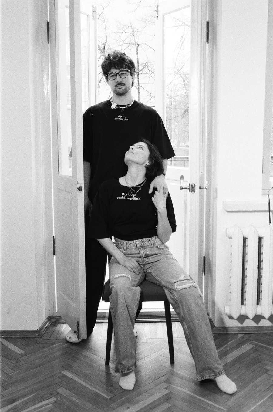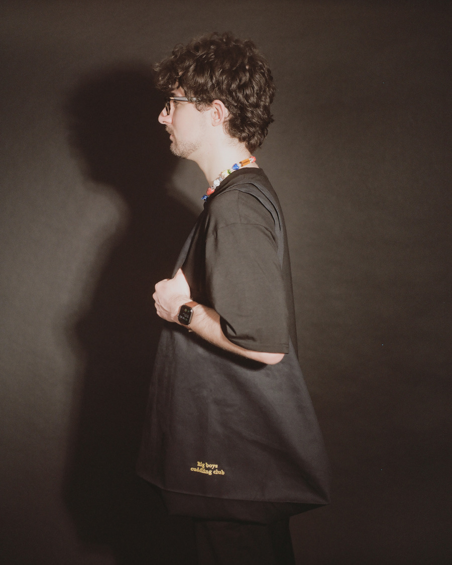 The brand’s flagship product is an oversized black tee with yellow embroidery that reads “Big boys cuddling club.” The tee is a statement piece that embodies the brand’s ethos of self-expression, self-discovery, and self-love. The colour combination of black and yellow was chosen to create a vintage, old-movie feel while also having an industrial edge. The drop also includes a large tote bag with embroidery, all made in Ukraine.