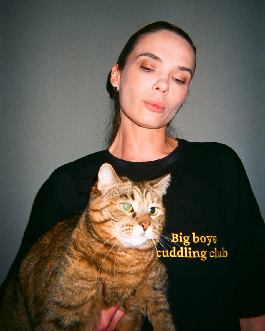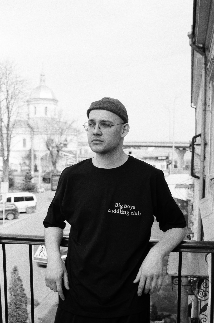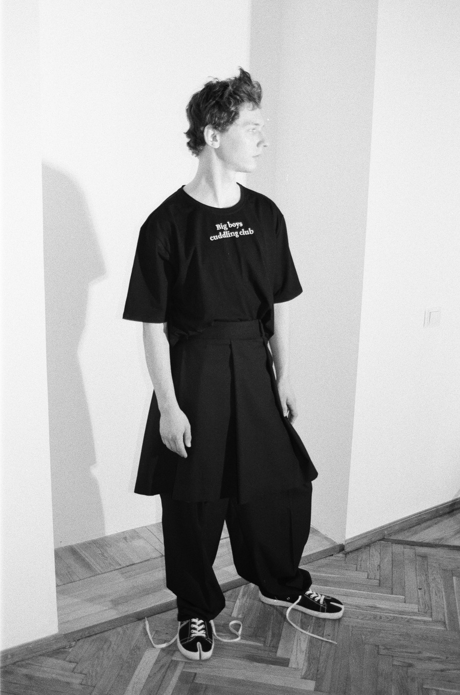 The brand’s flagship product is an oversized black tee with yellow embroidery that reads “Big boys cuddling club.” The tee is a statement piece that embodies the brand’s ethos of self-expression, self-discovery, and self-love. The colour combination of black and yellow was chosen to create a vintage, old-movie feel while also having an industrial edge. The drop also includes a large tote bag with embroidery, all made in Ukraine.
