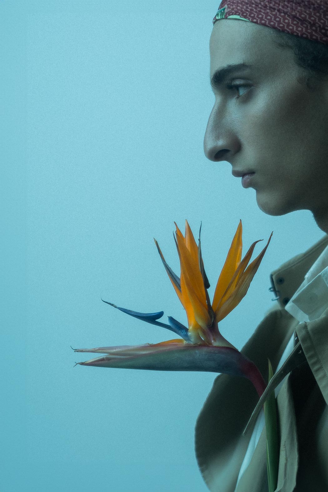“Our editorial shows Mahmoud with a flower, the „Bird of Paradise“, or so-called Strelitzia, which is known for its special shape and colour. We shot this in the heart of Cairo, on the so-called Nile island Zamalek. Cairo is the largest city in the Arab world, with its sister city Gizeh home to around 20 million people. To find a green paradise you need to know the places, like this garden, hidden behind walls, buildings and streets with lots of traffic. But if you find them, you can wind down and enjoy all the botanical variety that is flourishing around the Nile Delta.