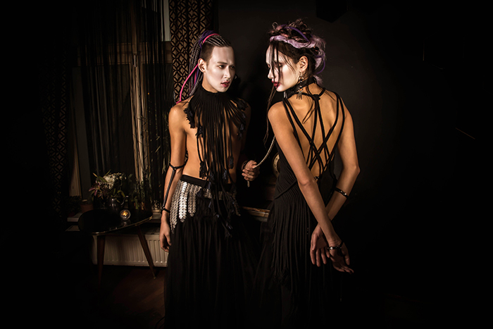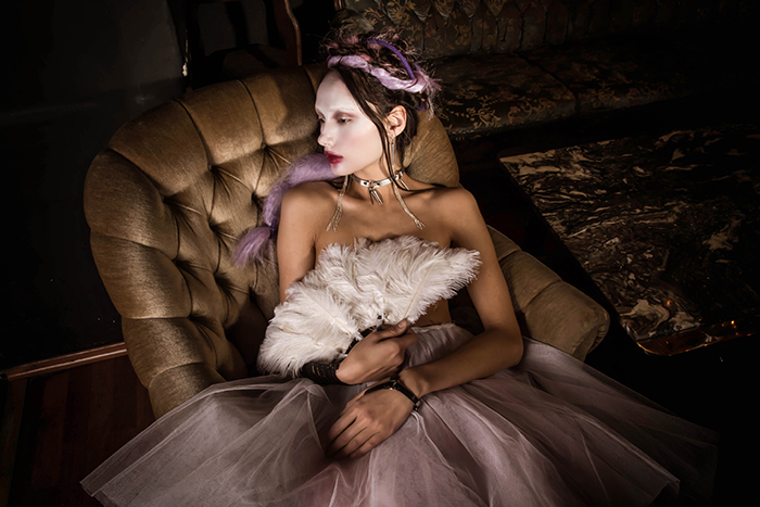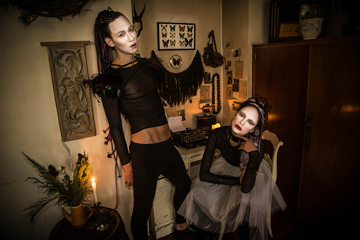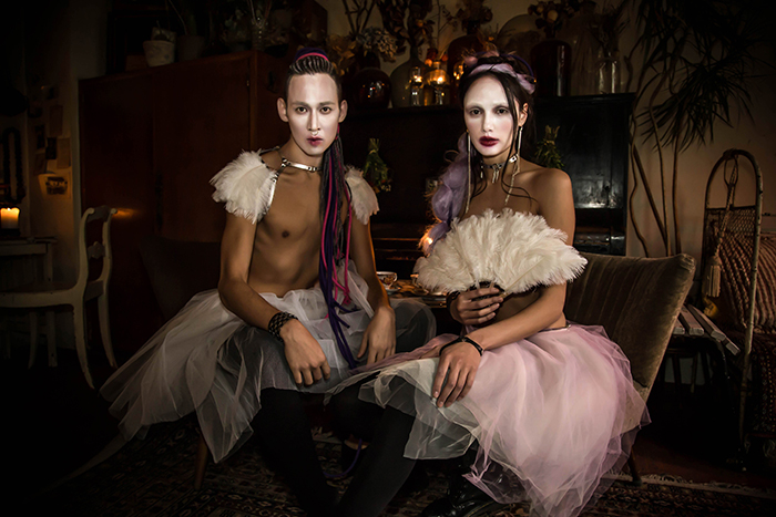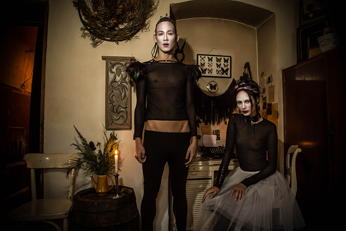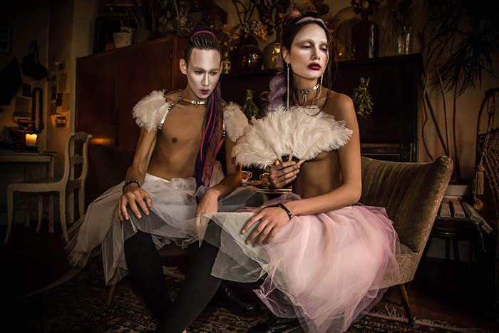 A KALTBLUT exclusive fashion editorial. Photography and styling by Tina Dubrovsky. Models are Charmie Pfeffer and Ben Okamoto. Hair and make up by Tatiana Ashakova. Clothes and accessories by Tineola and Beretkah. Location: Vögelchen Bar in Berlin.