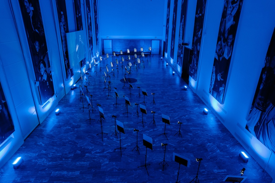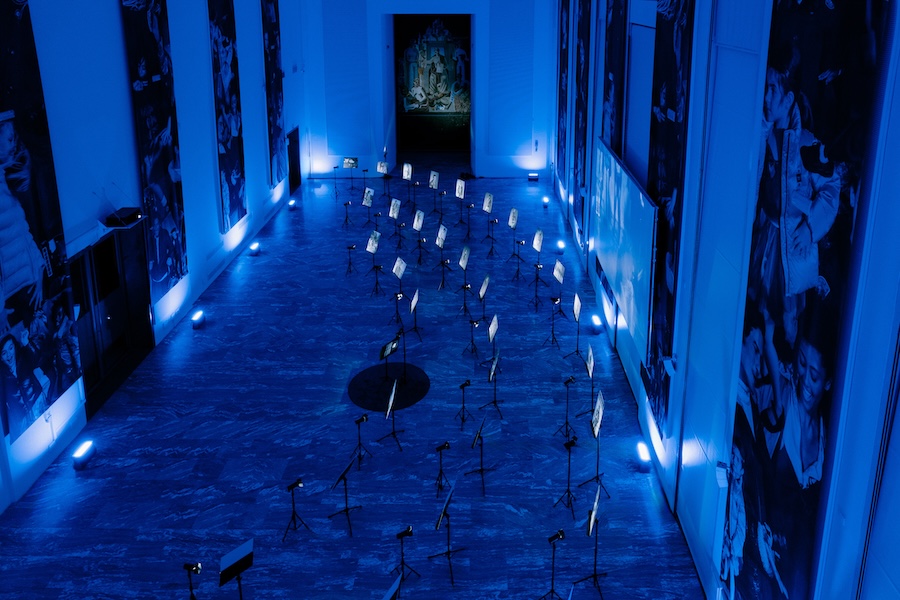 The exhibition at the Salone d’Onore offered an immersive experience: music stands, photographs, and sound impulses guided visitors along an evocative blue pathway, an orchestral movement that made visible the history and identity of Blauer within a collective cultural and artistic narrative.