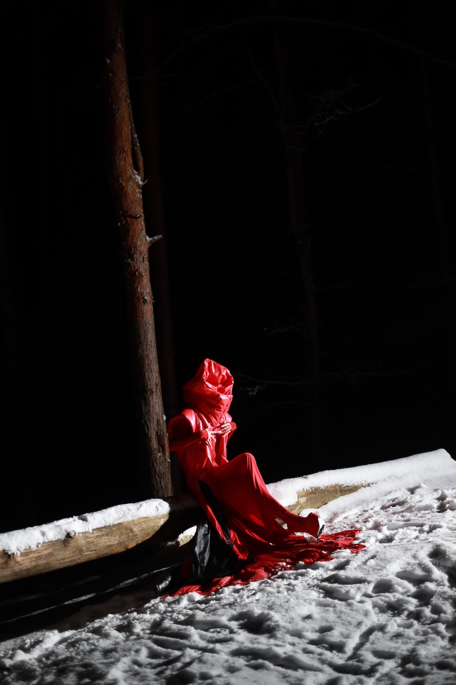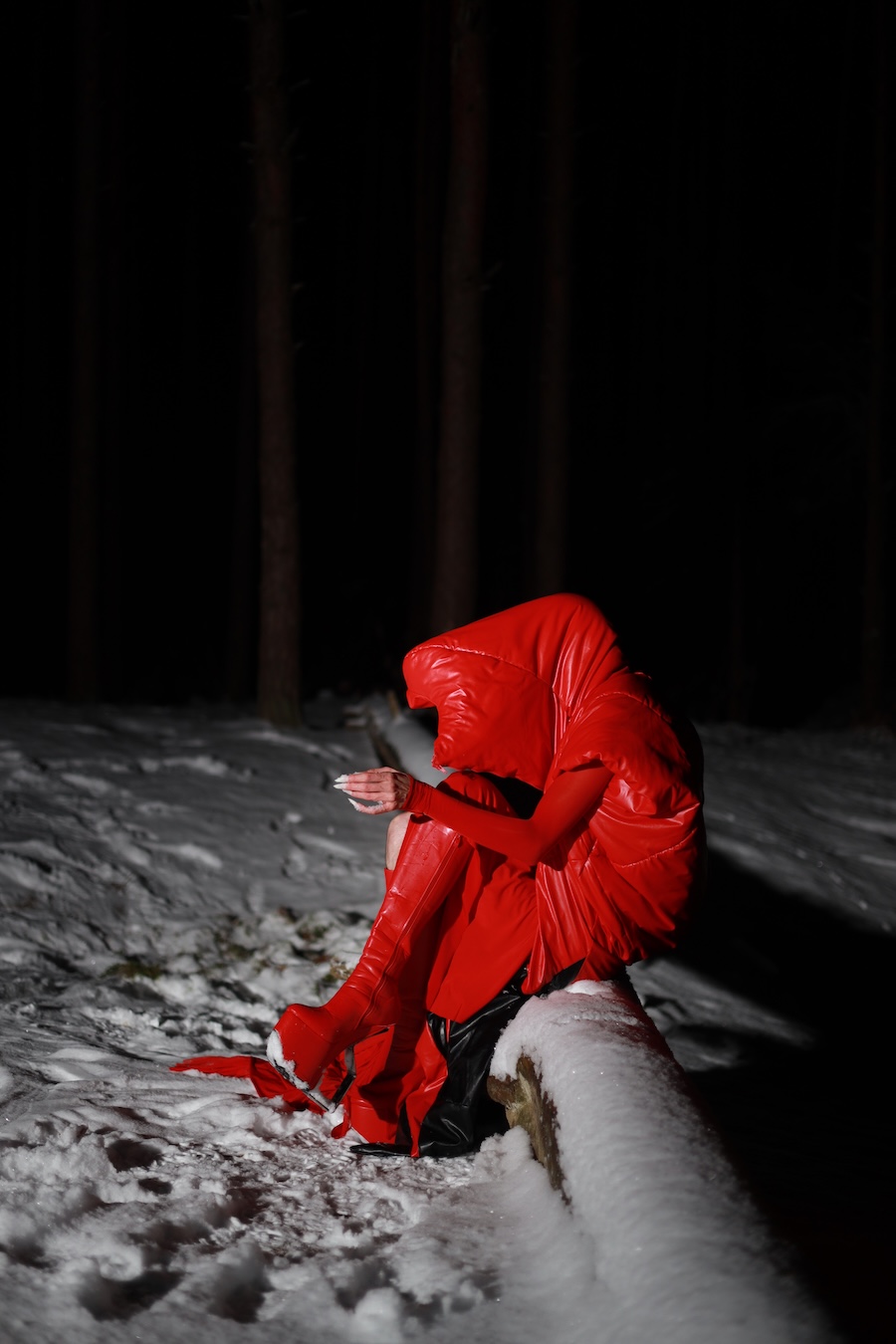 The vision is beautifully captured through the lens of Berlin-based photographer and filmmaker Jessica Taylor, who skillfully translates the raw energy of the live performance into a cinematic experience. Taylor’s artistry preserves not just the fleeting moments of performance but also the atmospheric essence of the environment, crafting a poignant dialogue between the evolving body, sculptural garments, and the snow-blanketed surroundings. Partnering with Polish Berlin-based photographer Diana Shuleshnyova, the team enhances the visual language of “Blood Flower Bloom,” offering still imagery that resonates with the visceral struggles between fabric, skin, and the surroundings.
